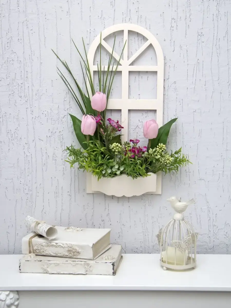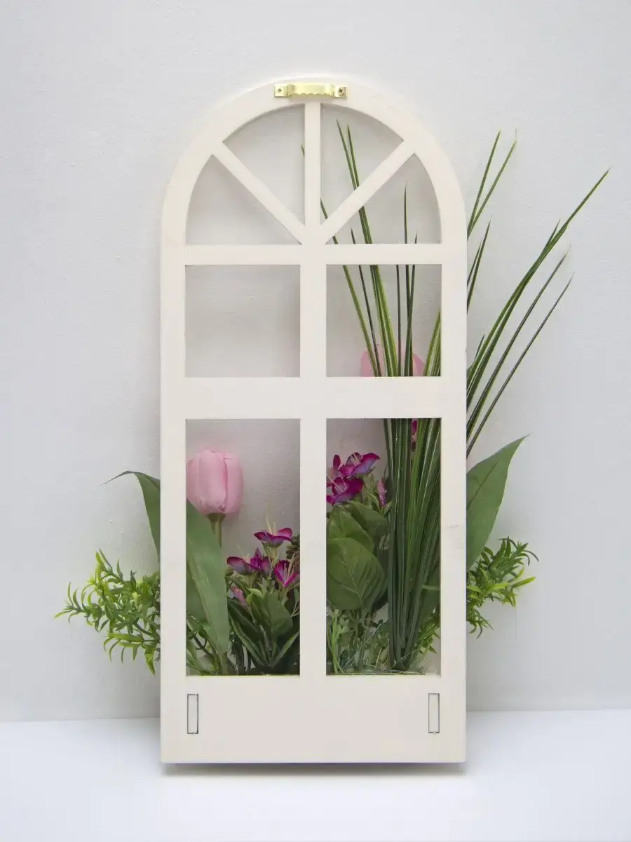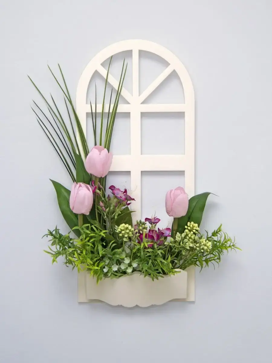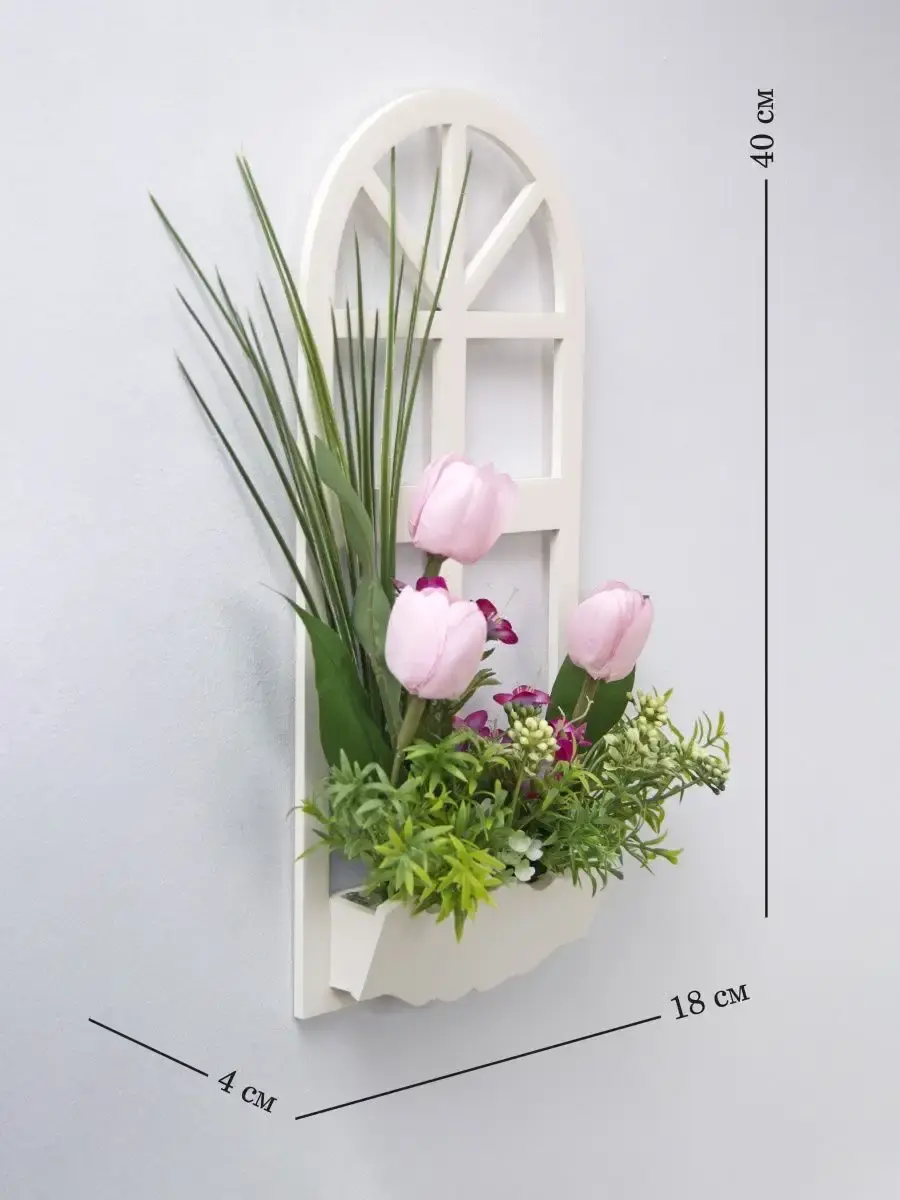 Украшение настенное для интерьера с искусственными интерьерными цветами . Композиция настенная в деревянном кашпо-окно с цветами, размер фальш-окна 18*40см. Крепление на зубчатый крепеж , саморез для стены в комплекте. Отличное панно на стену к зеркалу, в прихожей, ванной или для кухни, где живым цветам недостаточно света. Декоративные панно всегда будут радовать и добавлять уюта в доме. Прекрасный подарок для дома, дачи или салона красоты. По желанию самостоятельно можно дополнить светодиодными нитями (светодиодной гирляндой). Уход : обдуть феном, протирать влажной тканью , обработать антистатиком. Крепление для стены в комплекте.