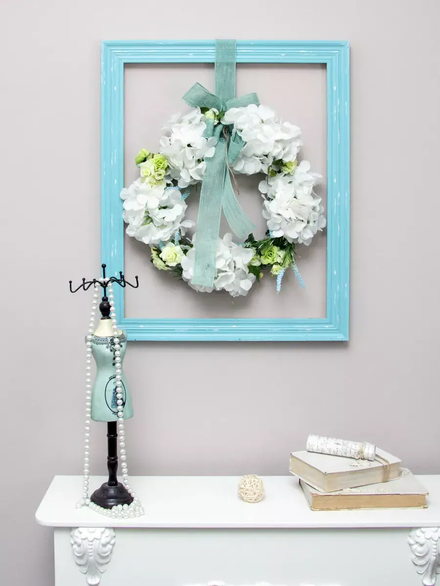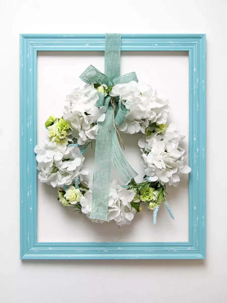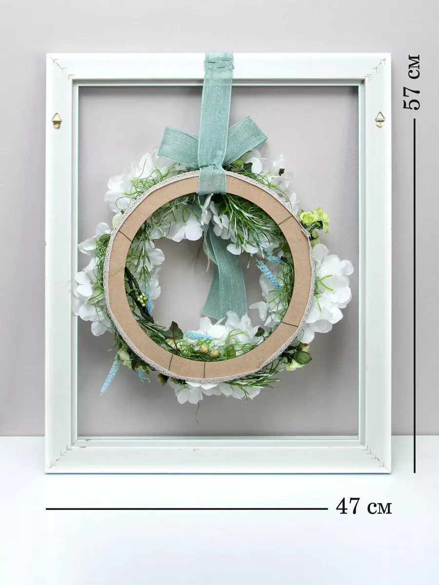 Авторская настенная композиция из интерьерных цветов в багетной раме. Рама из широкого багета (полиуретан) под состаренное дерево обрамляет венок из гортензий с широким бантом. Настенное панно для весеннего настроения, пасхальной композиции или украшения стен в кафе, ресторане. Размер рамы 47*57 см. В комплекте шуруп с дюбелем и зубчатый крепеж на раме. Отличное украшение к винтажному зеркалу, коллекции картин с цветами или в прихожей, где живым цветам недостаточно света. Панно долго будет радовать и добавлять уюта в дом.