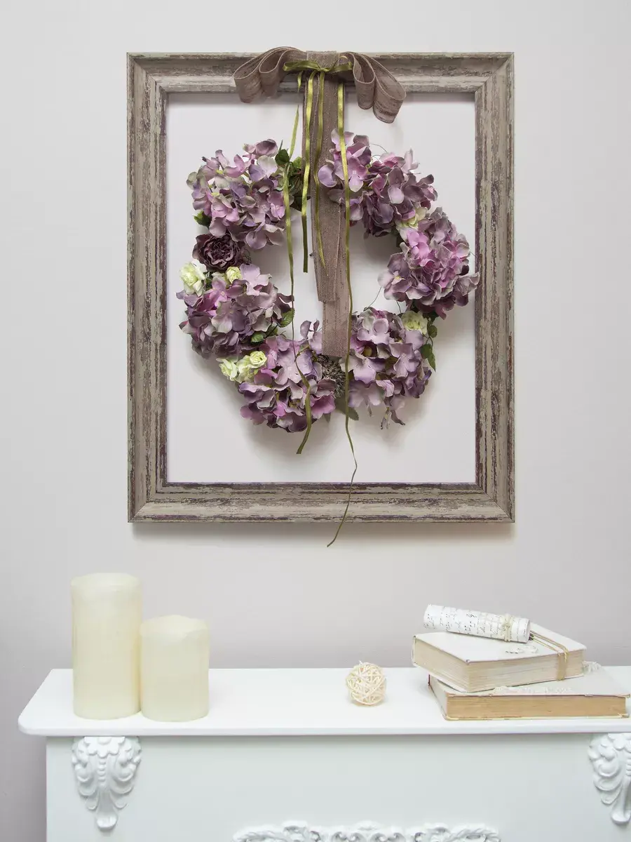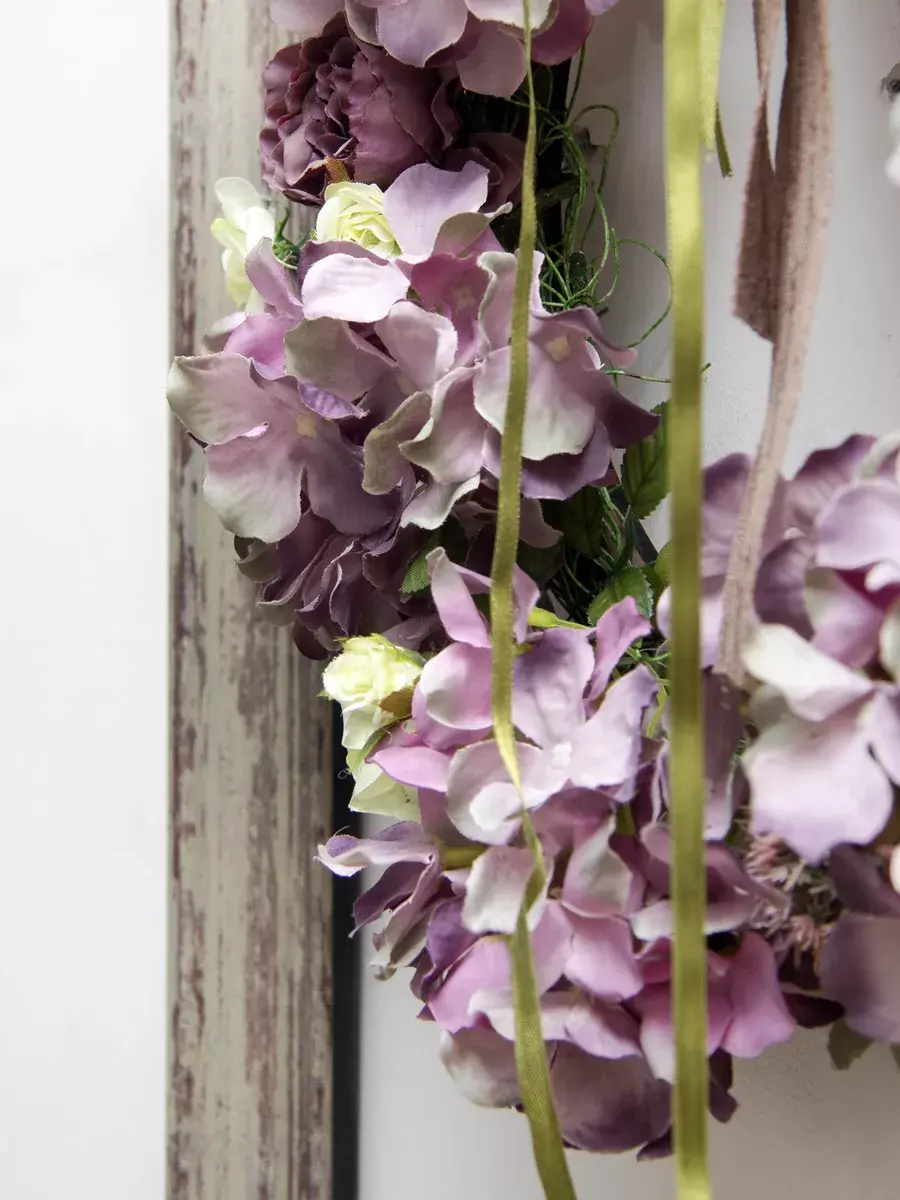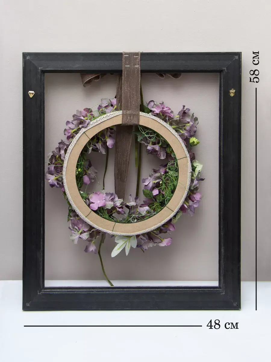 Авторская настенная композиция из интерьерных цветов в багетной раме. Рама из широкого багета (полиуретан) под состаренное дерево обрамляет венок из гортензий с широким бантом. Настенное панно для весеннего настроения, пасхальной композиции или украшения стен в кафе, ресторане. Размер рамы 48*58 см. В комплекте шуруп с дюбелем и зубчатый крепеж на раме. Отличное украшение к винтажному зеркалу, коллекции картин с цветами или в прихожей, где живым цветам недостаточно света. Панно долго будет радовать и добавлять уюта в дом.