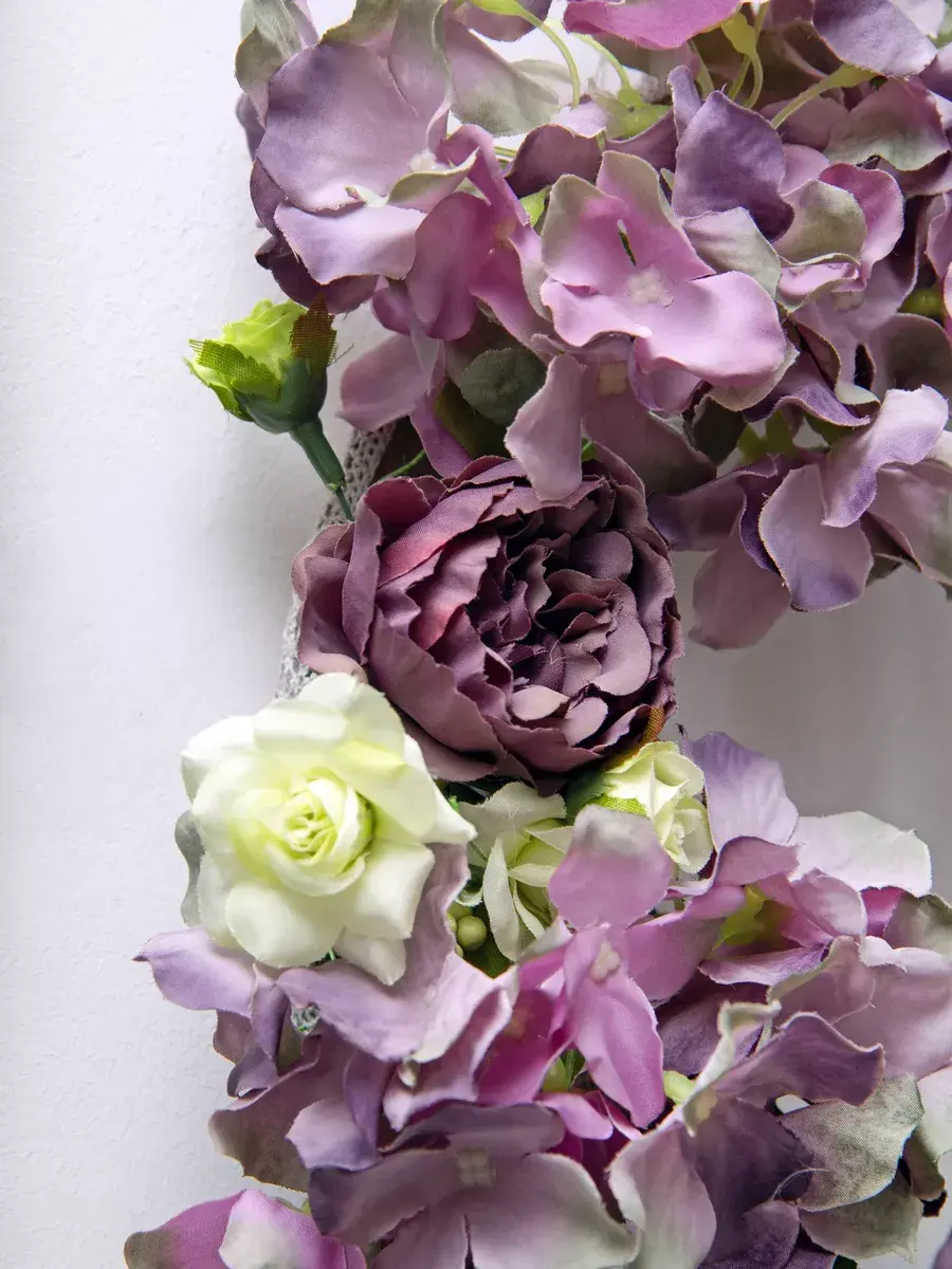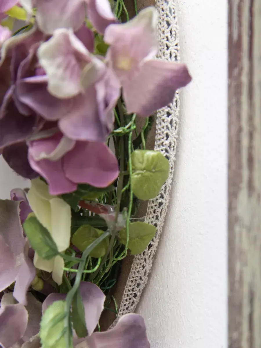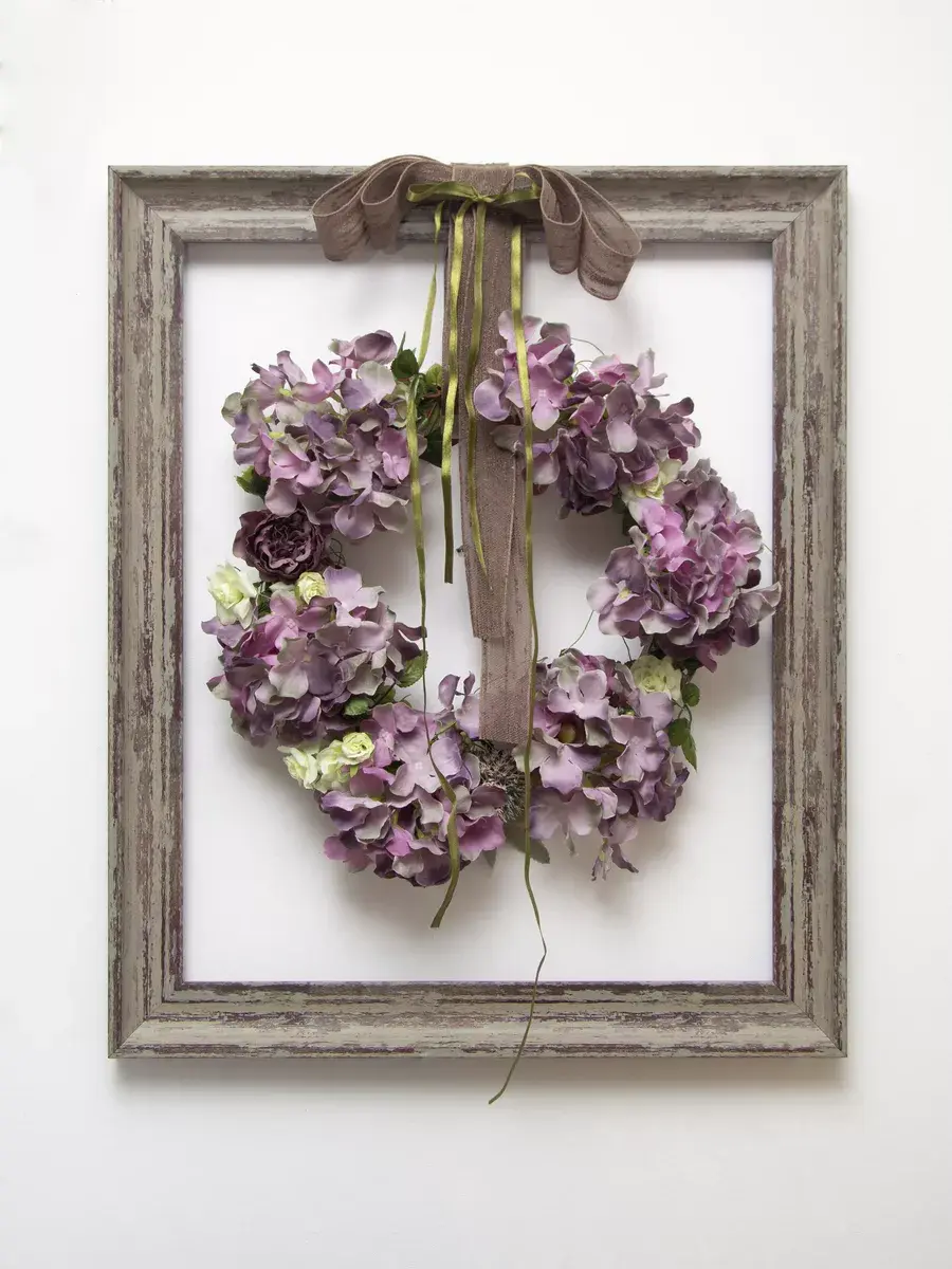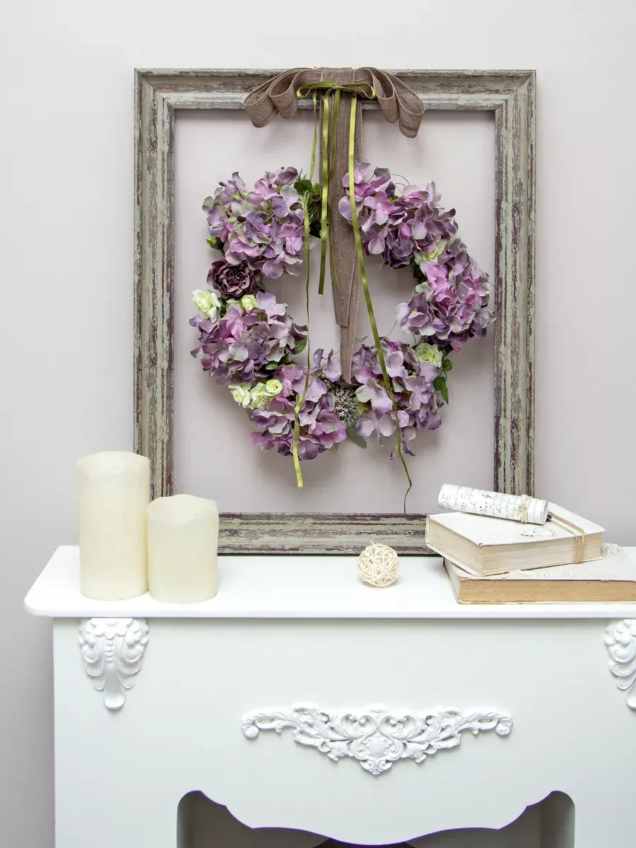 Авторская настенная композиция из интерьерных цветов в багетной раме. Рама из широкого багета (полиуретан) под состаренное дерево обрамляет венок из гортензий с широким бантом. Настенное панно для весеннего настроения, пасхальной композиции или украшения стен в кафе, ресторане. Размер рамы 48*58 см. В комплекте шуруп с дюбелем и зубчатый крепеж на раме. Отличное украшение к винтажному зеркалу, коллекции картин с цветами или в прихожей, где живым цветам недостаточно света. Панно долго будет радовать и добавлять уюта в дом.