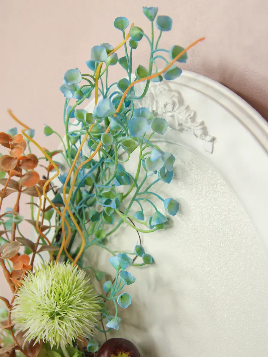 Небольшое декоративное панно на овальной деревянной раме с лепниной с искусственными цветами. Придаст легкости и настроения любому интерьеру. Станет прекрасным дополнением к зеркалу или фотографиям.Размер основы 27*37 см. Размер композиции 45*31 см.