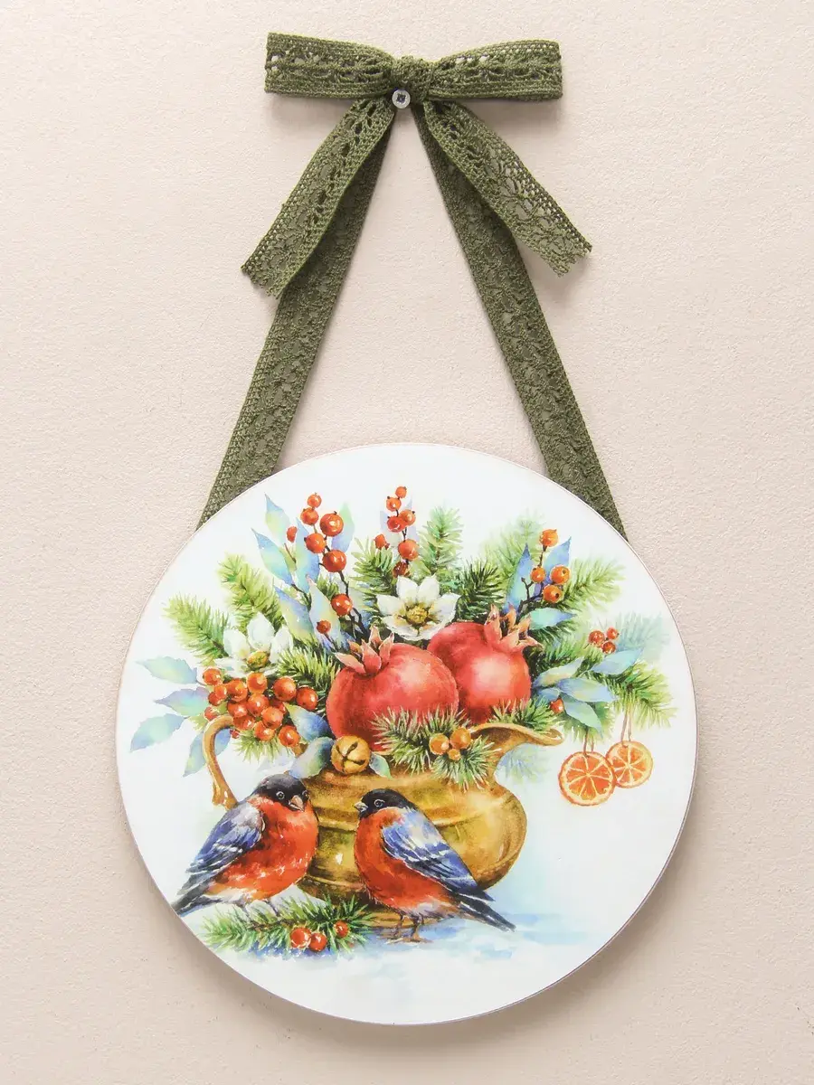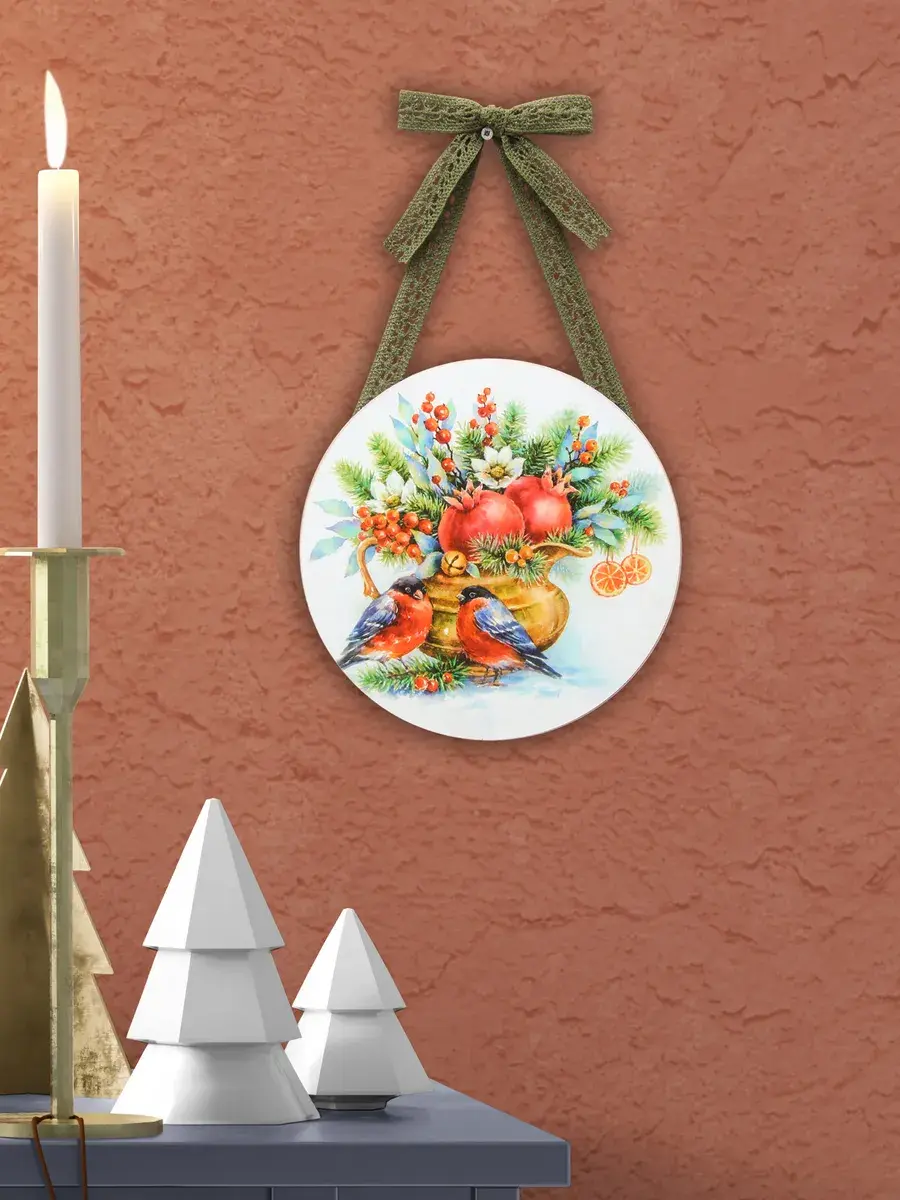 Небольшое настенное панно в рождественском стиле подарит вашему дому уюта и тепла, создаст праздничное настроение, добавит предвкушение новогодних хлопот и ожидание чуда. Нежное кружево, как будто связанное бабушкой, придает нашим панно домашности и уютности. Панно станет прекрасным подарком для родных и близких. Отлично впишится в интерьер кухни, спальни, прихожей, гостиной. Изготовлено из МДФ 10 мм, печать на бумаге, лиминиция для защиты изображения. Диаметр панно 18 см