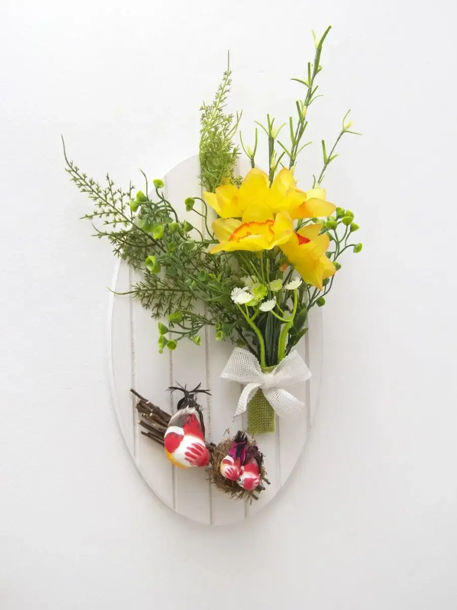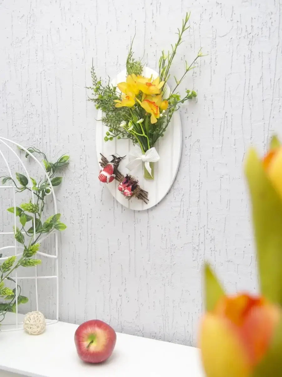 Небольшое декоративное подвесное панно с искусственными цветами и декоративными птичками. Придаст весеннего настроения любому интерьеру. Станет прекрасным дополнением к зеркалу или фотографиям.Размер основы 28,5*18,5 см. Размер композиции 36*28 см.