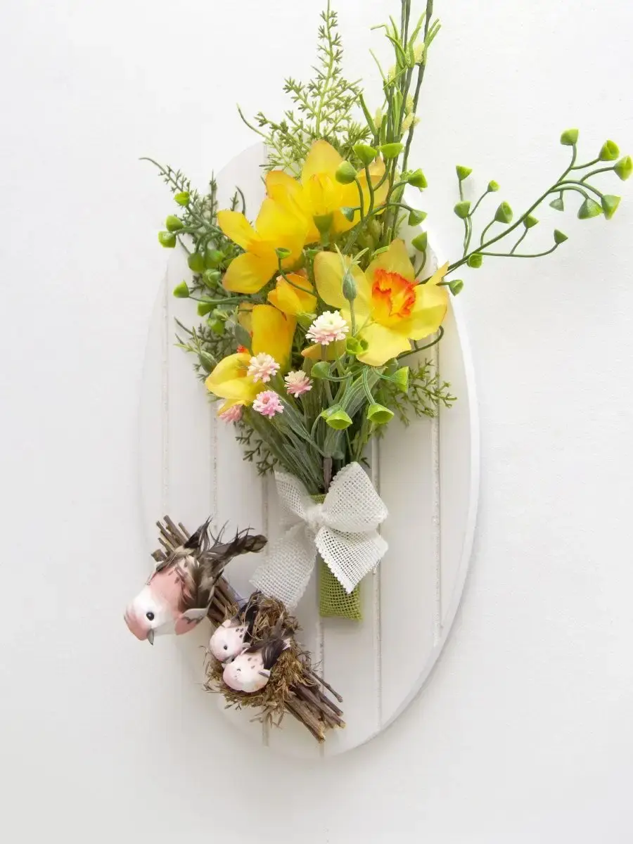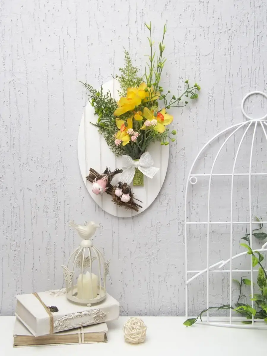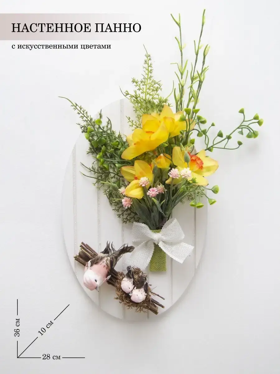 Небольшое декоративное подвесное панно с искусственными цветами и декоративными птичками. Придаст весеннего настроения любому интерьеру. Станет прекрасным дополнением к зеркалу или фотографиям.Размер основы 28,5*18,5 см. Размер композиции 36*28 см.