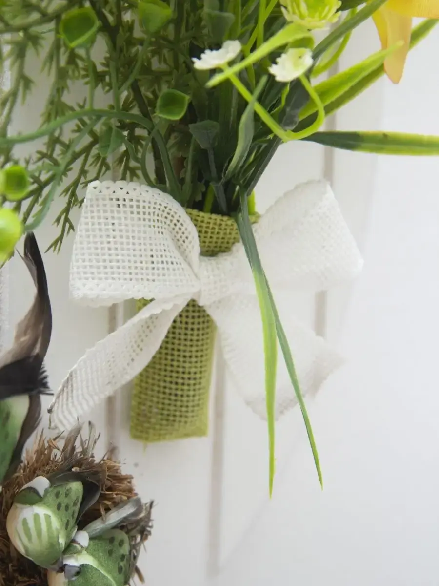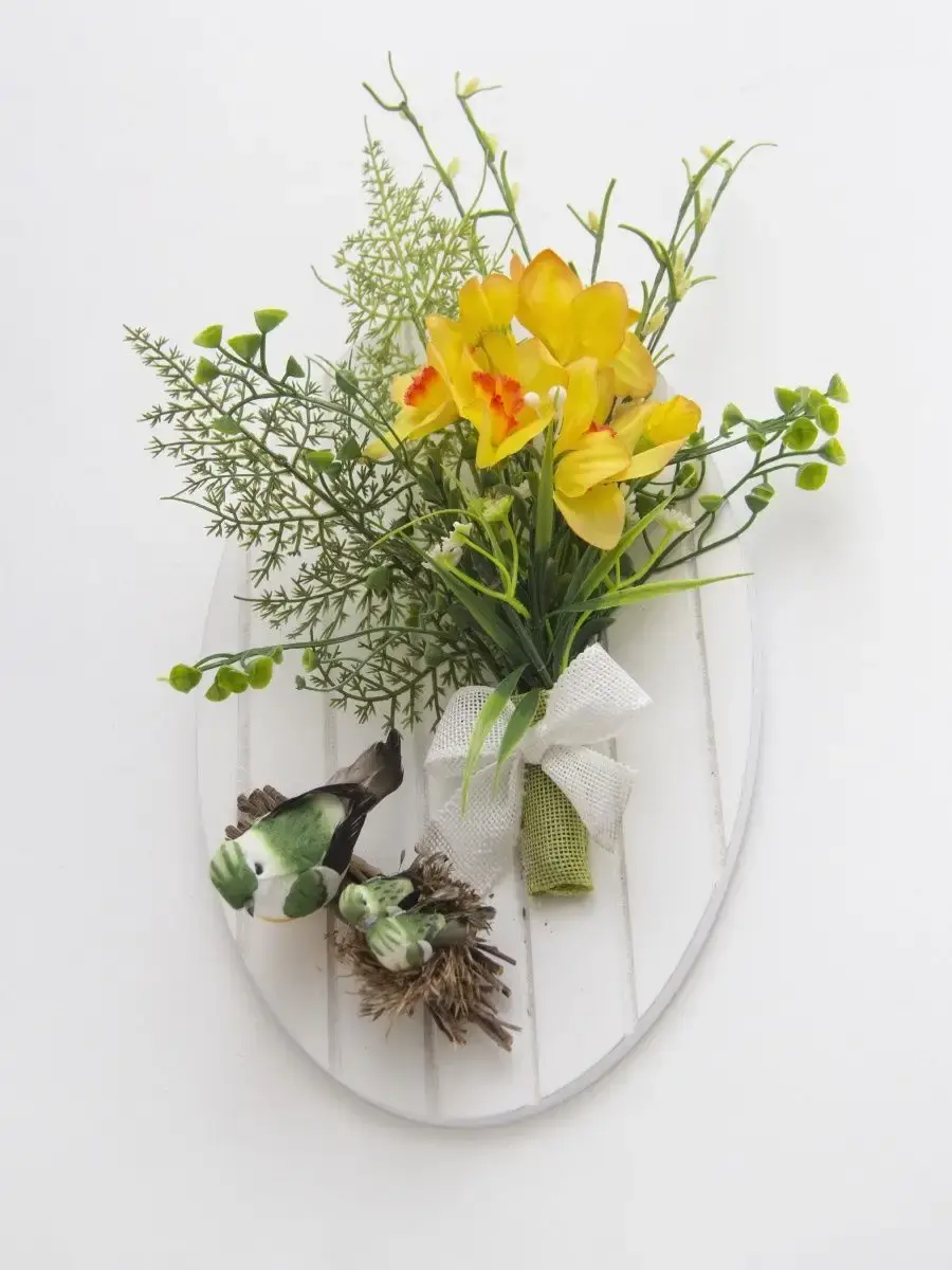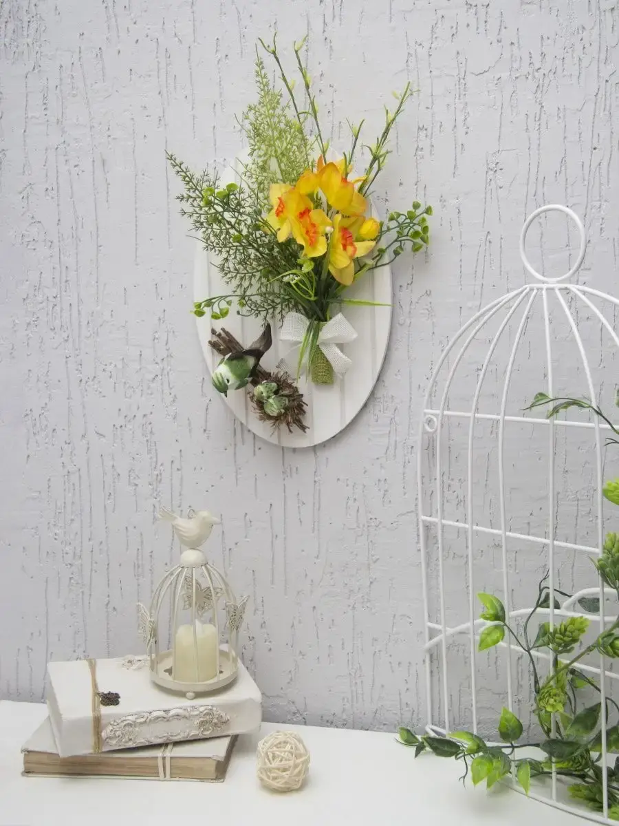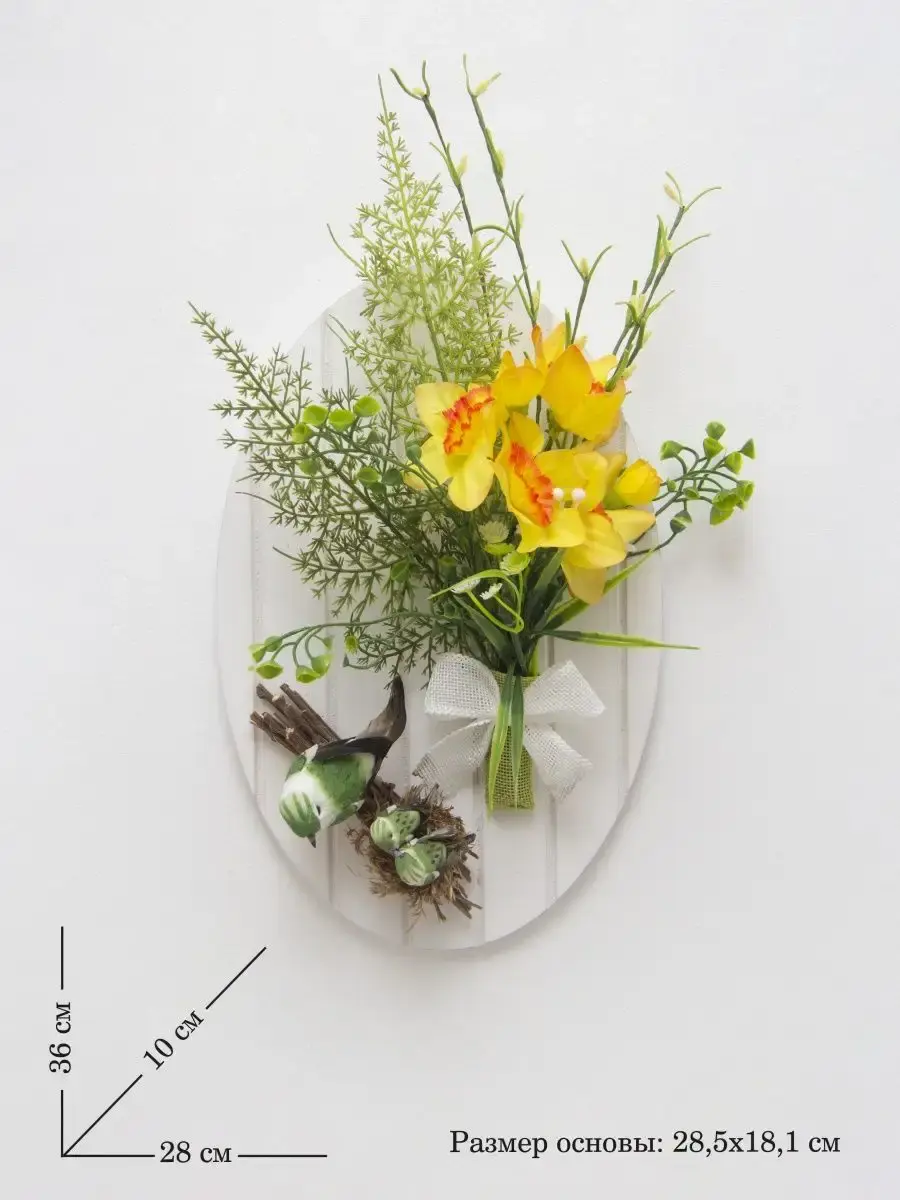 Небольшое декоративное подвесное панно с искусственными цветами и декоративными птичками. Придаст весеннего настроения любому интерьеру. Станет прекрасным дополнением к зеркалу или фотографиям.Размер основы 28,5*18,5 см. Размер композиции 36*28 см.