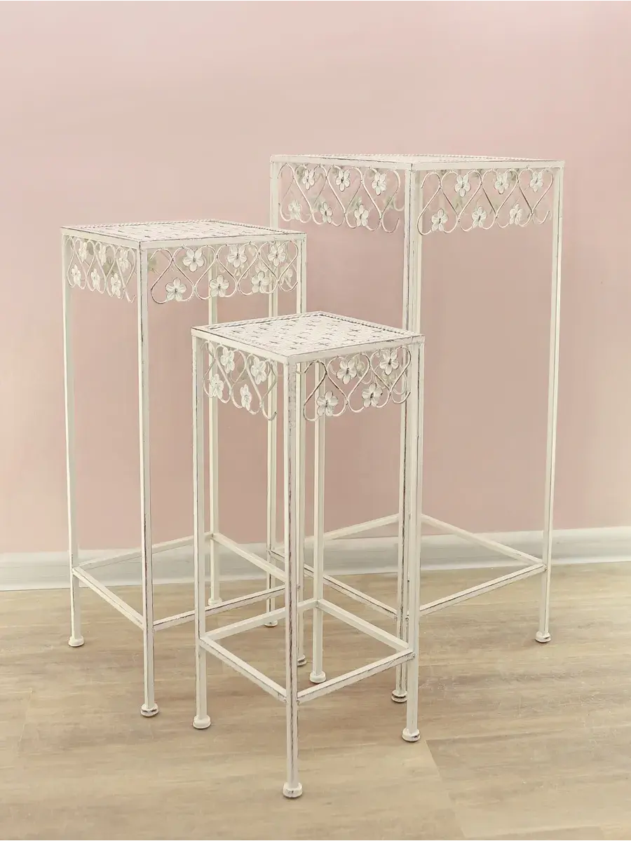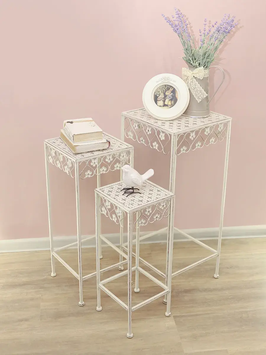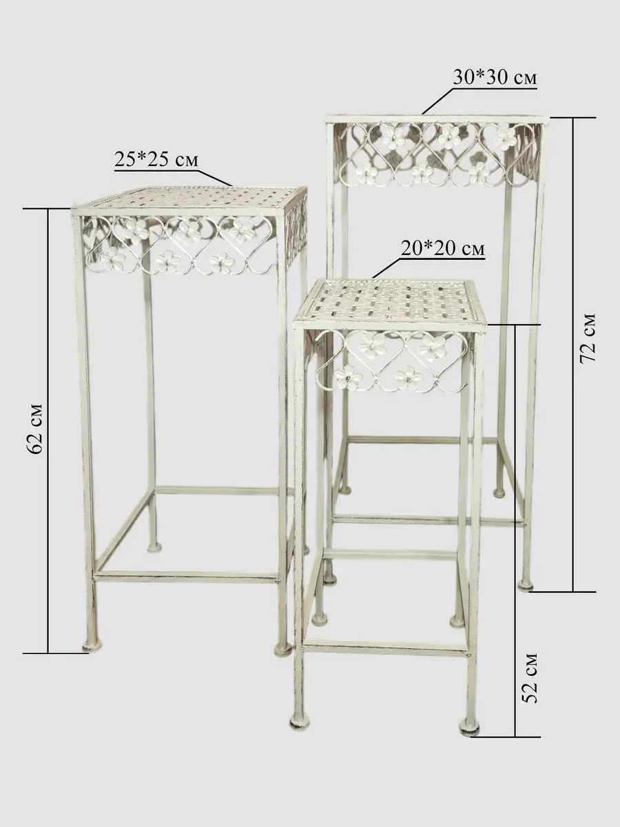 Добавьте стиль и функциональность в ваш дом с набором напольных подставок под цветы "Прованс". Эти металлические подставки для цветов, выполненные в элегантном белом цвете, идеально подойдут для создания уникальных композиций из растений. Разноуровневые стойки 52, 62 и 72 см позволяют разместить растения на разных высотах, создавая визуально привлекательный декор.
