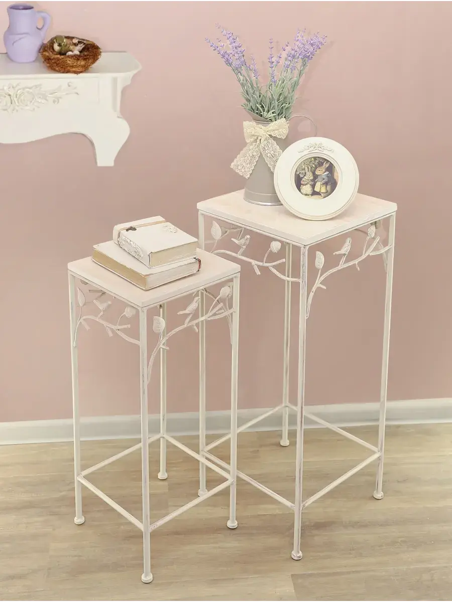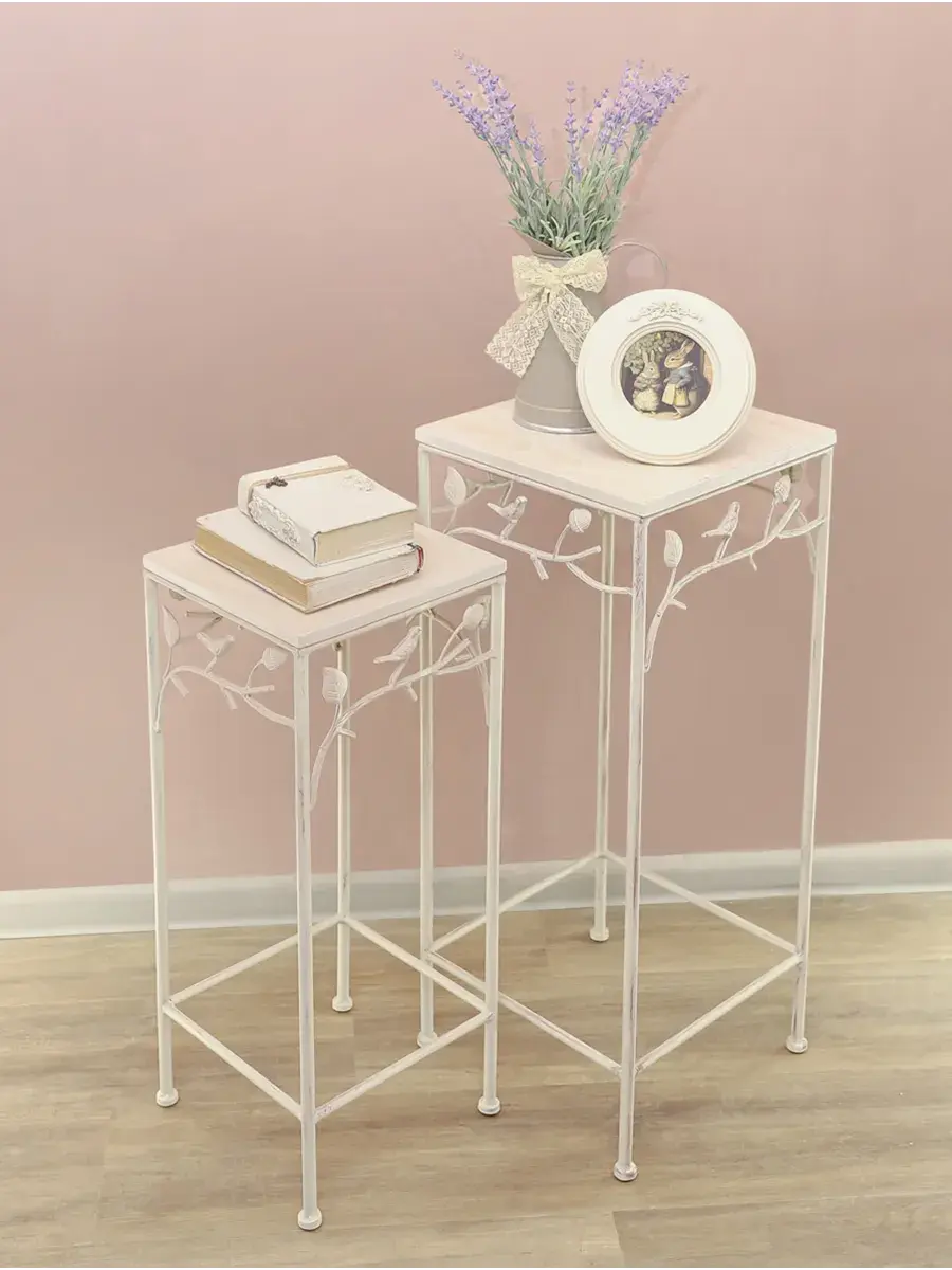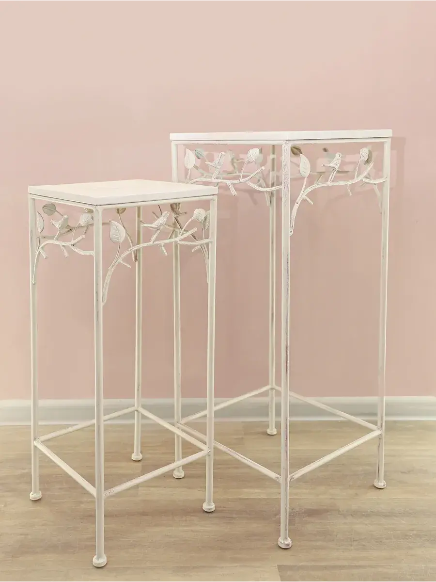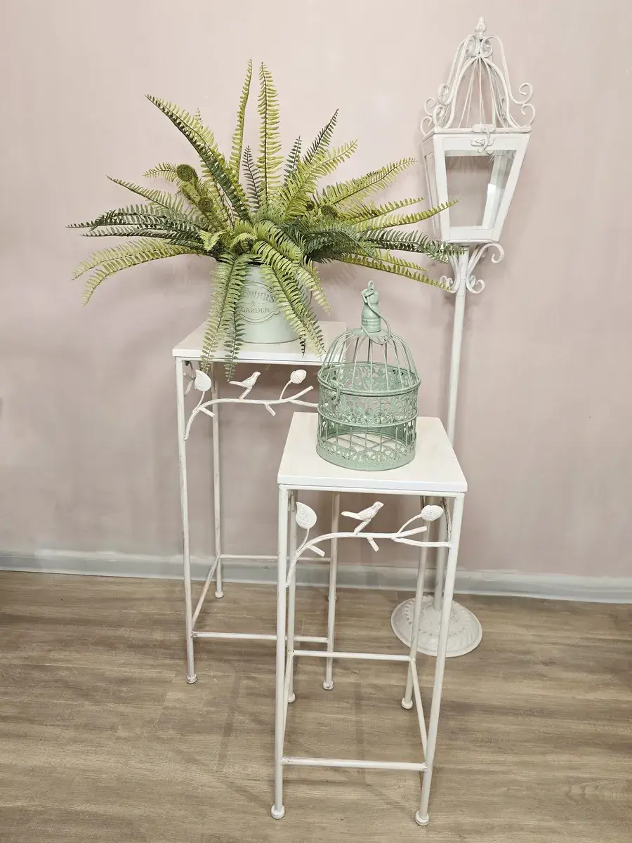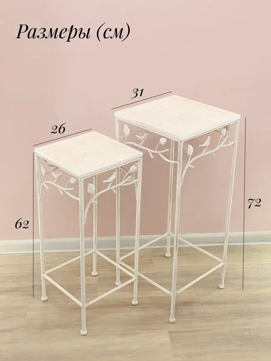 Набор из двух металлических подставок под цветы. Основание под цветок из натурального дерева. Подставки для цветов разной высоты (62 и 72 см) позволят вам создать композицию из комнатных растений на разном уровне, где каждое растение займет свое место. Красивый теплый белый цвет подойдет для любого интерьера и будет гармонировать с любым интерьером. Она отлично подходит для размещения различных растений как в квартире, так и в загородном доме. Может быть использована на балконе, на веранде, для террасы, а также в гостиной или на кухне, добавляя гармонию в любой интерьер. Подставки очень крепкие и устойчивые, выдержат большой вес. Подойдут для кашпо диаметром до 30 см. Для создания единого стиля в интерьере подставки можно дополнить настенным металлическим панно с листьями монстеры или подвесными кашпо из коллекции "Дивный сад" бренда Elenadecor.