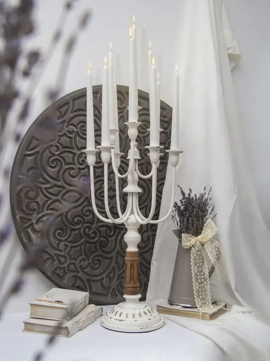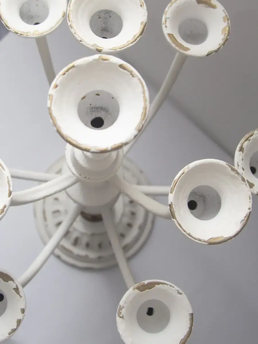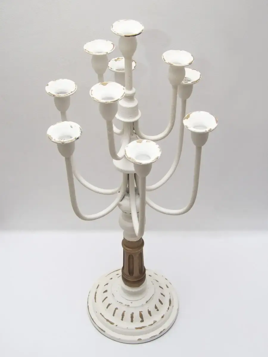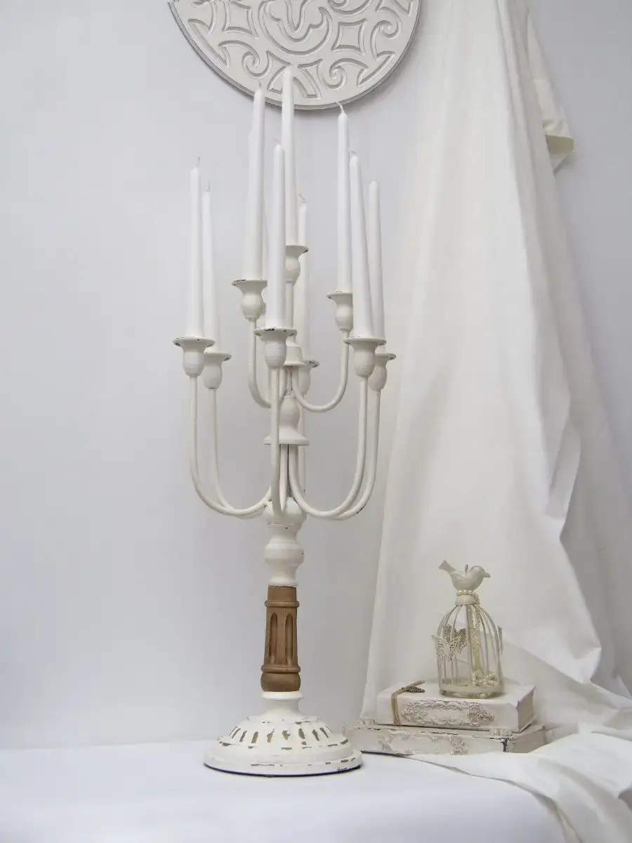 Изысканный настольный подсвечник на 10 свечей. Тяжелое чугунное основание придает устойчивость, ножка из натурального дерева, крепкие железные держатели свечей. Высокий (60 см) и компактный канделябр, идеальное украшение для камина, консоли или большого обеденного стола. Декор для интерьера гостиной, спальни или прихожей. Легко обновить интерьер добавив два канделябра и настенный декор в современном стиле Подойдет для тонких свечей 2см, на фото обычные свечи диаметром 3см (их надо немного заострить для плотной посадки). Подсвечник покрыт матовой эмалью с ЭФФЕКТОМ СТАРЕНИЯ.
