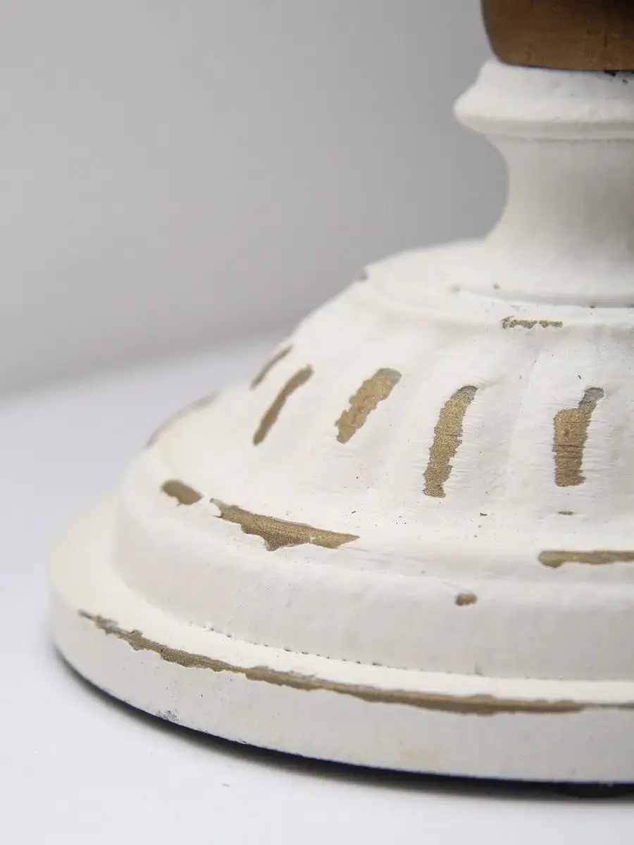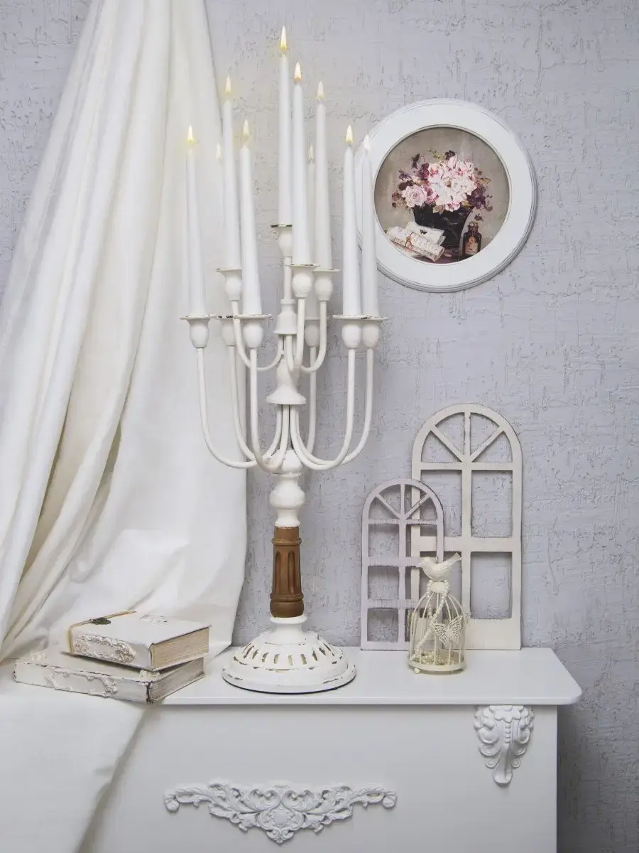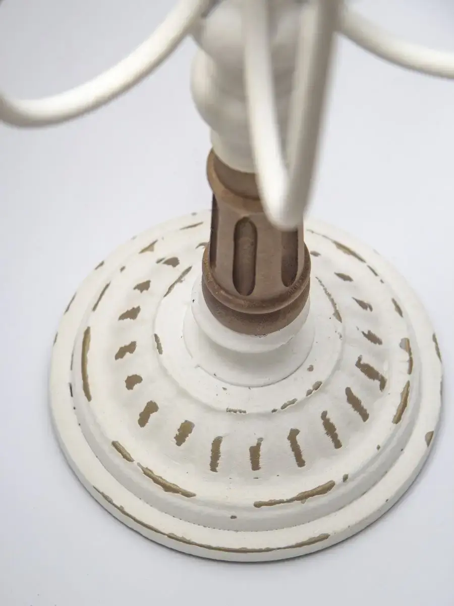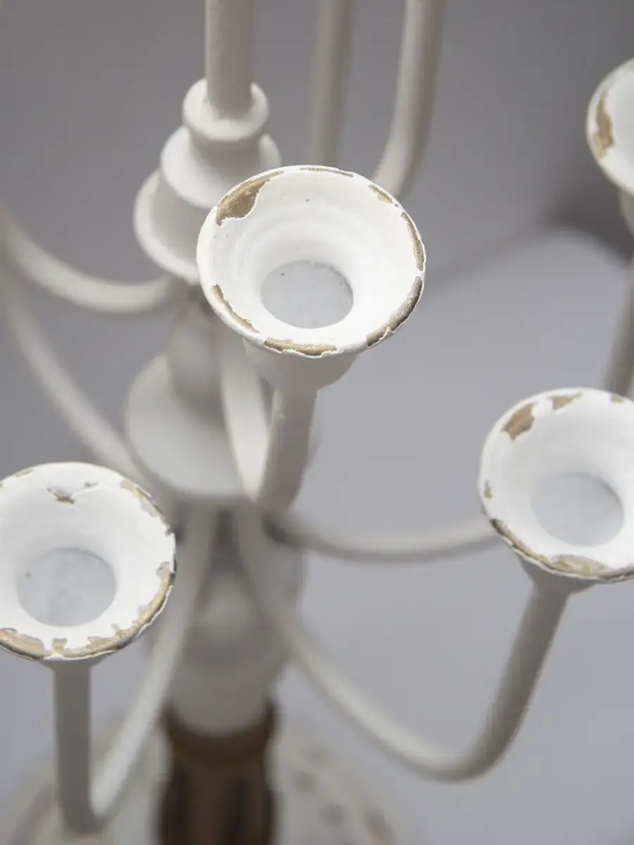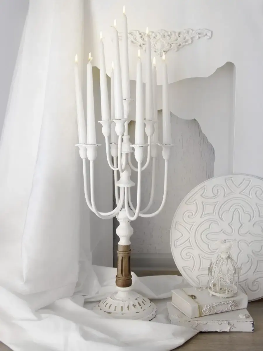 Изысканный настольный подсвечник на 10 свечей. Тяжелое чугунное основание придает устойчивость, ножка из натурального дерева, крепкие железные держатели свечей. Высокий (60 см) и компактный канделябр, идеальное украшение для камина, консоли или большого обеденного стола. Декор для интерьера гостиной, спальни или прихожей. Легко обновить интерьер добавив два канделябра и настенный декор в современном стиле Подойдет для тонких свечей 2см, на фото обычные свечи диаметром 3см (их надо немного заострить для плотной посадки). Подсвечник покрыт матовой эмалью с ЭФФЕКТОМ СТАРЕНИЯ.