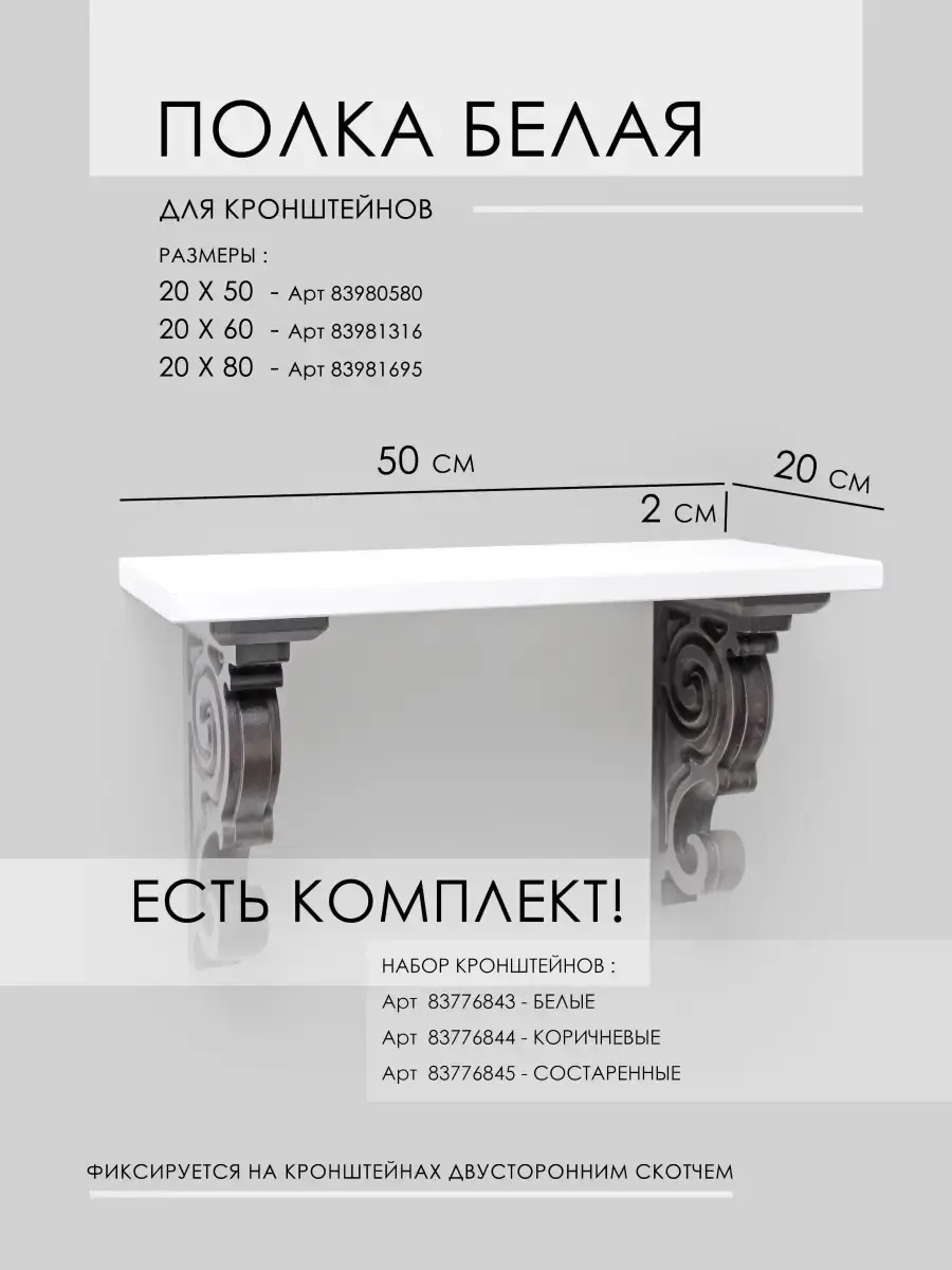 КРОНШЕЙНЫ В КОМПЛЕКТ НЕ ВХОДЯТ, ОНИ ПРОДАЮТСЯ ОТДЕЛЬНО. Полки и кронштейны специально разделены в разные артикулы, чтобы Вы могли выбрать для себя самый оптимальный вариант. Полки есть разного размера и цвета (от 50-80см), а кронштейны разного цвета (белые, коричневые и состаренные). Полка изготовлена из березовой фанеры высшего сорта толщиной 20 мм., окрашена акриловой эмалью / морилкой +лак без запаха. К полке подходят по размеру кронштейны: арт.83776843 арт.83776844 арт.83776845.