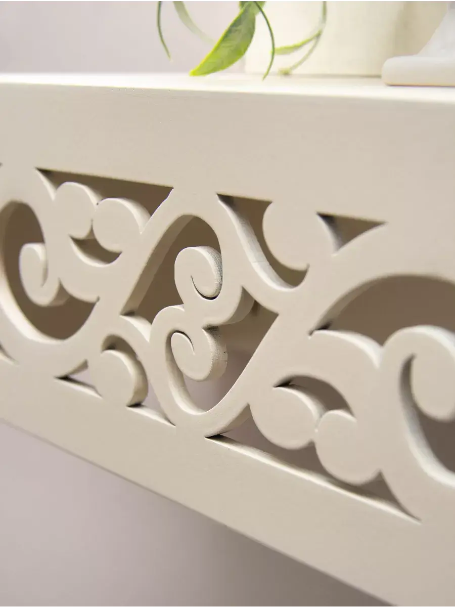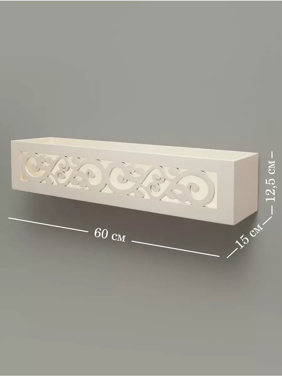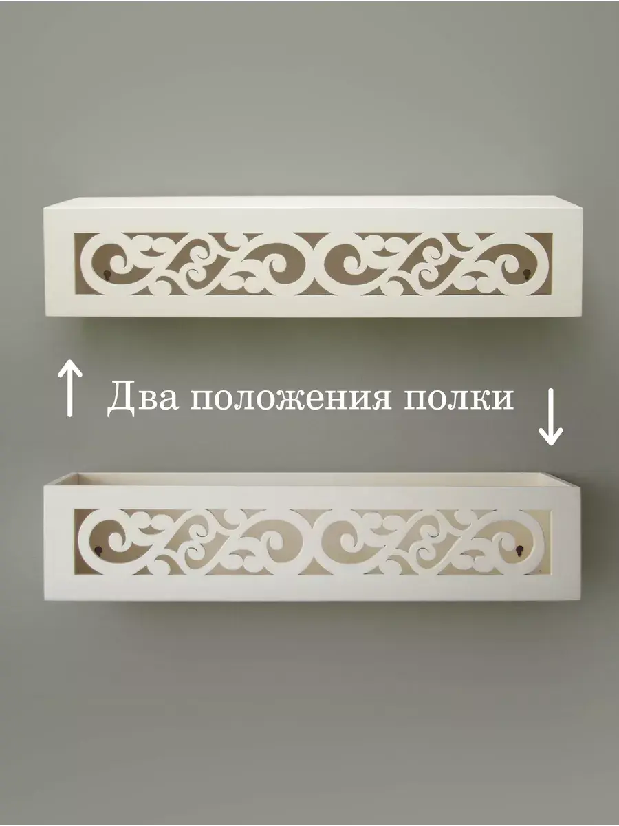 Она имеет два варианта крепления на стене, как полку или как ящик-полку. Передняя панель резная. Покрашена акриловой эмалью на водной основе. Крепления для стены в комплекте. Размер полки 60х15х12 см.