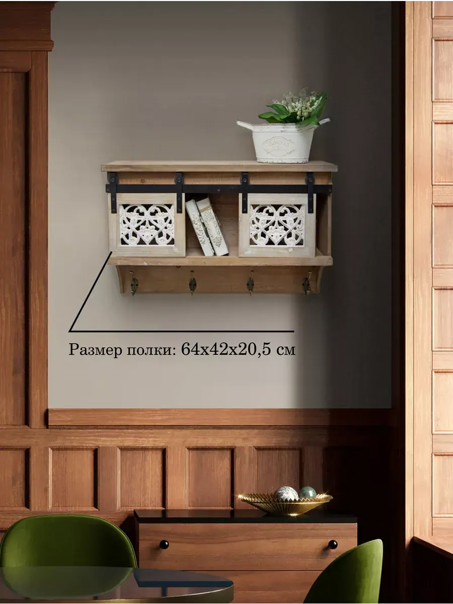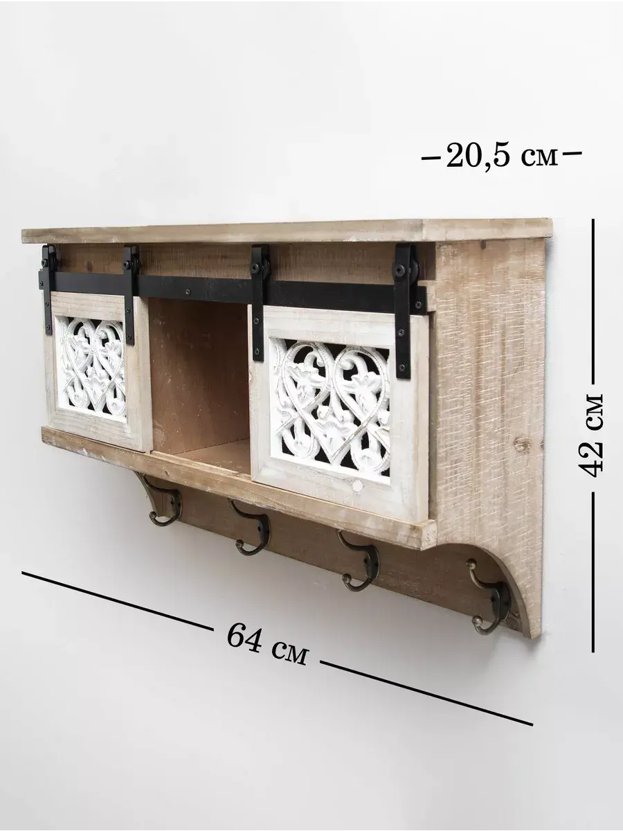 Полка с крючками и дверками "Флоренция" станет стильным и функциональным дополнением к любому интерьеру. Изготовленная из натурального дерева, эта полка гармонично впишется в обстановку в стиле прованс, шебби-шик или лофт. Компактные размеры 64*20.5*42 см позволяют разместить ее в любом удобном месте, а наличие крючков и дверок расширяет возможности ее использования. Полка "Флоренция" станет идеальным решением для хранения и организации мелочей, книг, декоративных элементов, а также для создания уютной атмосферы в вашем доме. Благодаря надежному креплению на дюбелях, полка прочно фиксируется на стене и выдерживает значительные нагрузки. Полка поставляется в собранном виде, что позволяет сразу же приступить к ее использованию.