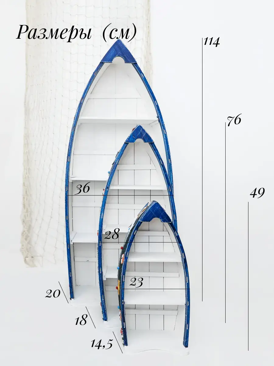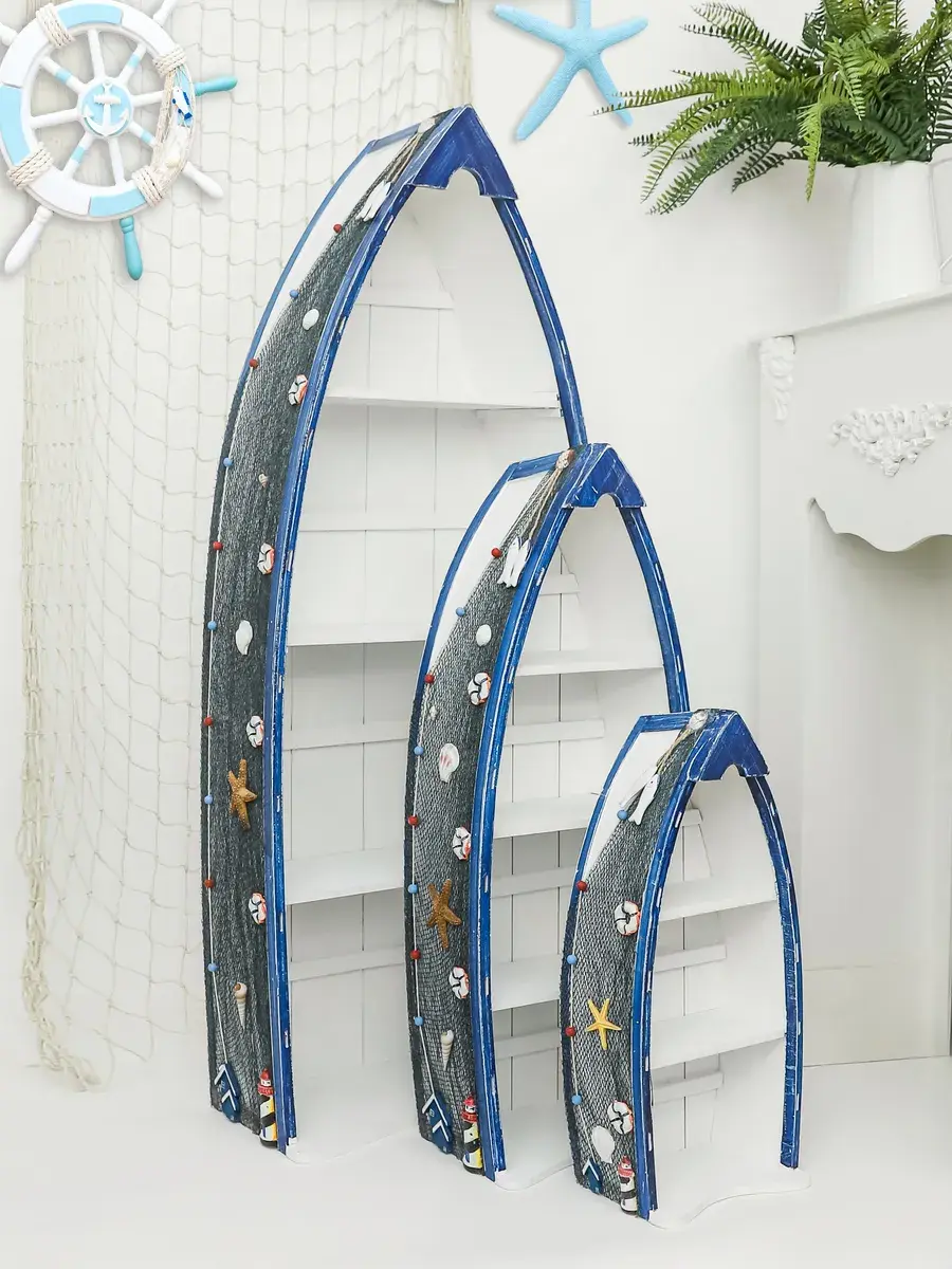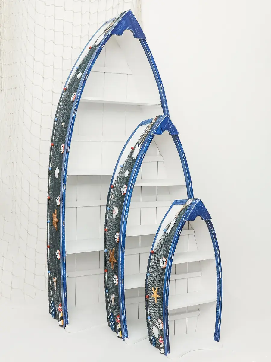 Комплект из трех полок в морском стиле от Elenadecor станет стильным и функциональным дополнением к любому интерьеру. Набор полок, выполненных из дерева с матовой поверхностью, придаст вашей гостиной, детской или ванной комнате неповторимый шарм морского бриза. Полки в форме лодки не только оригинально выглядят, но и удобны в использовании, позволяя разместить книги, декоративные элементы, игрушки или ванные принадлежности. Открытый тип фасада обеспечивает легкий доступ к вещам, а задняя панель гарантирует надежность и устойчивость конструкции. Комплект полок Elenadecor - это не просто мебель, а настоящий морской декор, который добавит в ваш дом нотку свежести и уюта. Размеры каждой полке указаны на фото.