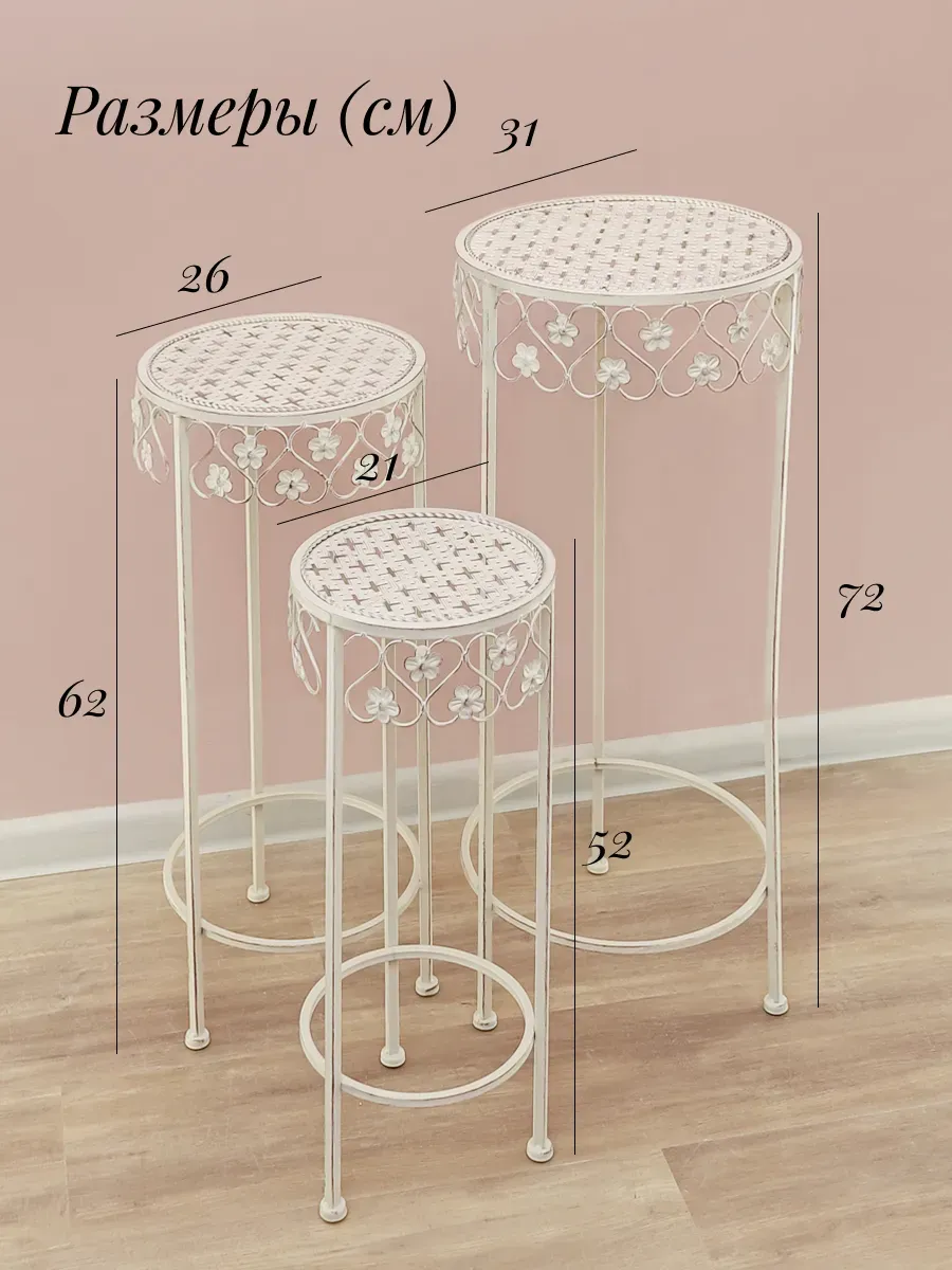 Создайте уникальный интерьер с набором из трех напольных металлических подставок для цветов. Прочные и устойчивые, они обеспечивают надежную поддержку даже для самых тяжелых кашпо, выдерживая значительный вес. Подставки подходят для кашпо диаметром до 24 см, что делает их универсальными для любого стиля интерьера. Эти декоративные элементы не только функциональны, но и эстетичны, они придадут вашему дому нотку изысканности и утонченности. Идеально подходят для использования как в гостиной, так и на балконе, они помогут создать уютный уголок зелени и спокойствия. Подставка для цветов напольная металлическая – это не просто аксессуар, а важная часть вашего интерьера, подчеркивающая ваш вкус и индивидуальность. Дополните их настенными панно или подвесными кашпо из коллекции "Дивный сад" для создания гармоничного пространства. Превратите ваш дом в стильный оазис с этими элегантными подставками.