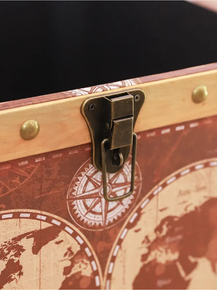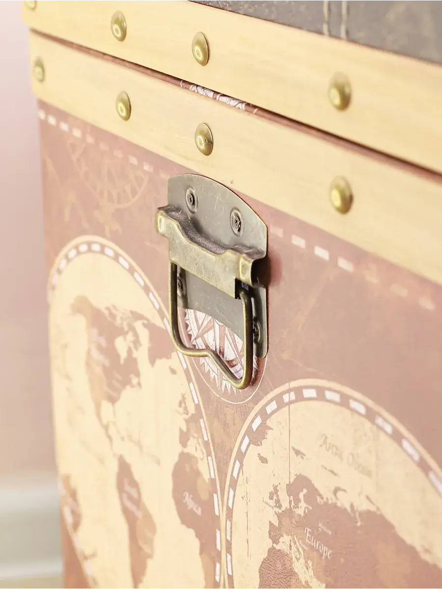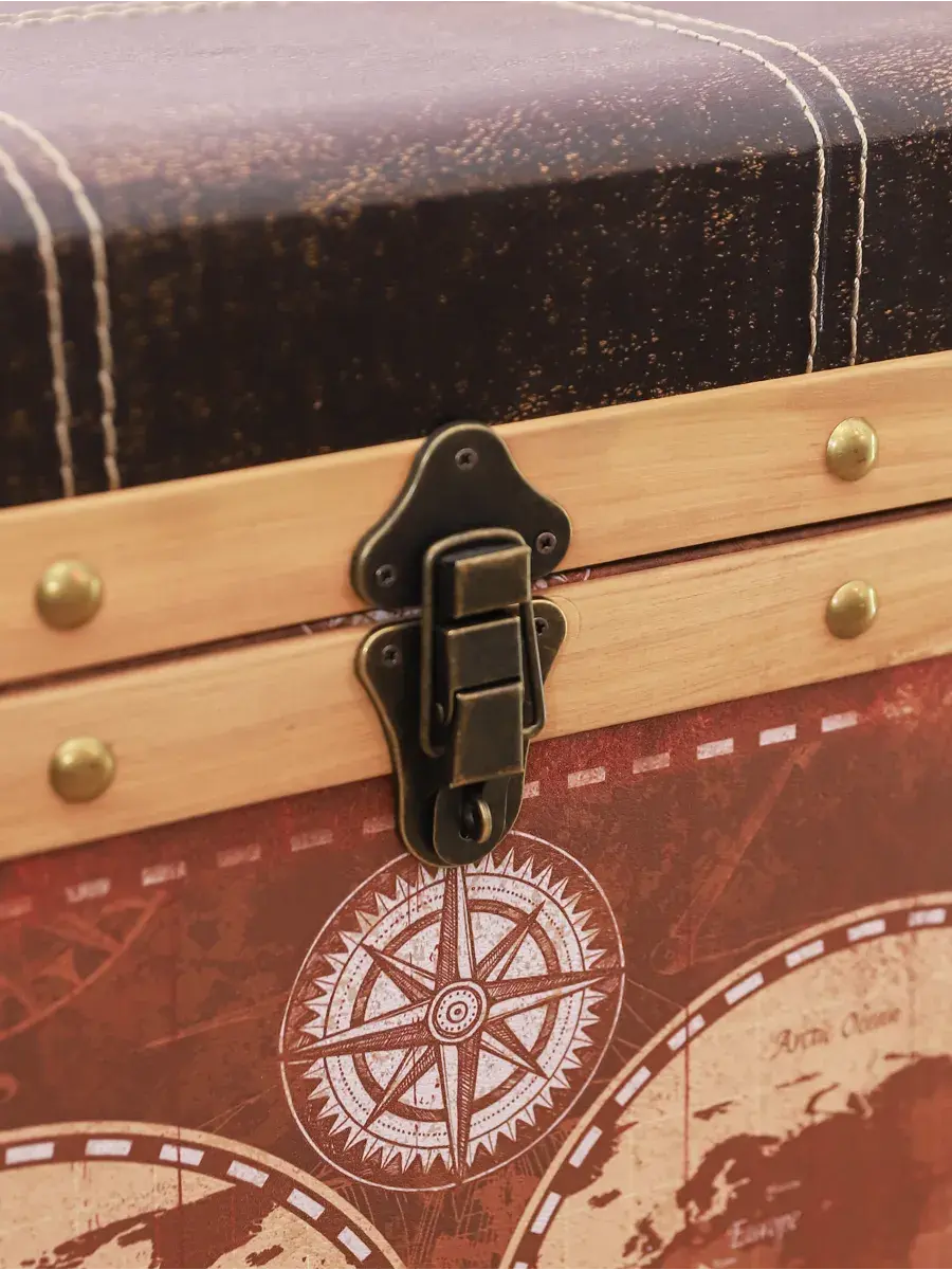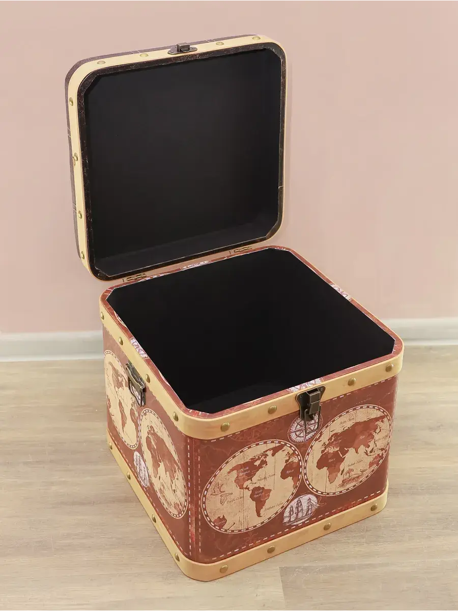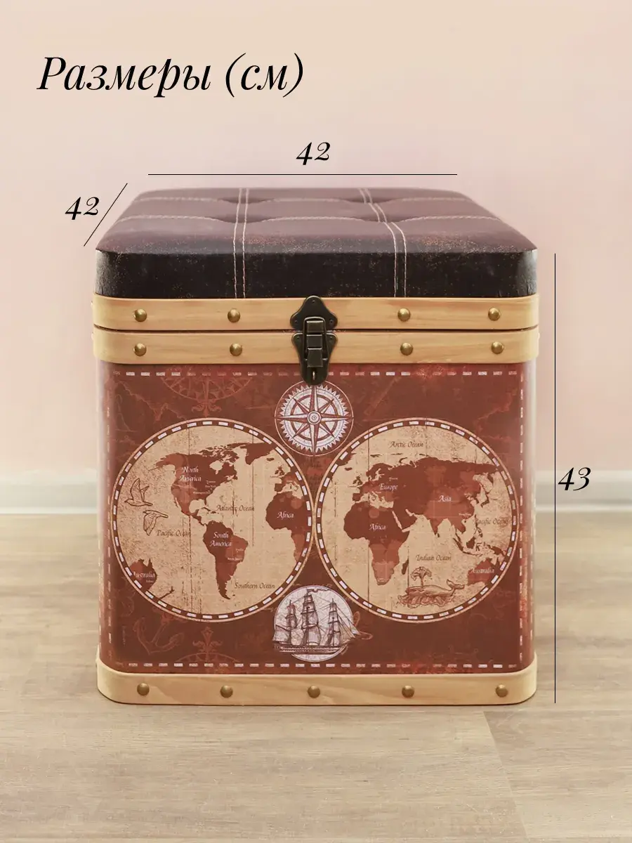 Пуфик-сундучок с покрытием из высококачественной эко-кожи добавит не только уюта вашей прихожей или гостиной, но и поможет навести порядок, избавиться от визуального мусора и найти место для тысячи нужных мелочей, благодаря пространству для хранения внутри каждого пуфика. Размер - 43*42*42 см. Светлая окантовка и темная металлическая фурнитура придают пуфам элегантности, эффект состаривания превращают их в настоящую антикварную роскошь и раритет. Карта мира, изображенная на пуфах позволит вам погрузиться в мечты о новых путешествиях.