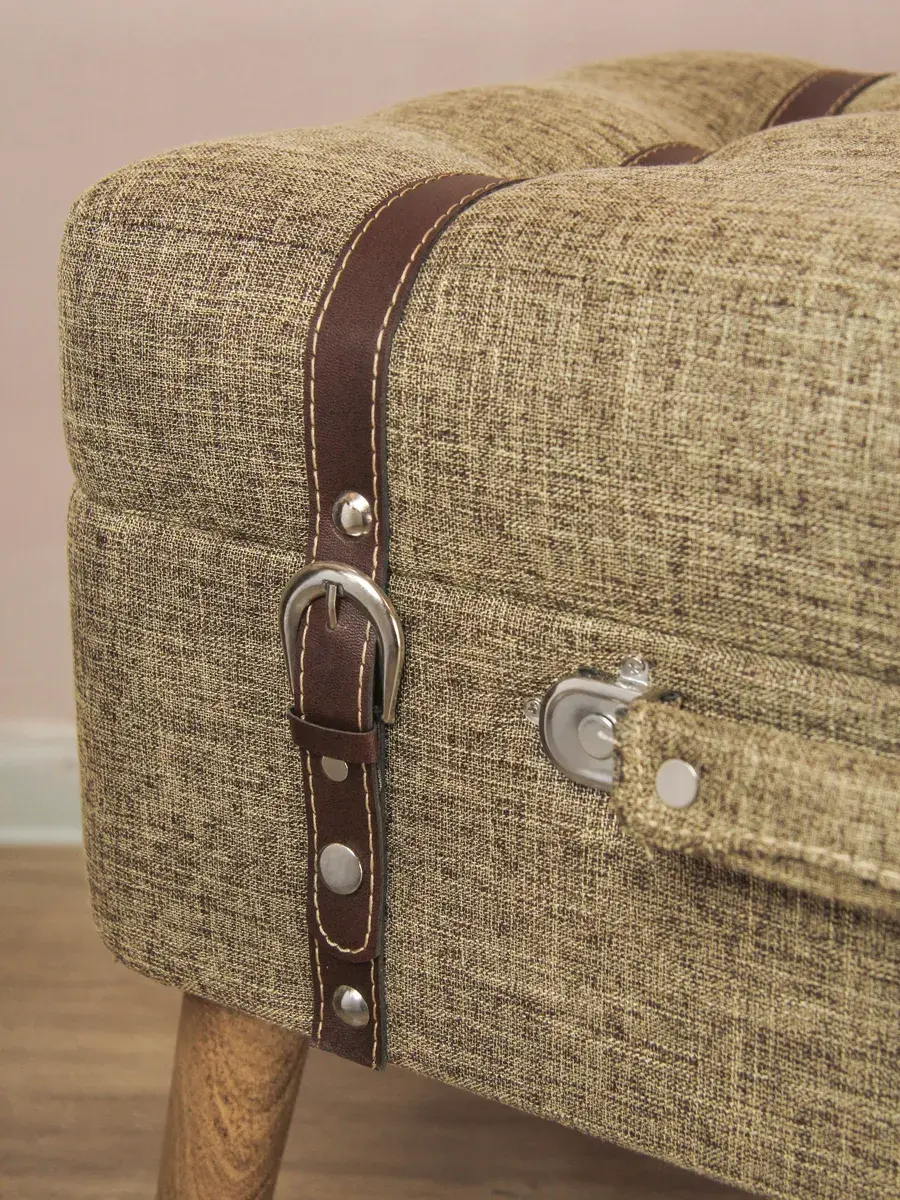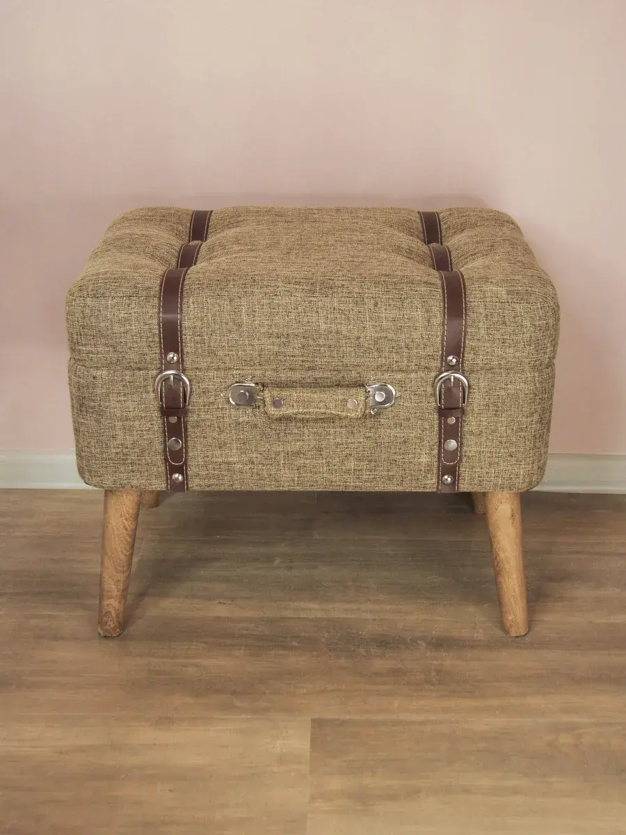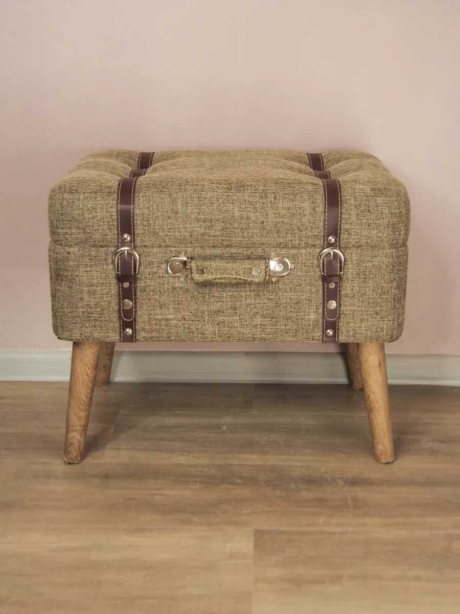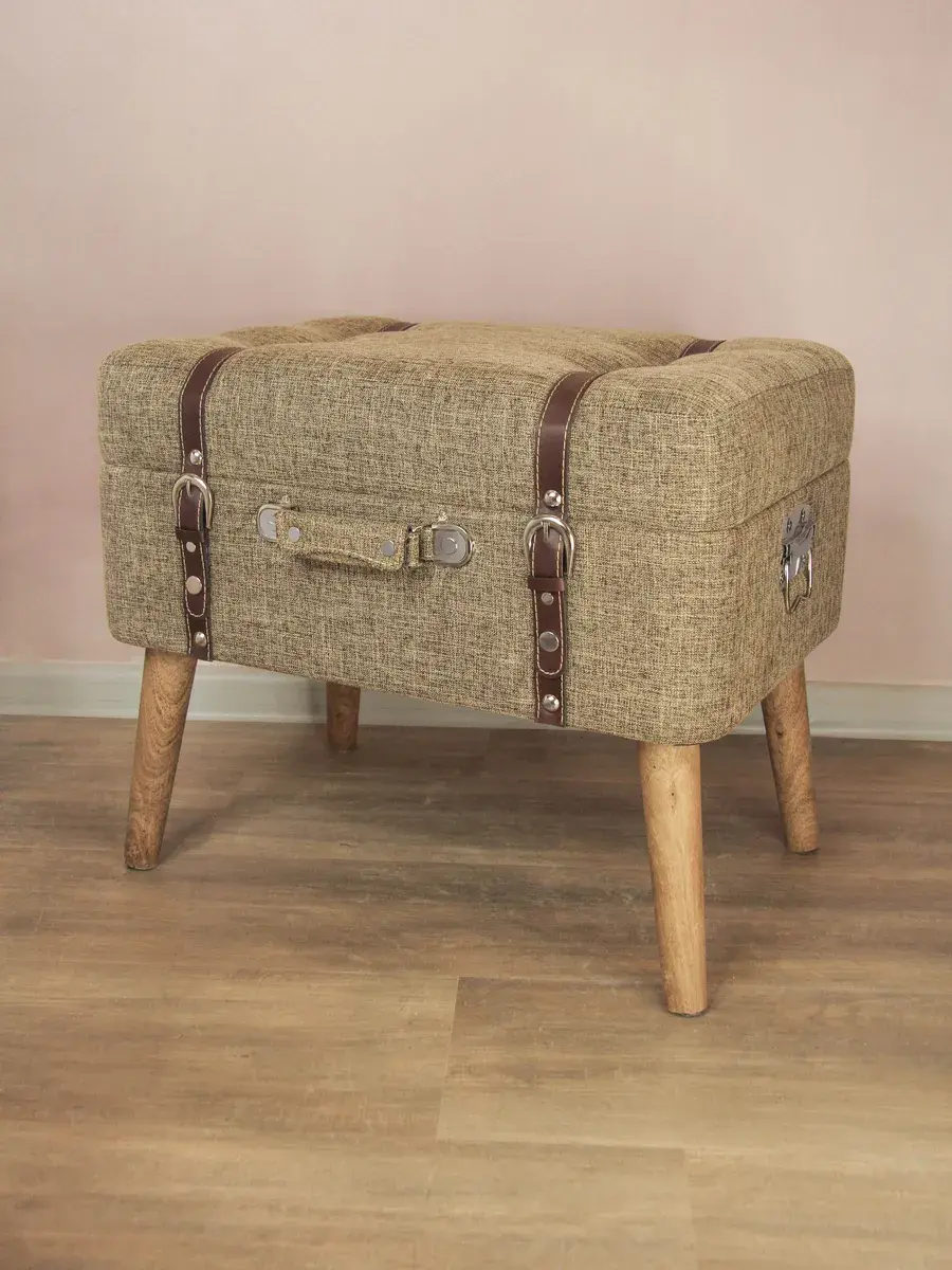Большой пуф-сундучок с покрытием из высококачественного текстиля добавит не только уюта вашей прихожей или гостиной, но и поможет навести порядок, избавиться от визуального мусора и найти место для тысячи нужных мелочей, благодаря пространству для хранения внутри каждого пуфика. Размер пуфика 54*44*34 см. Деревянные ножки придают пуфику элегантности, а высококачественная фурнитура и эффект состаривания превращают набор в настоящую антикварную роскошь и раритет. Ремни делают пуфик похожим на винтажный чемодан.