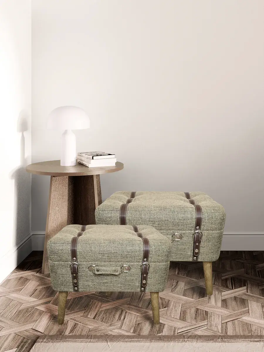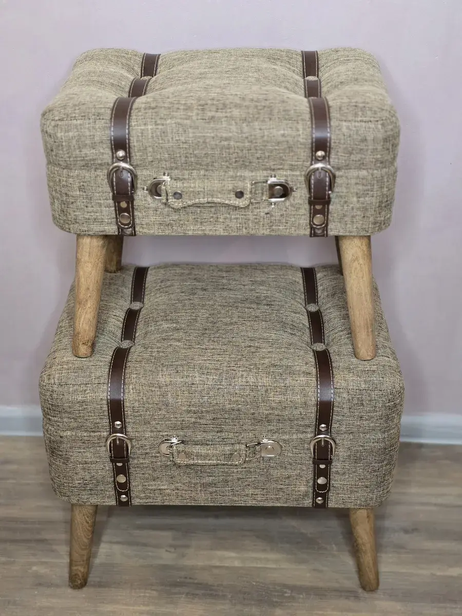 Набор из 2х пуфов-сундучков с покрытием из высококачественного текстиля добавит не только уюта вашей прихожей или гостиной, но и поможет навести порядок, избавиться от визуального мусора и найти место для тысячи нужных мелочей, благодаря пространству для хранения внутри каждого пуфика. Размер большого пуфа - 54*44*34 см, размер маленького 45*30*37 см. Деревянные ножки придают пуфикам элегантности, а высококачественная фурнитура и эффект состаривания превращают набор в настоящую антикварную роскошь и раритет. Ремни делают пуфики похожими на винтажные чемоданы.