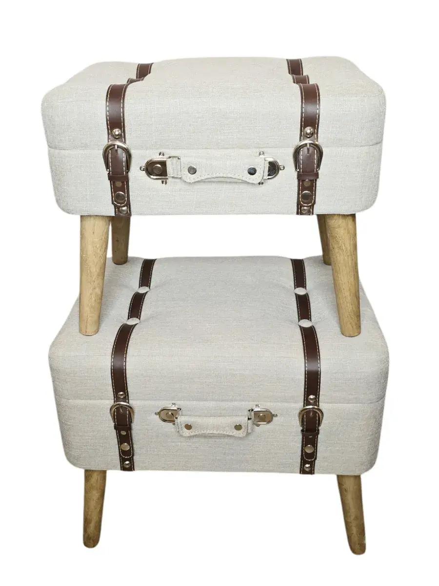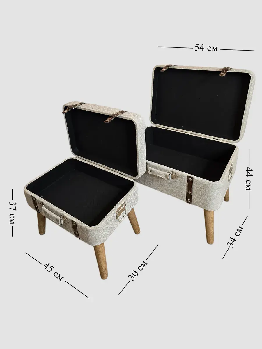 Набор из 2х пуфов-сундучков с покрытием из высококачественного текстиля добавит не только уюта вашей прихожей или гостиной, но и поможет навести порядок, избавиться от визуального мусора и найти место для тысячи нужных мелочей, благодаря пространству для хранения внутри каждого пуфика. Размер большого пуфа - 54*44*34 см, размер маленького 45*30*37 см. Деревянные ножки придают пуфикам элегантности, а высококачественная фурнитура и эффект состаривания превращают набор в настоящую антикварную роскошь и раритет. Ремни делают пуфики похожими на винтажные чемоданы.