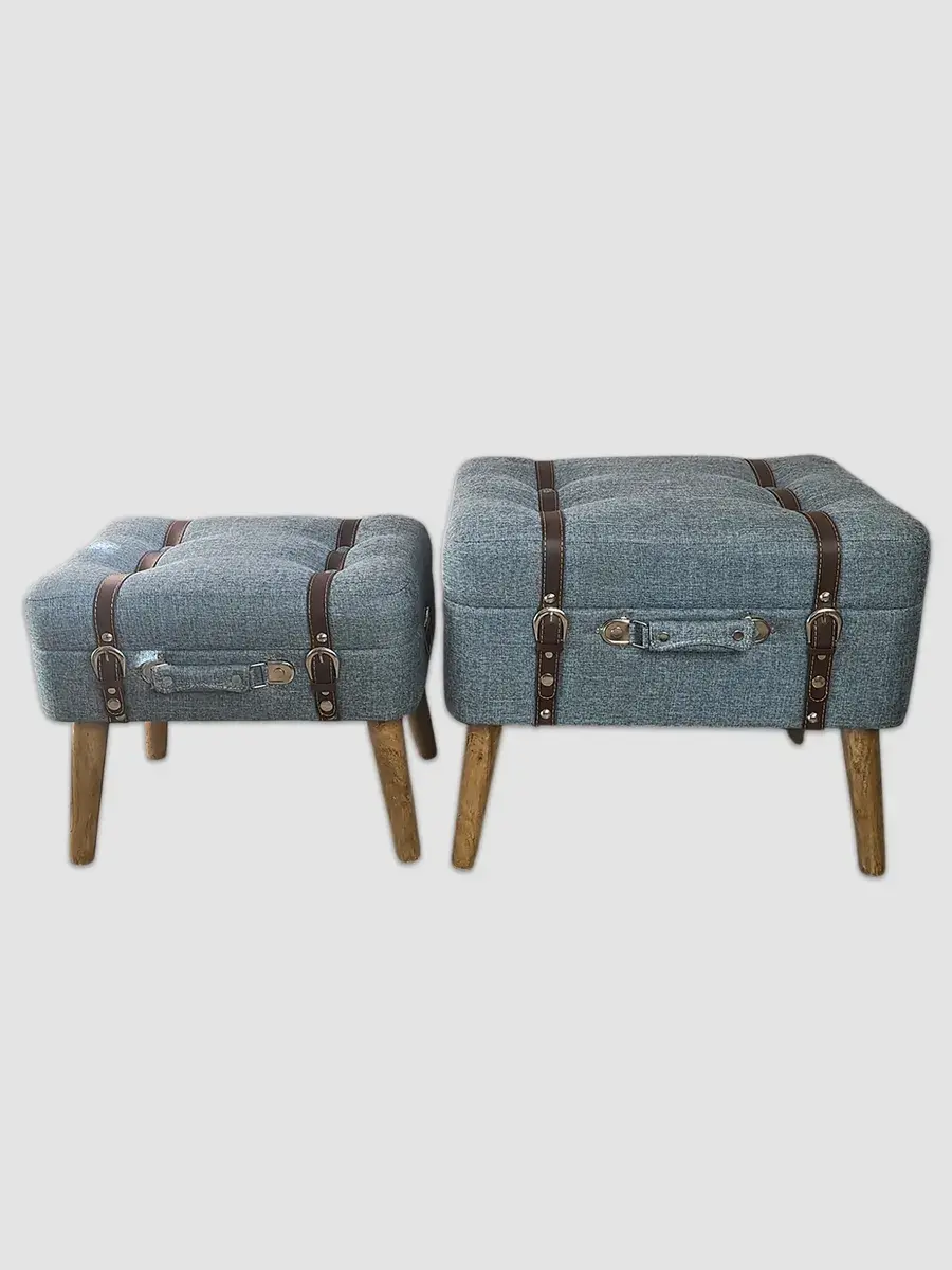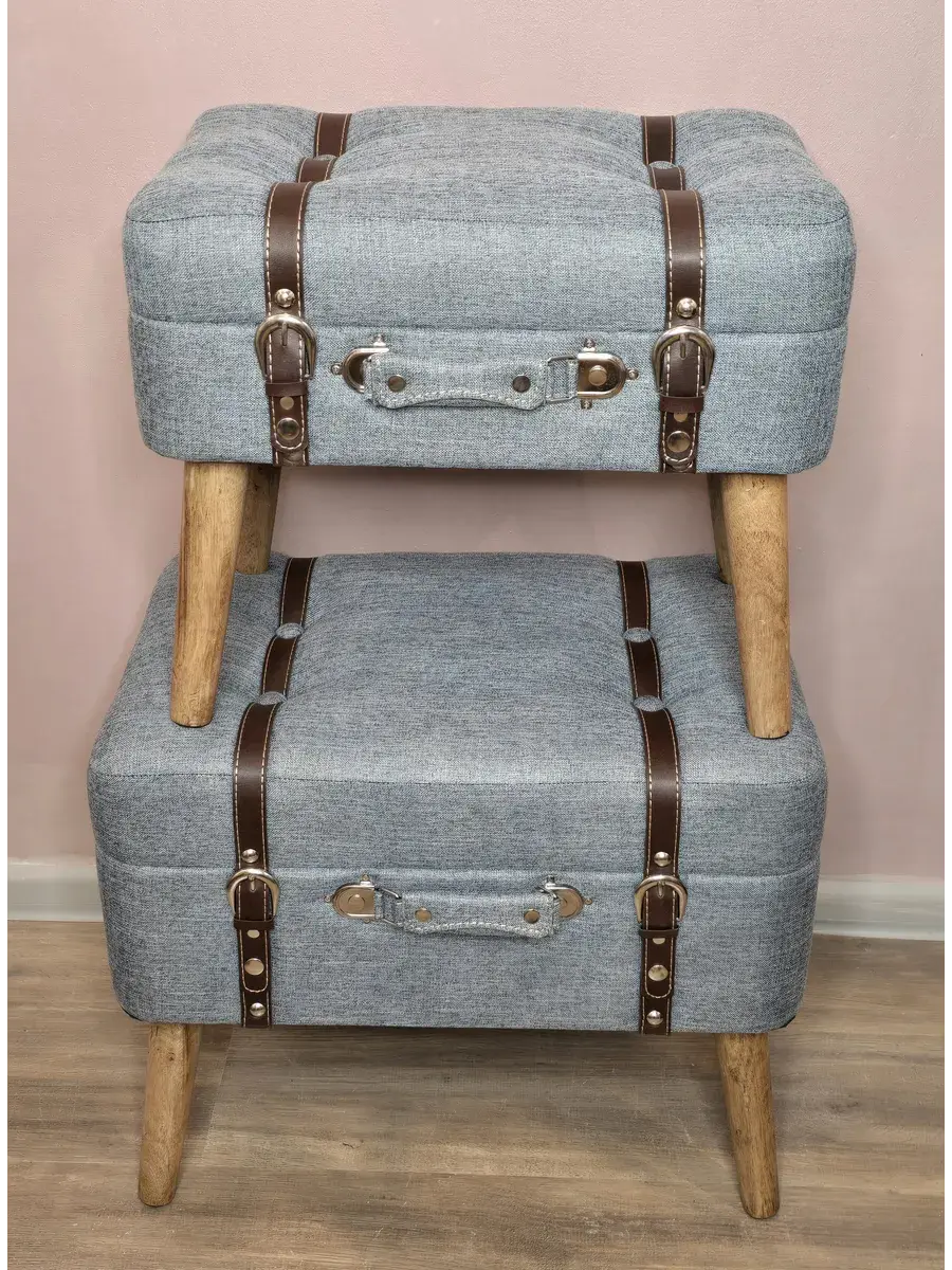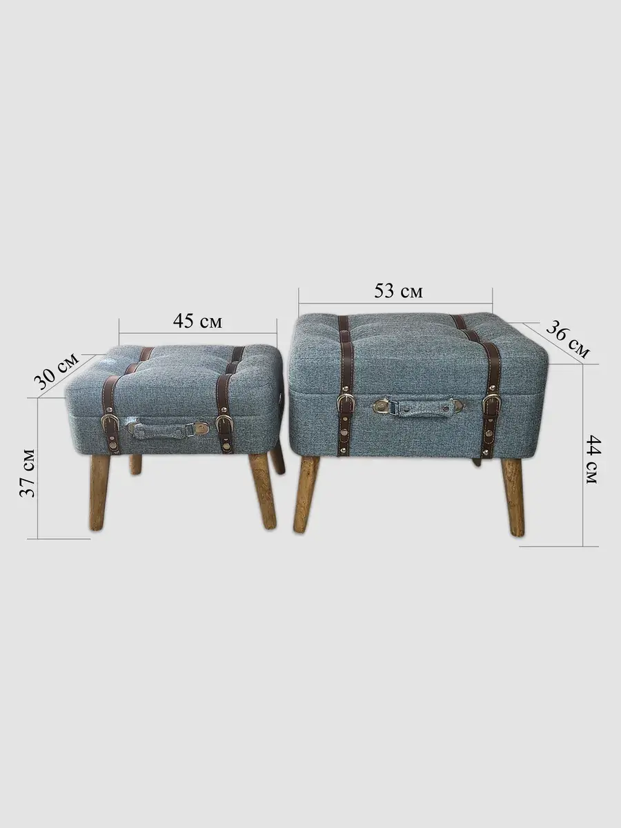 Набор из 2х пуфов-сундучков с покрытием из высококачественного текстиля добавит не только уюта вашей прихожей или гостиной, но и поможет навести порядок, избавиться от визуального мусора и найти место для тысячи нужных мелочей, благодаря пространству для хранения внутри каждого пуфика. Размер большого пуфа - 54*44*34 см, размер маленького 45*30*37 см. Деревянные ножки придают пуфикам элегантности, а высококачественная фурнитура и эффект состаривания превращают набор в настоящую антикварную роскошь и раритет. Ремни делают пуфики похожими на винтажные чемоданы.