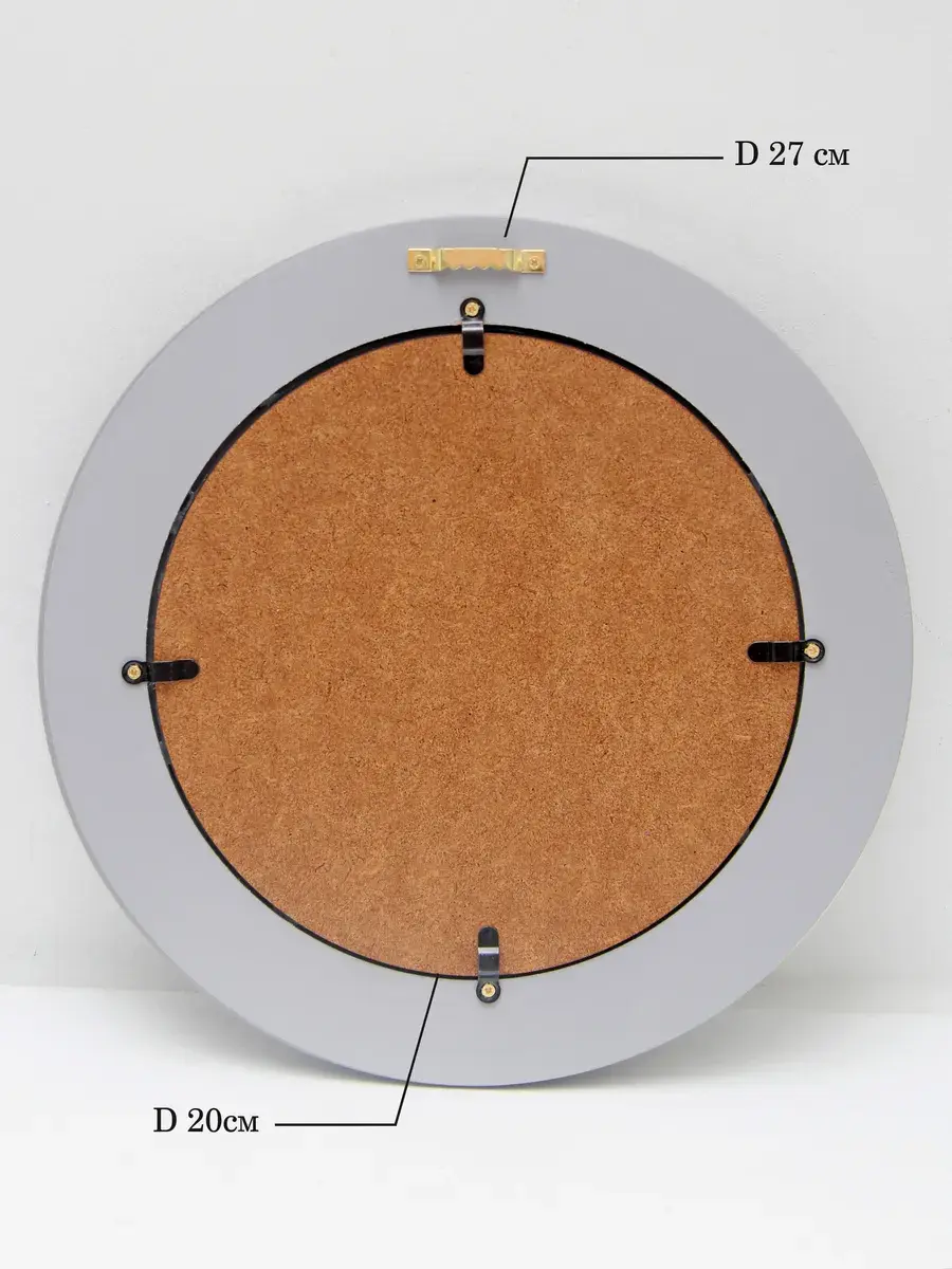 Рама цельная, без стыков и зазоров. Изготовлена из МДФ 16 мм, диаметр изображения - 19 см., диаметр с рамой 27 см., размер оргалита в четверти 20см, БЕЗ СТЕКЛА. Окрашена акриловой эмалью без запаха. Рама подойдет для фотографий, рисунков, вышивки и других видов творчества. Крепление для стены в комплекте.