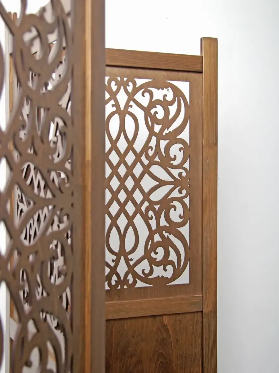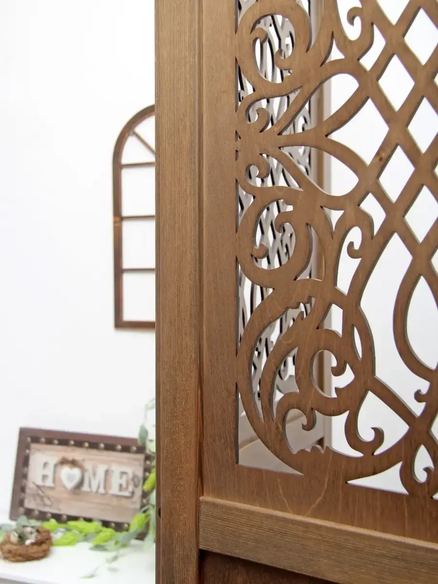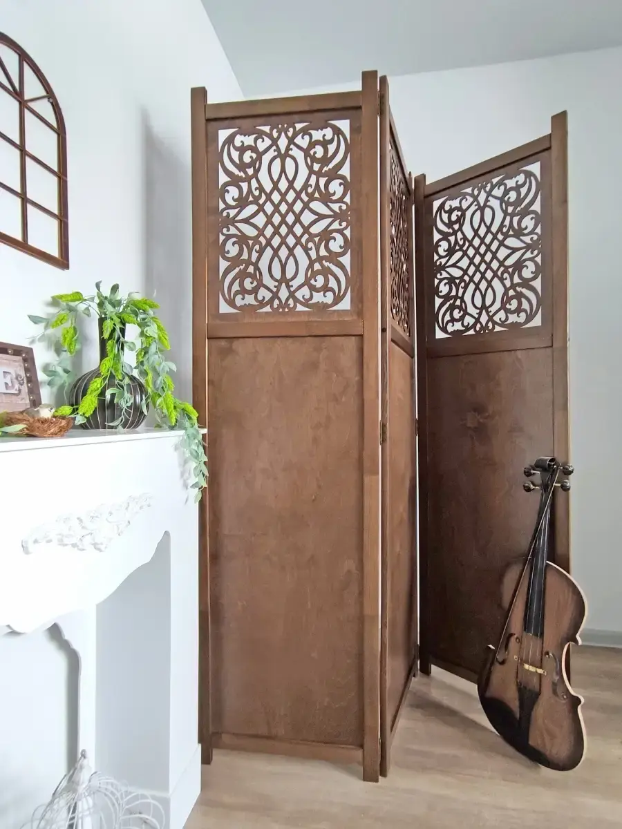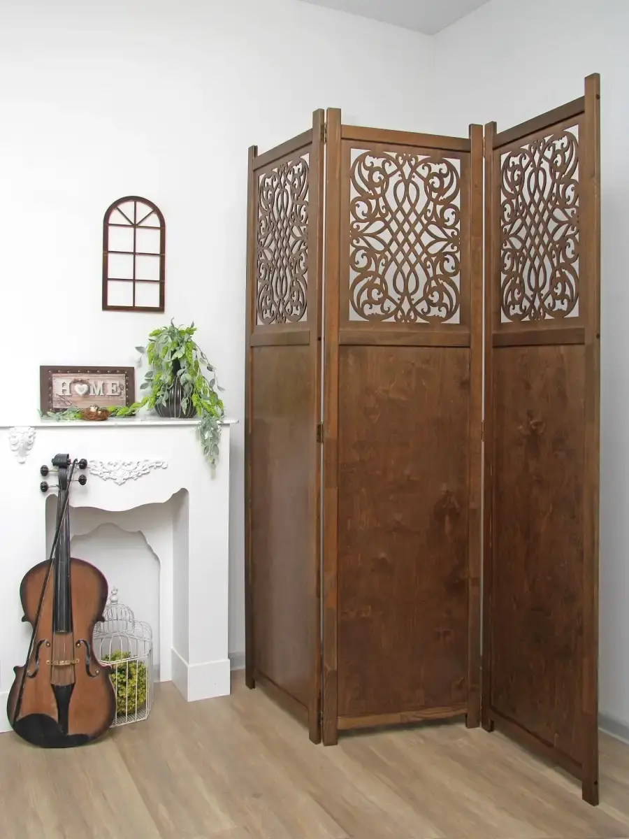 Ширма напольная с резными вставками "Прованс". Деревянная ширма - перегородка для зонирования помещений, студий, современных интерьеров. Рама ширмы выполнена из массива сосны ширина 4 см. и толщиной 2см., покрыта натуральным акриловым лаком. Вставки из березовой фанеры 4 мм. Ширма дополнит и украсит интерьер квартиры, загородного дома, салона красоты. Ширма продается в собранном виде. Вам останется только достать из коробки, снять упаковку и поставить ее на выбранное место. Размер створки ширмы 1800х480 мм. В разврнутом виде трехстворчатая ширма шириной 144см. Ширма изготовлена в России.