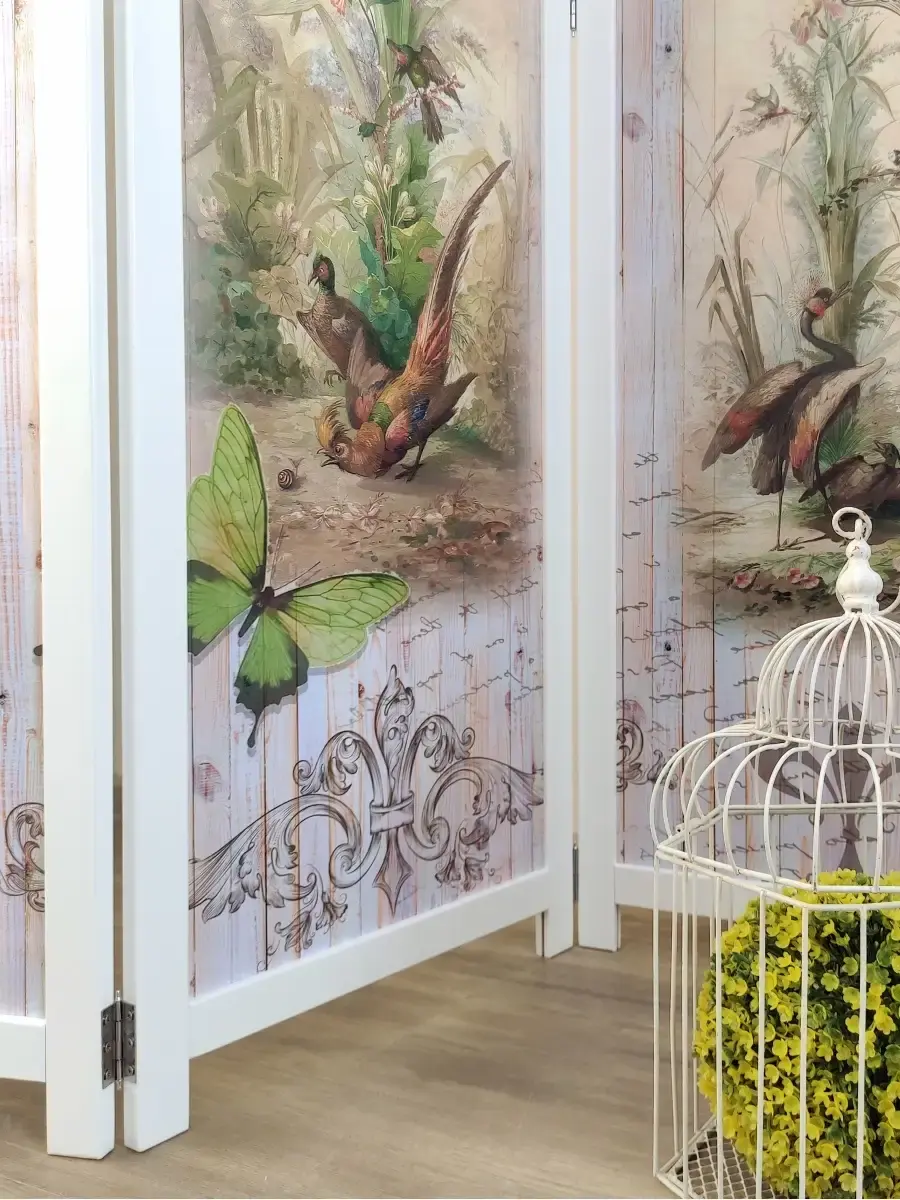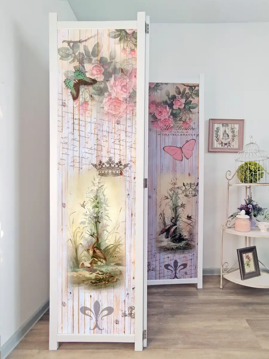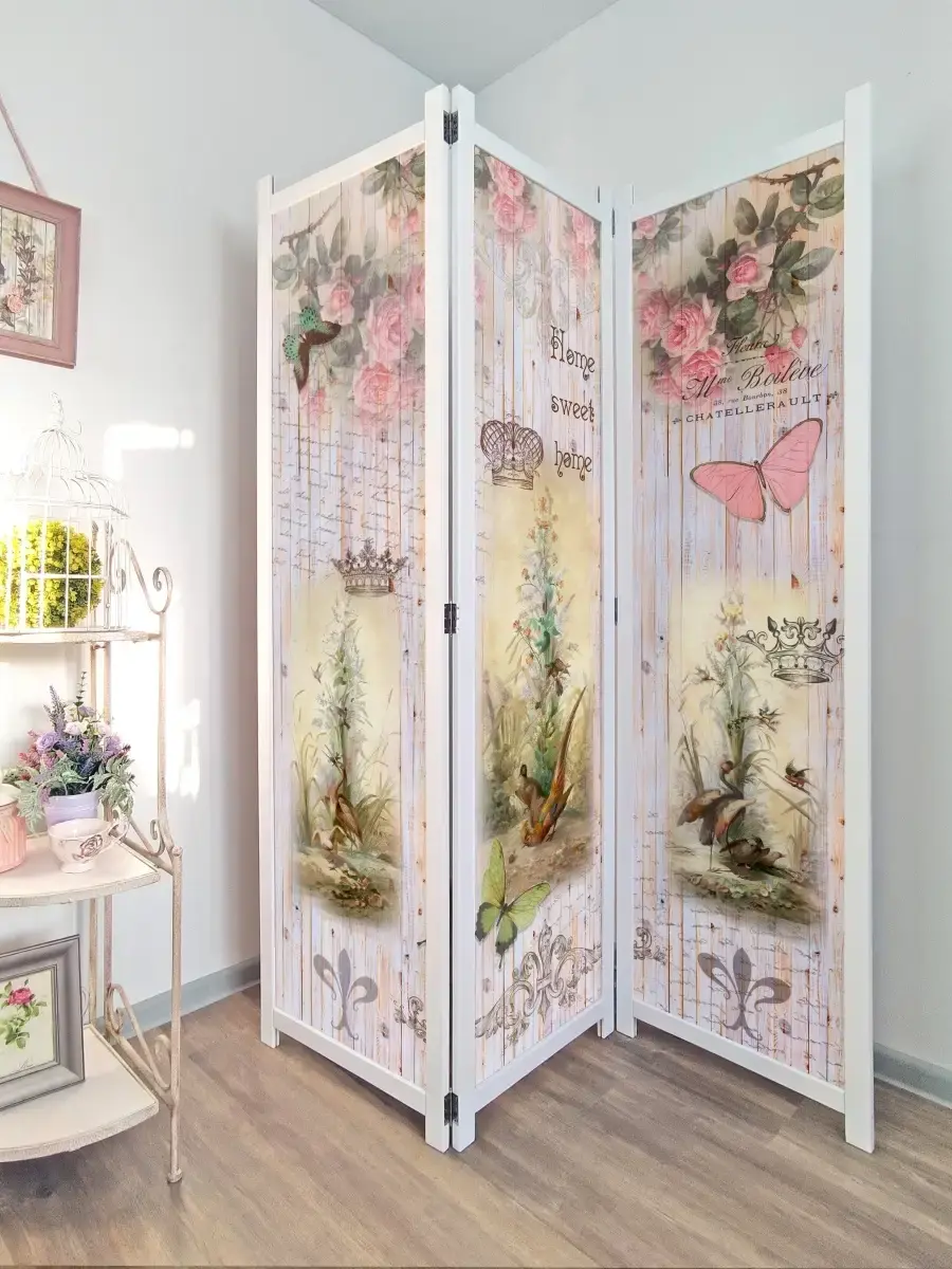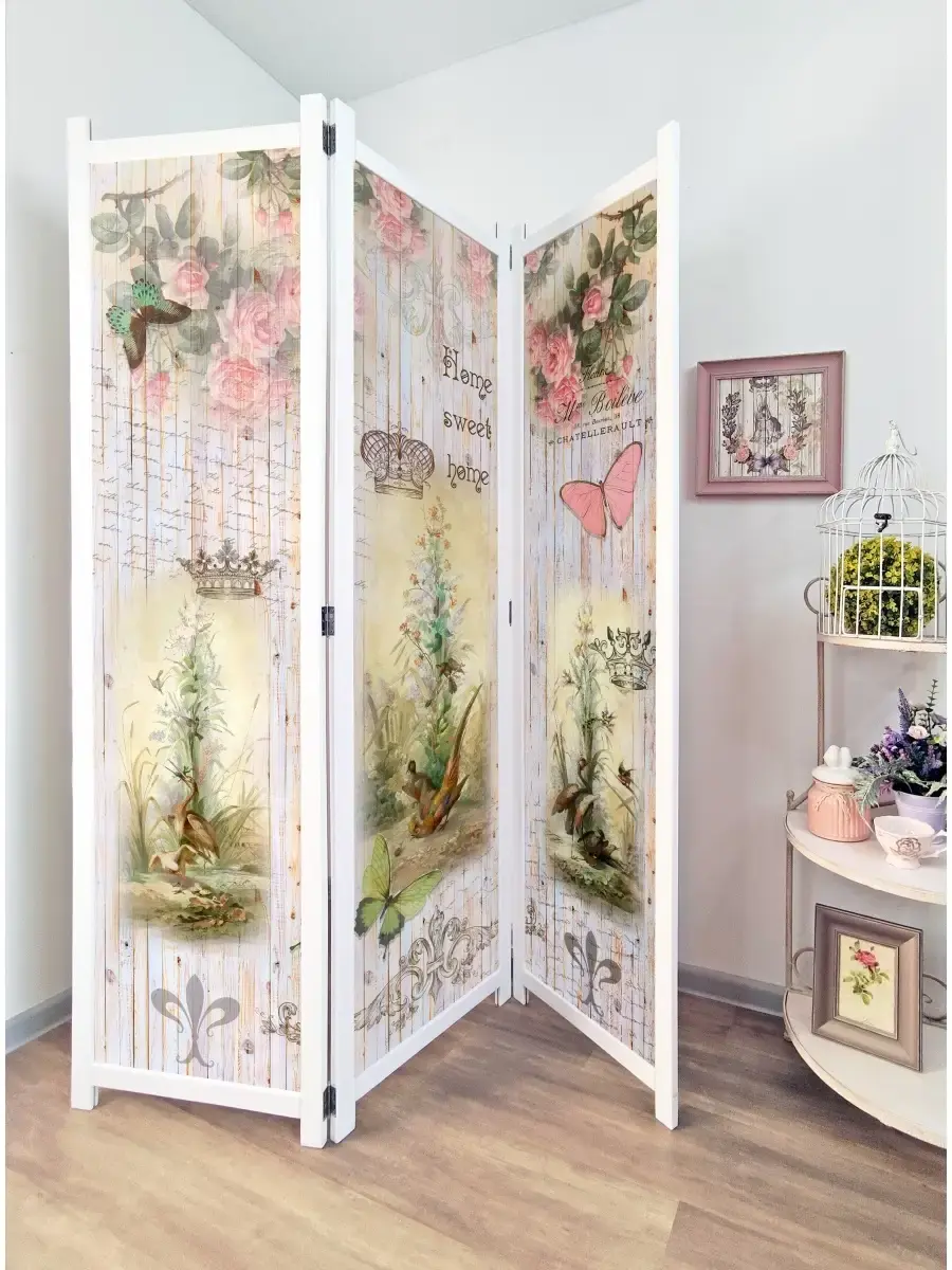 Интерьерная деревянная, напольная ширма с рисунком. Ширма выполнена из массива дерева и окрашена акриловой эмалью без запаха, ставки из ХДФ 3 мм с рисунком в стиле Прованс "Райские птички", "Старый город", "Бабочки". Ширма-перегородка двусторонняя имеет одинаковый рисунок или разный как на фото, в зависимости от модели, петли поворотные на 360 градусов (ширму можно устанавливать "гармошкой" или буквой "П"). Ширмы применяются для зонирования помещений в квартире, загородном доме, офисе, косметическом кабинете, салона красоты, магазинах одежды. Рисунок - полноцветная печать в высоком разрешении плюс горячая ламинация, что обеспечивает защиту изображения от воды, солнечного света, механического воздействия, можно протирать влажной тканью. Ширма продается в собранном виде. Вам останется только снять упаковку и поставить ее на выбранное место. Размер каждой створки ширмы 180см х 48см, в развернутом виде ширма закрывает 140см. Ширмы изготовлены в России.