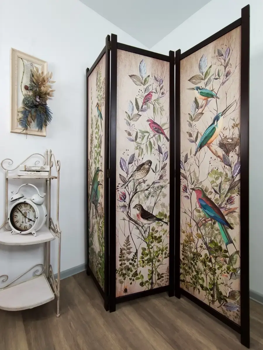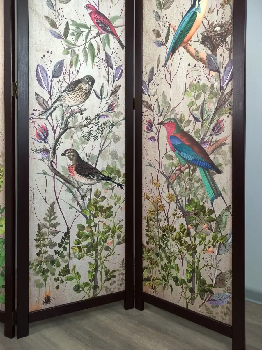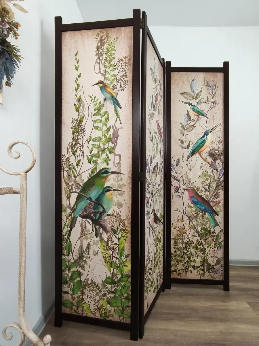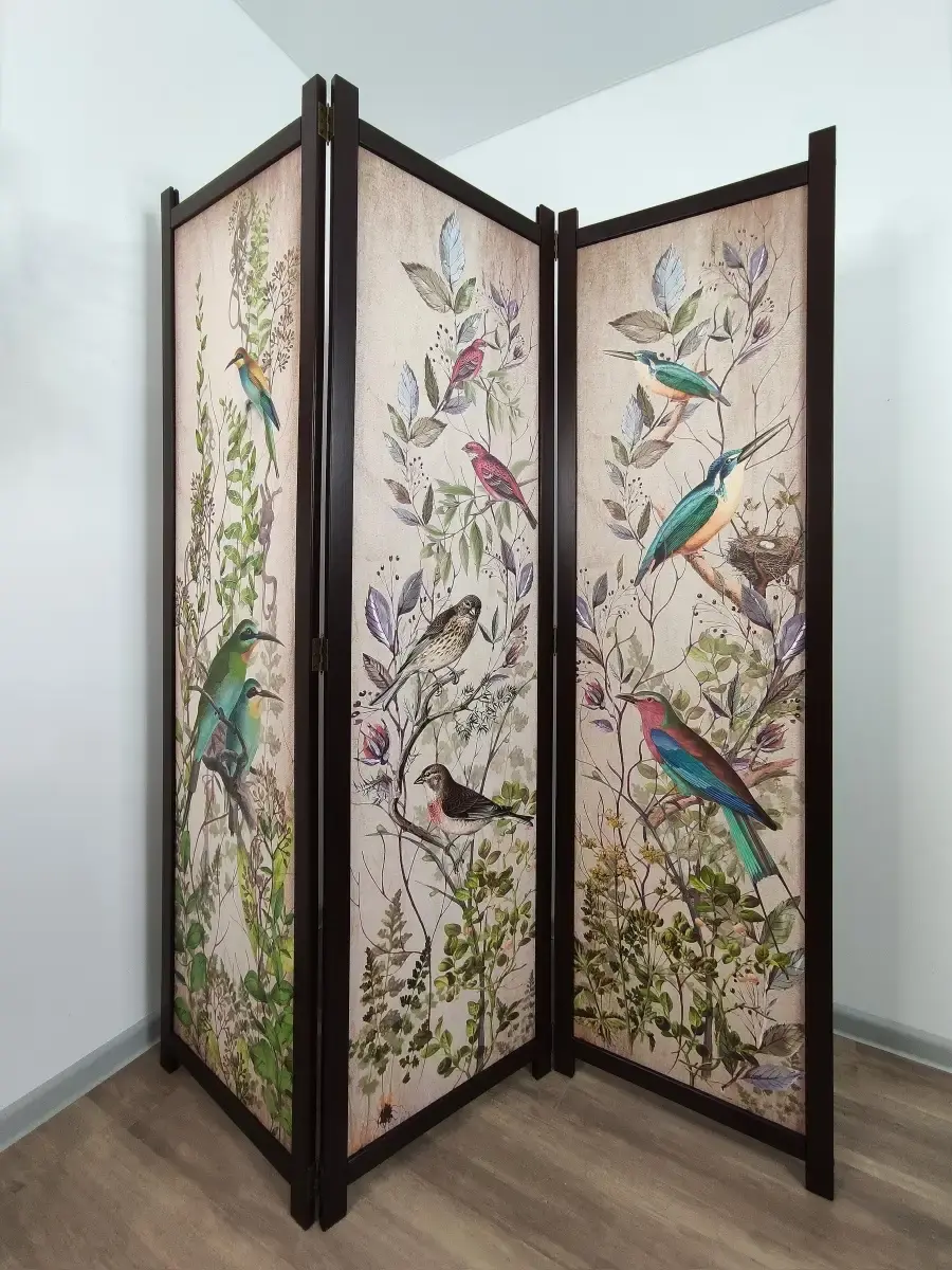 Интерьерная деревянная, напольная ширма с рисунком. Ширма выполнена из массива дерева и окрашена акриловой эмалью без запаха, ставки из ХДФ 3 мм с рисунком в стиле Прованс "Райские птички", "Старый город", "Бабочки". Ширма-перегородка двусторонняя имеет одинаковый рисунок или разный как на фото, в зависимости от модели, петли поворотные на 360 градусов (ширму можно устанавливать "гармошкой" или буквой "П"). Ширмы применяются для зонирования помещений в квартире, загородном доме, офисе, косметическом кабинете, салона красоты, магазинах одежды. Рисунок - полноцветная печать в высоком разрешении плюс горячая ламинация, что обеспечивает защиту изображения от воды, солнечного света, механического воздействия, можно протирать влажной тканью. Ширма продается в собранном виде. Вам останется только снять упаковку и поставить ее на выбранное место. Размер каждой створки ширмы 180см х 48см, в развернутом виде ширма закрывает 140см. Ширмы изготовлены в России.