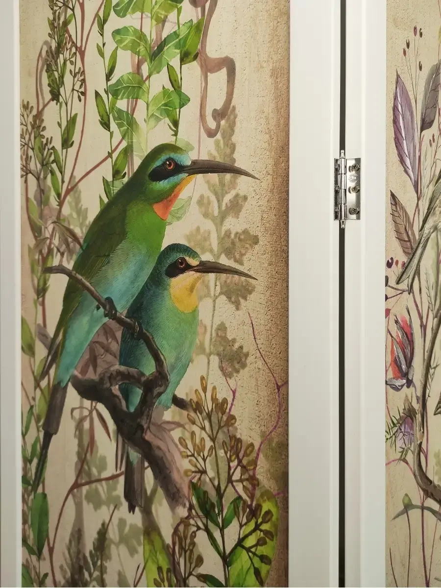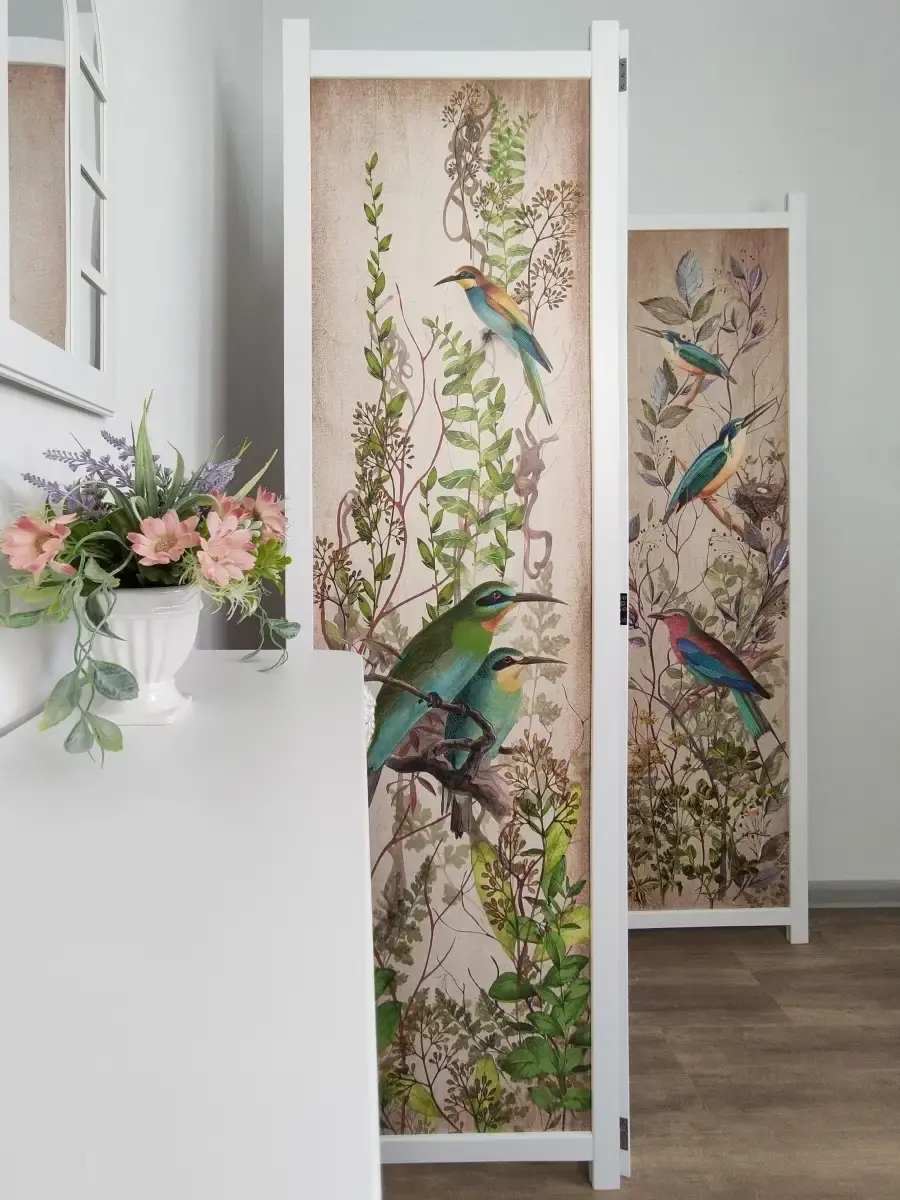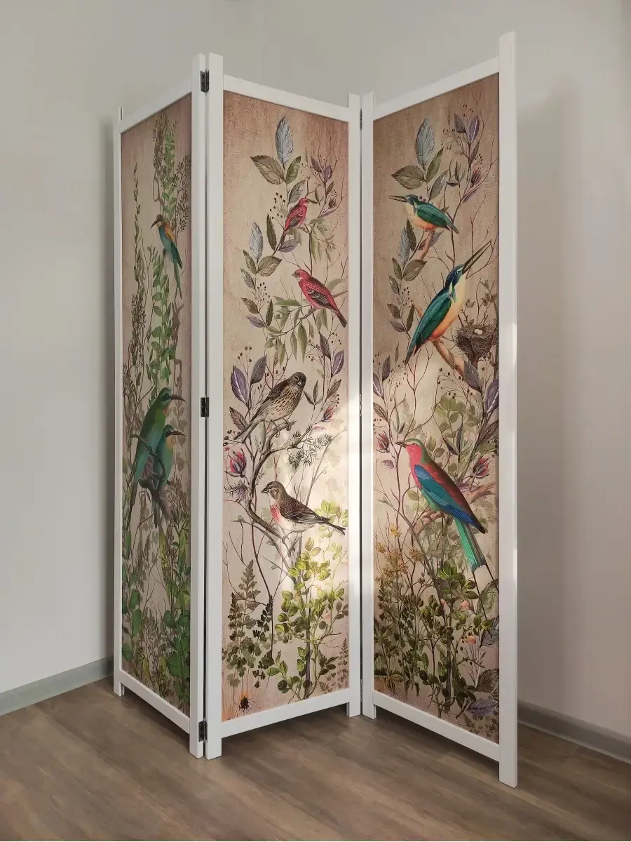 Интерьерная деревянная, напольная ширма с рисунком. Ширма выполнена из массива дерева и окрашена акриловой эмалью без запаха, ставки из ХДФ 3 мм с рисунком в стиле Прованс "Райские птички", "Старый город", "Бабочки". Ширма-перегородка двусторонняя имеет одинаковый рисунок или разный как на фото, в зависимости от модели, петли поворотные на 360 градусов (ширму можно устанавливать "гармошкой" или буквой "П"). Ширмы применяются для зонирования помещений в квартире, загородном доме, офисе, косметическом кабинете, салона красоты, магазинах одежды. Рисунок - полноцветная печать в высоком разрешении плюс горячая ламинация, что обеспечивает защиту изображения от воды, солнечного света, механического воздействия, можно протирать влажной тканью. Ширма продается в собранном виде. Вам останется только снять упаковку и поставить ее на выбранное место. Размер каждой створки ширмы 180см х 48см, в развернутом виде ширма закрывает 140см. Ширмы изготовлены в России.