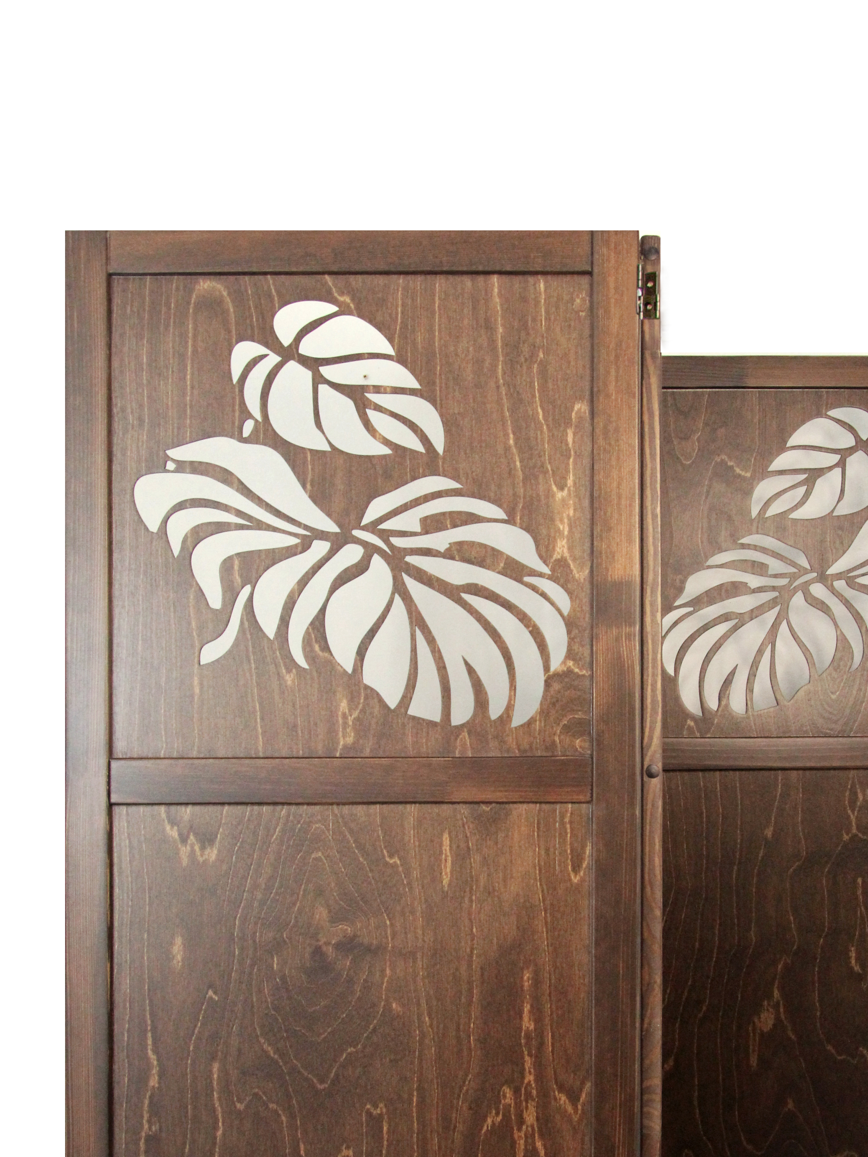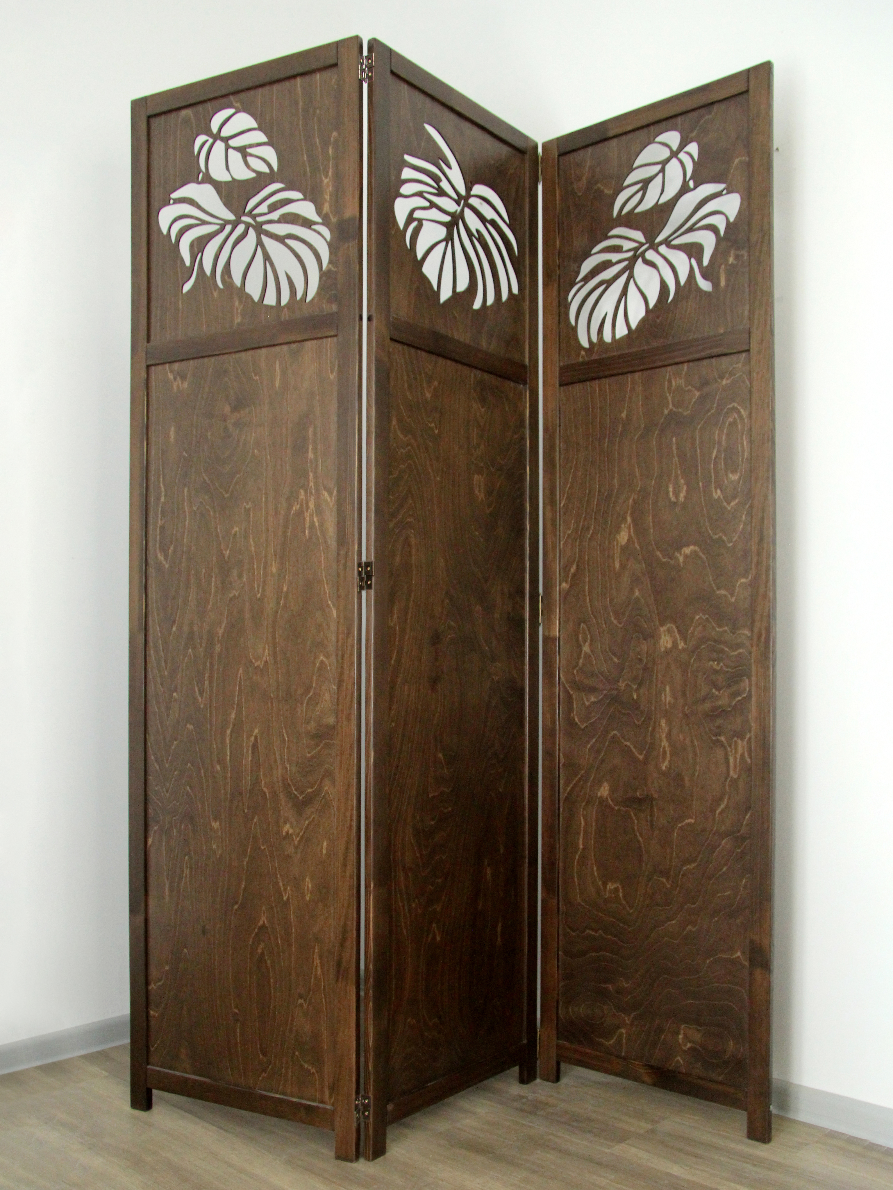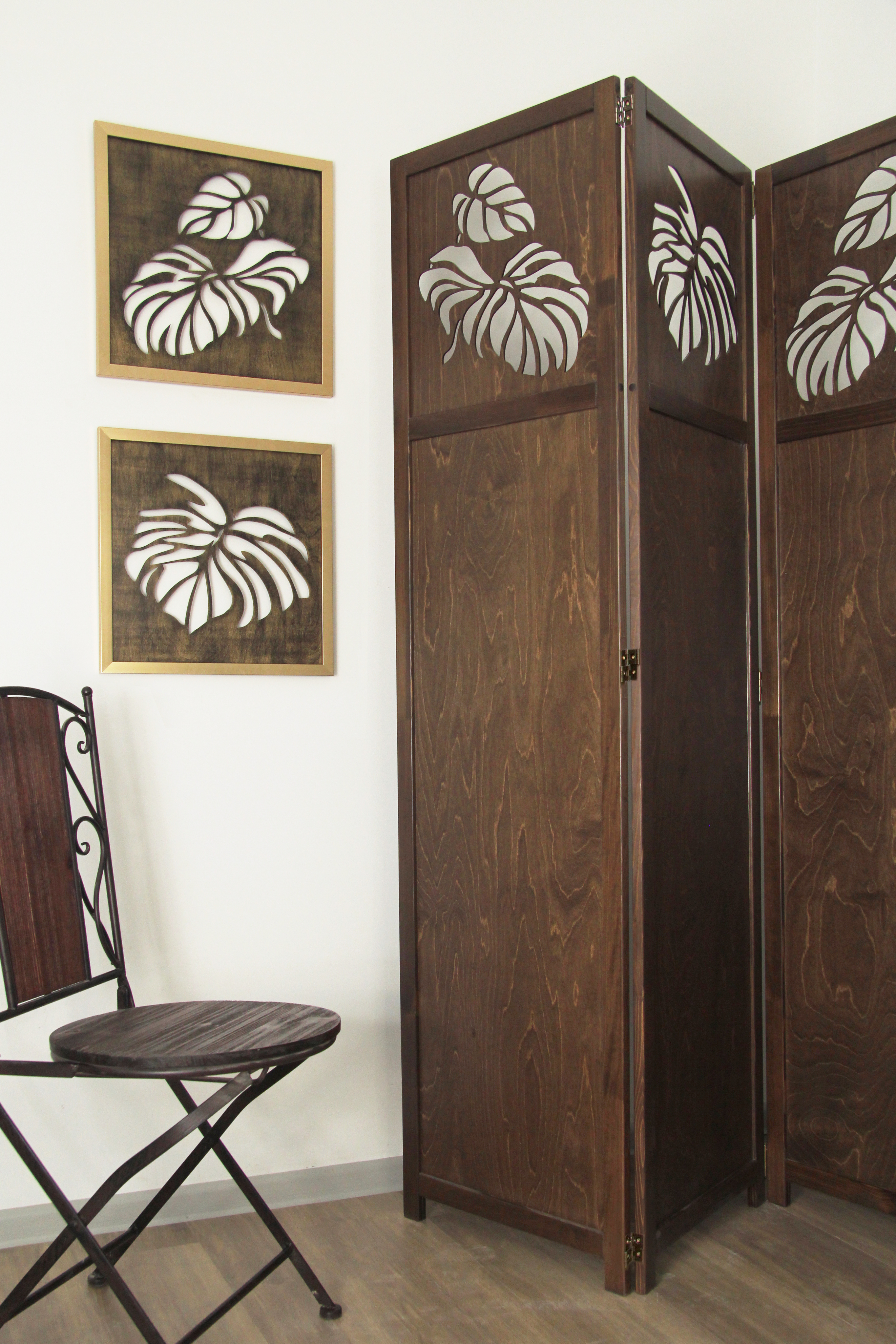 Ширма для комнаты - перегородка с резными вставками "Монстера". С обеих сторон ширма - перегородка двусторонняя имеет одинаковый рисунок, можно поставить ширму в любое положение на ваше усмотрение. Рама ширмы выполнена из высококачественной сосны и окрашена акриловой морилкой без запаха в коричневый цвет с сохранением структуры дерева. Вставки из МДФ. Ширма дополнит и украсит интерьер квартиры, загородного дома, салона красоты. Ширма продается в собранном виде. Вам останется только снять упаковку и поставить ее на выбранное место. Размер створки ширмы 1800*480 мм.