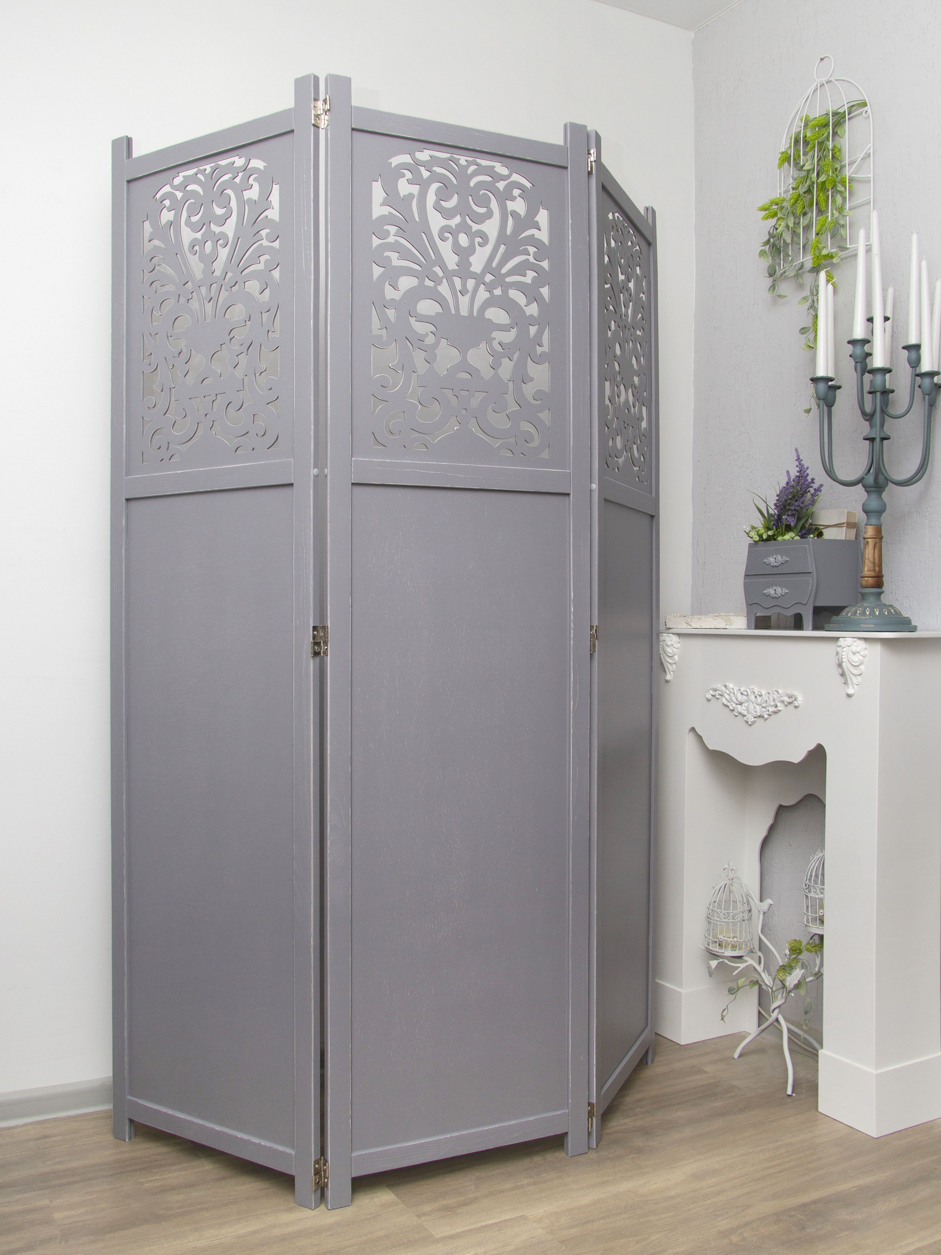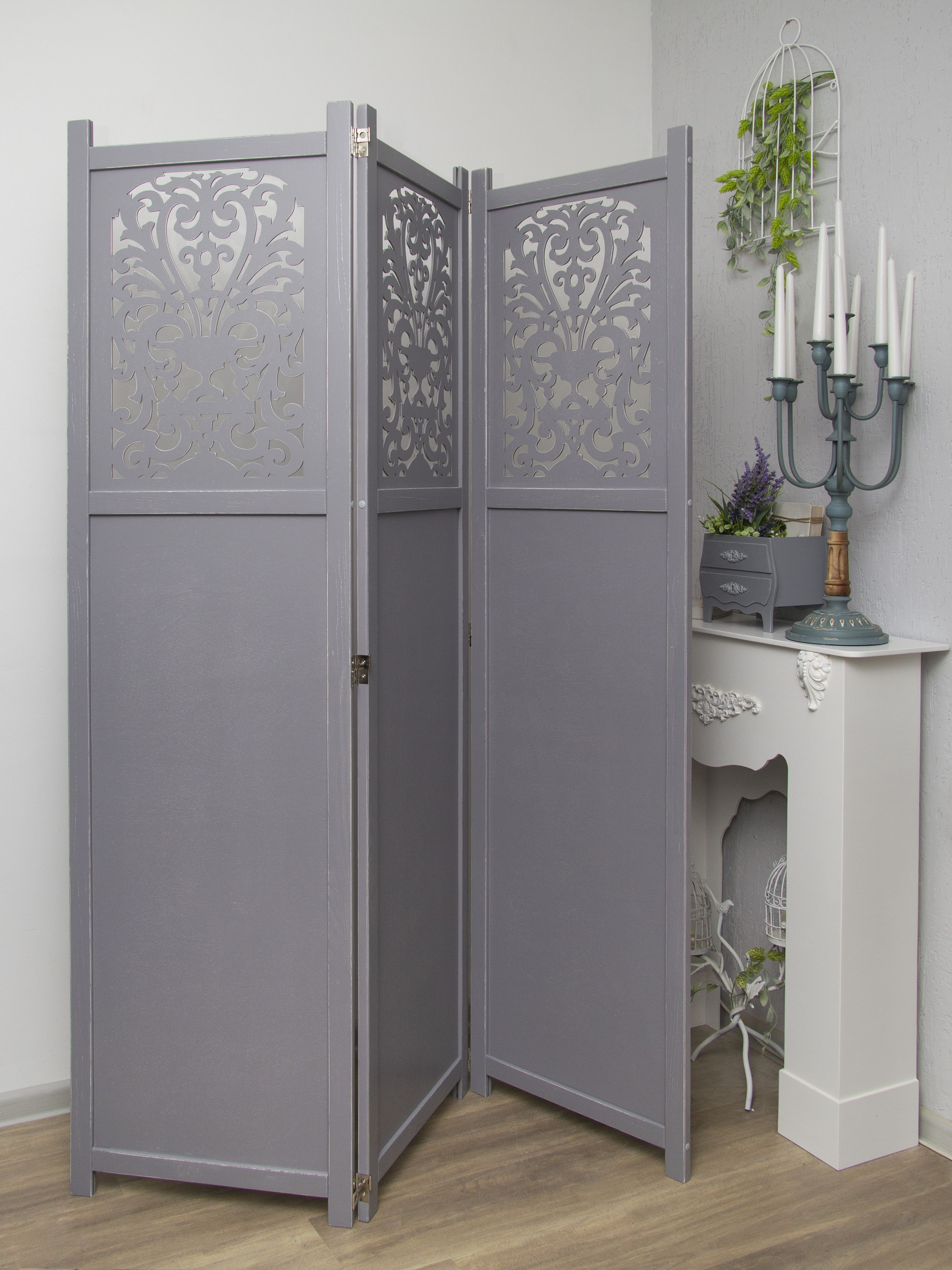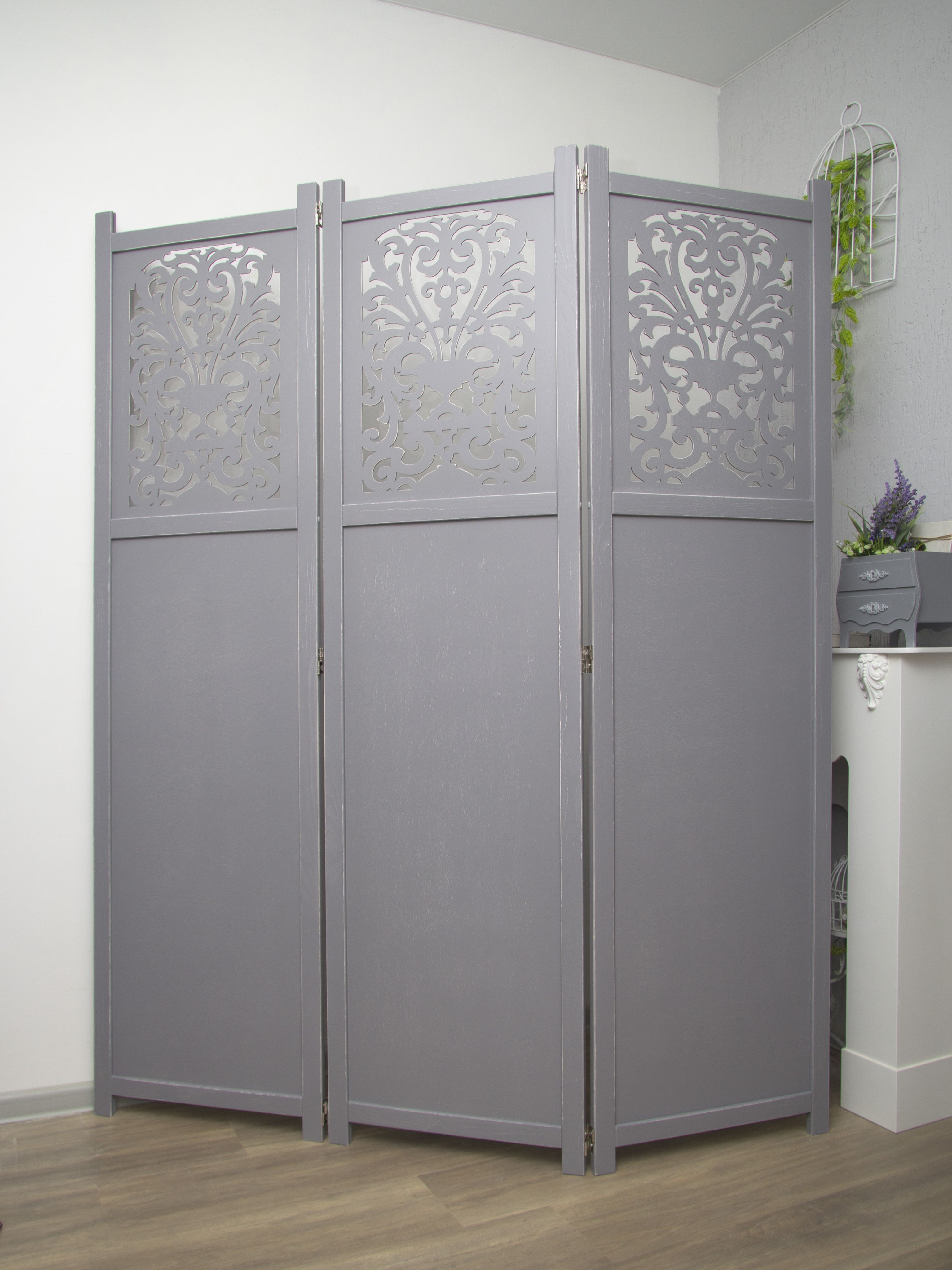 Ширма для комнаты - перегородка с резными вставками "Прованс". С обеих сторон ширма - перегородка двусторонняя имеет одинаковый рисунок, можно поставить ширму в любое положение на ваше усмотрение. Рама ширмы выполнена из высококачественной сосны и окрашена акриловой эмалью без запаха в серый цвет. Вставки из березовой фанеры 4 мм. Ширма дополнит и украсит интерьер квартиры, загородного дома, салона красоты. Ширма продается в собранном виде. Вам останется только снять упаковку и поставить ее на выбранное место. Размер створки ширмы 1800*480 мм. На ширму установлены поворотные петли. Перегородка Elenadecor для зонирования комнаты. Ширма декоративная для салона красоты, офиса, кафе. Межкомнатный разделитель интерьерный для дизайна дома, гостиной и детской.