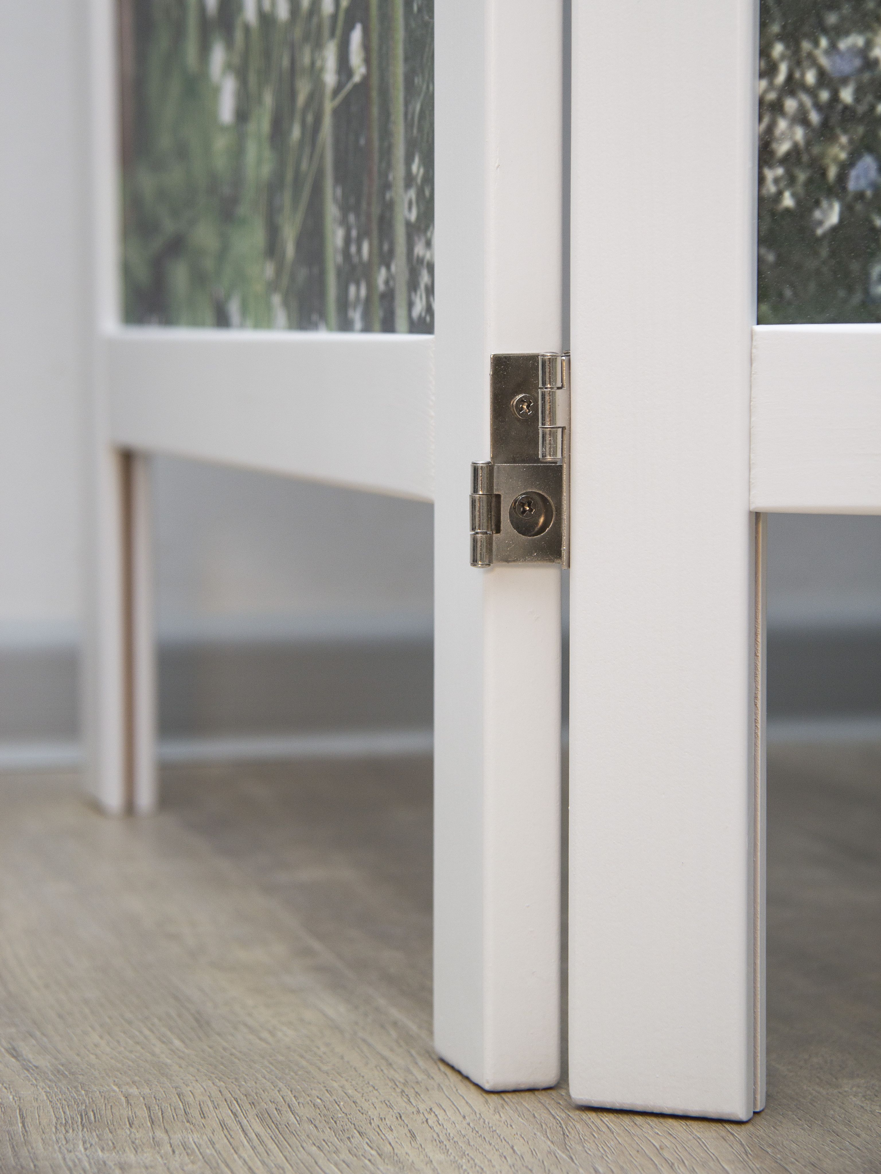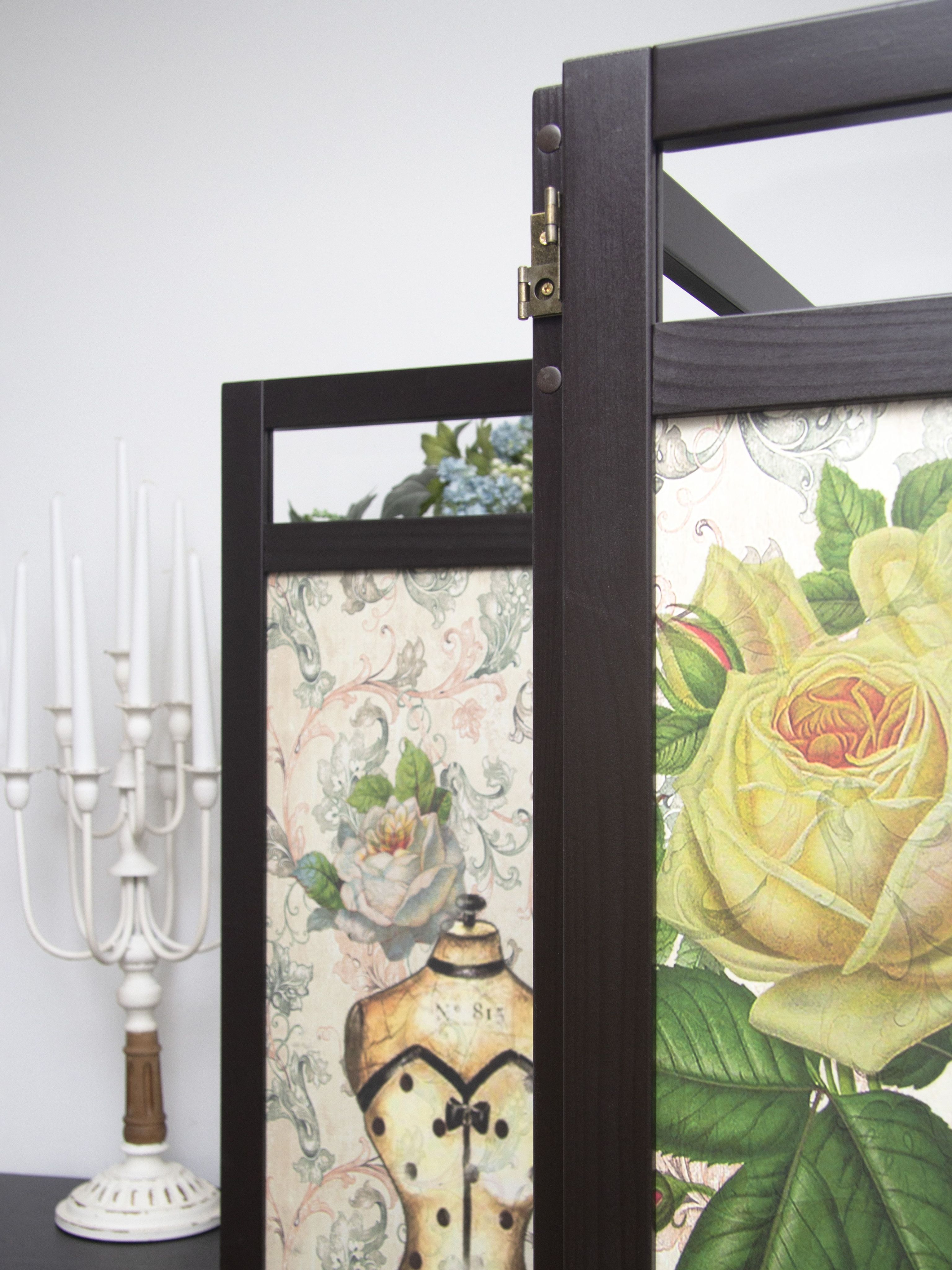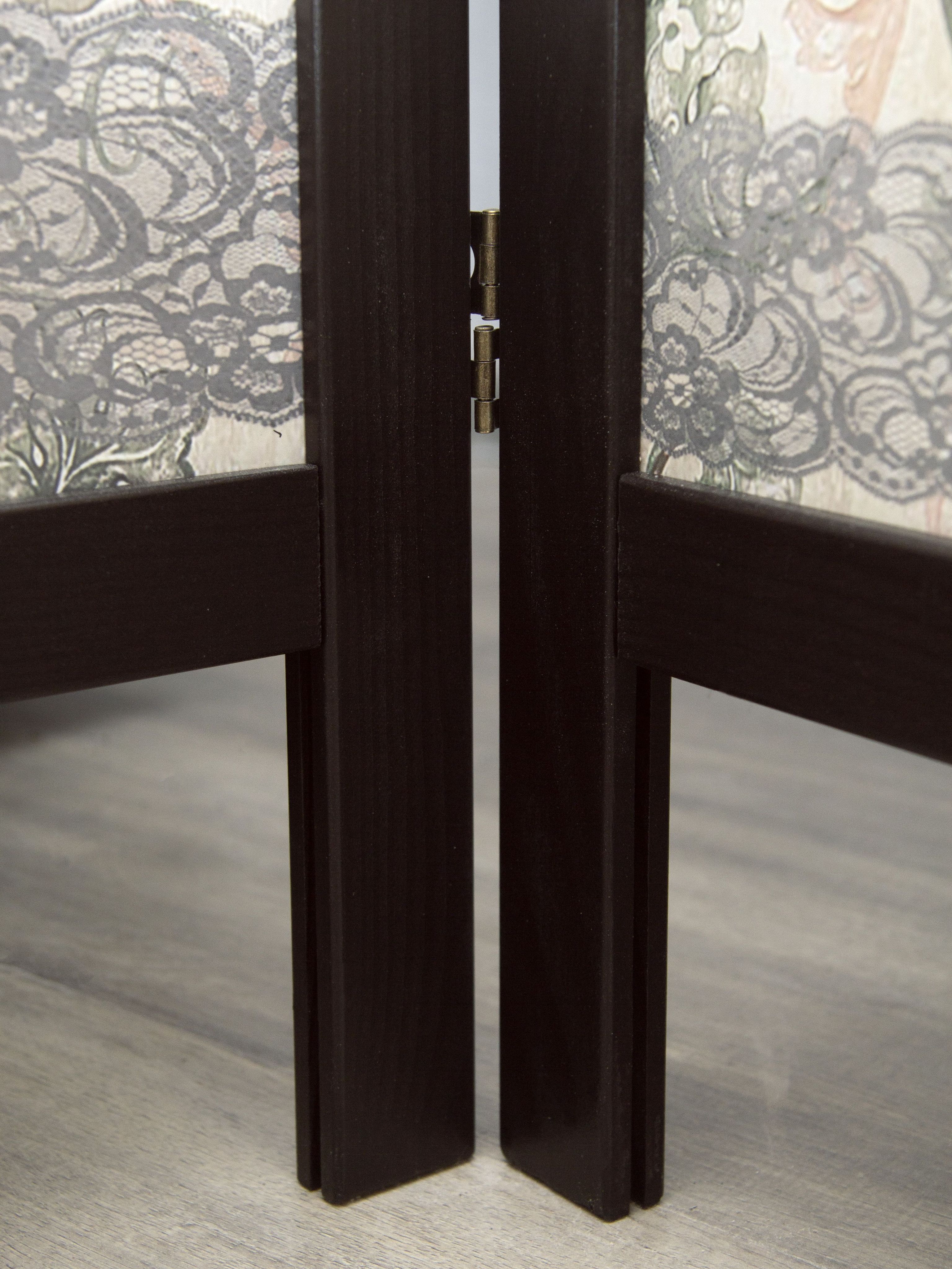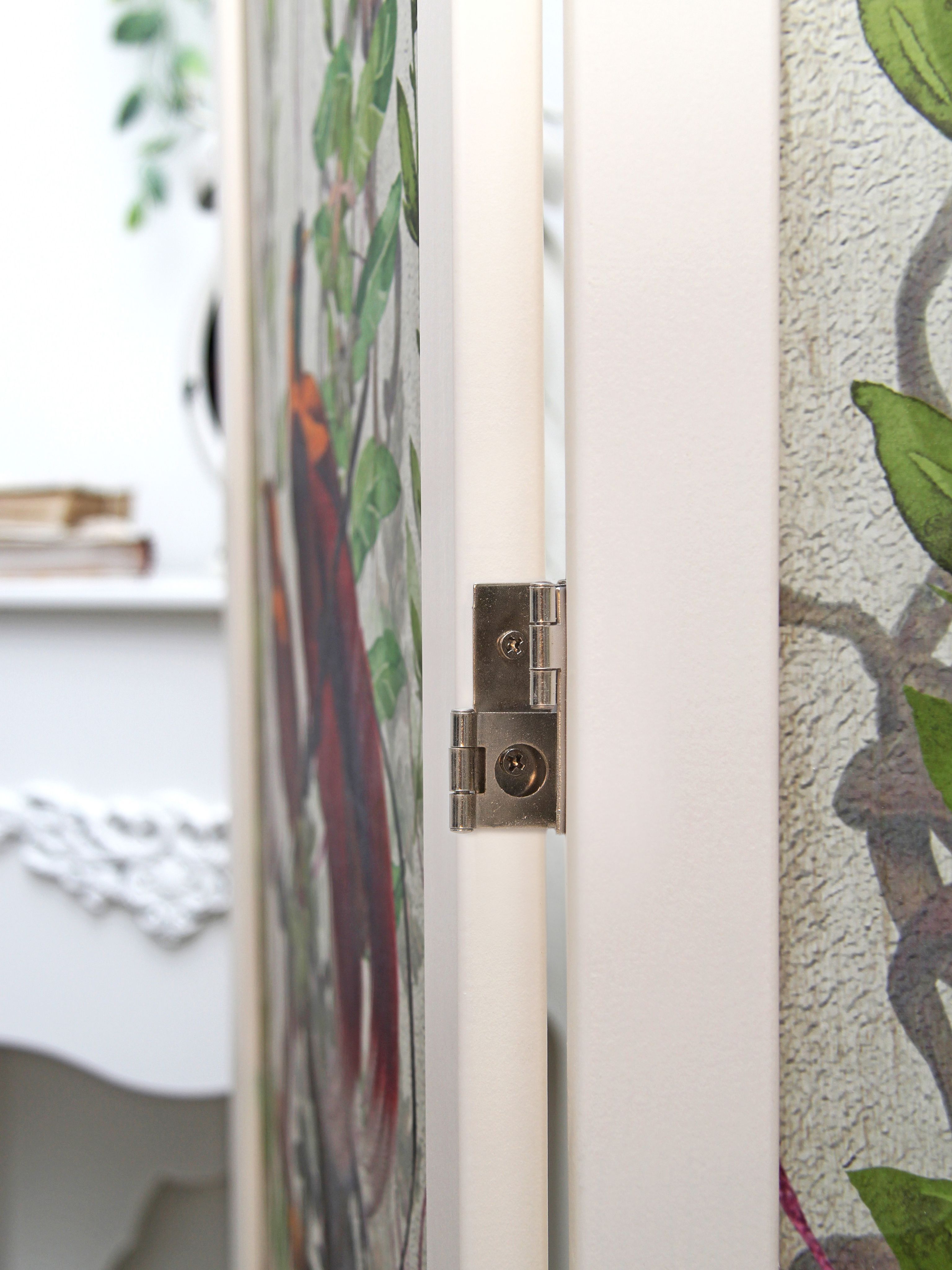 Рама ширмы с рисунком выполнена из высококачественной сосны и окрашена акриловой эмалью без запаха в белый цвет.