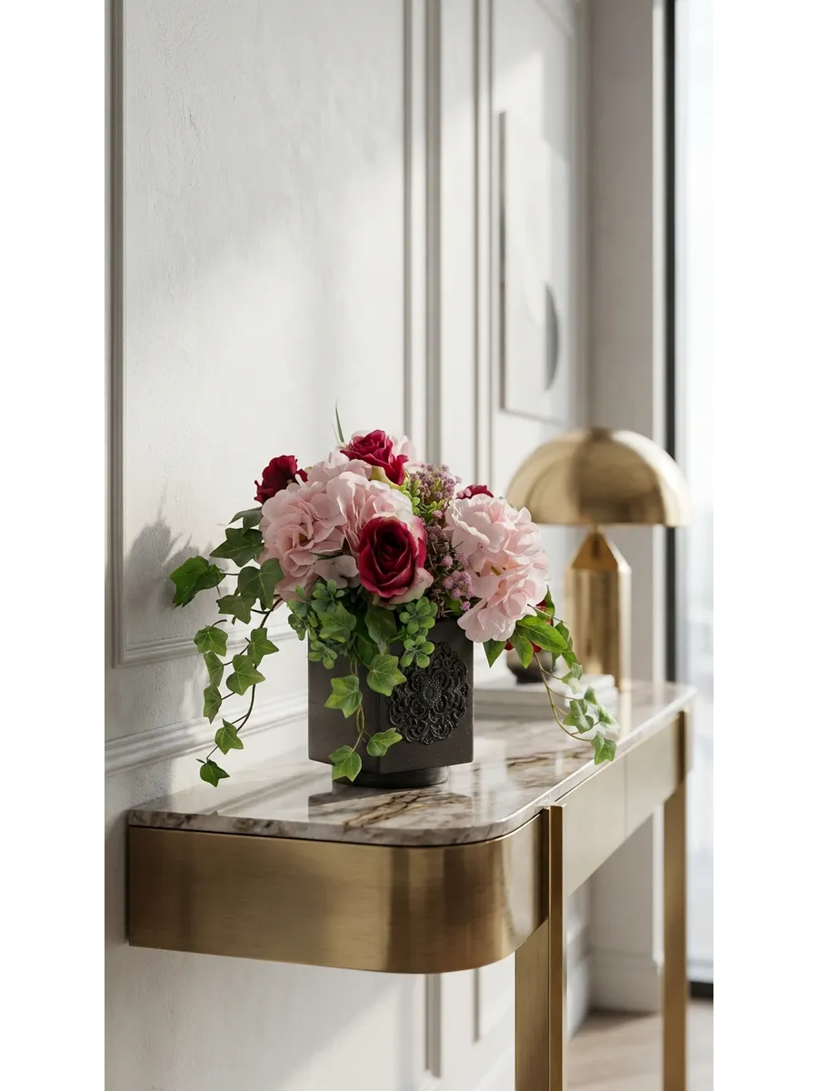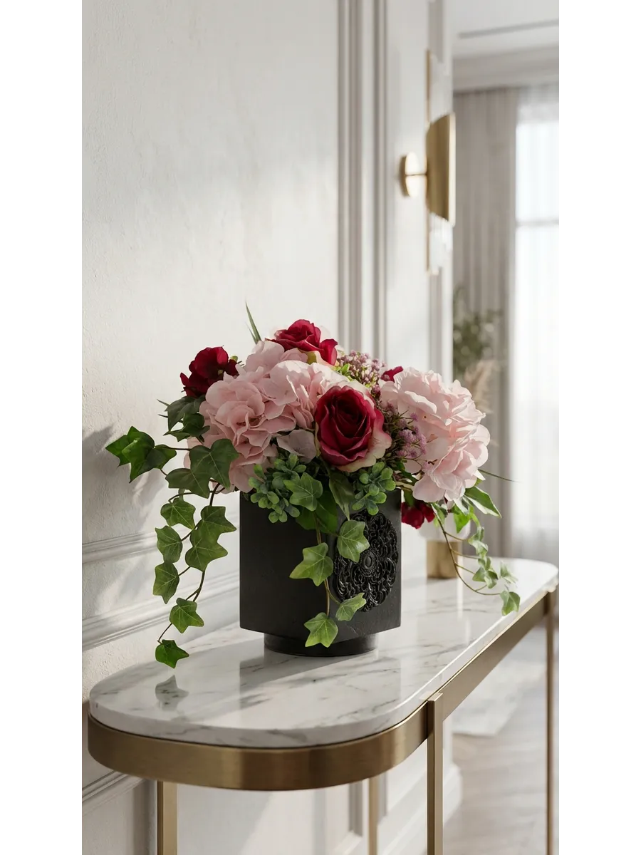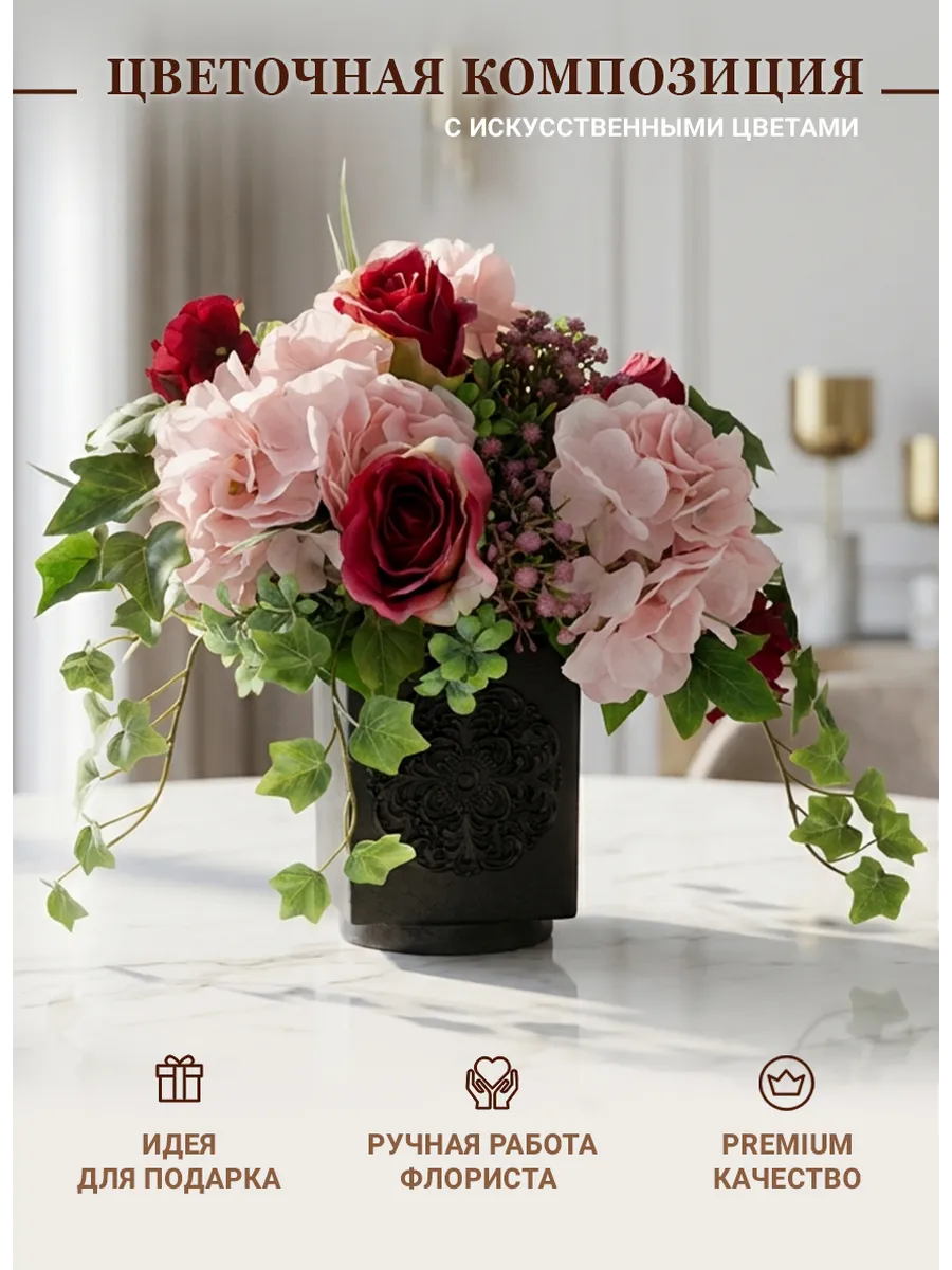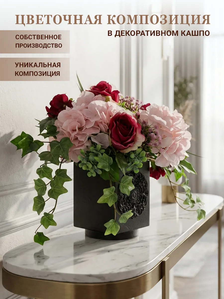 Элегантная цветочная композиция в тёмном кашпо создаёт выразительный акцент в интерьере и добавляет пространству глубину и уют. Благородные розы, пышные гортензии и декоративная зелень выглядят максимально натурально и сохраняют безупречный вид круглый год.