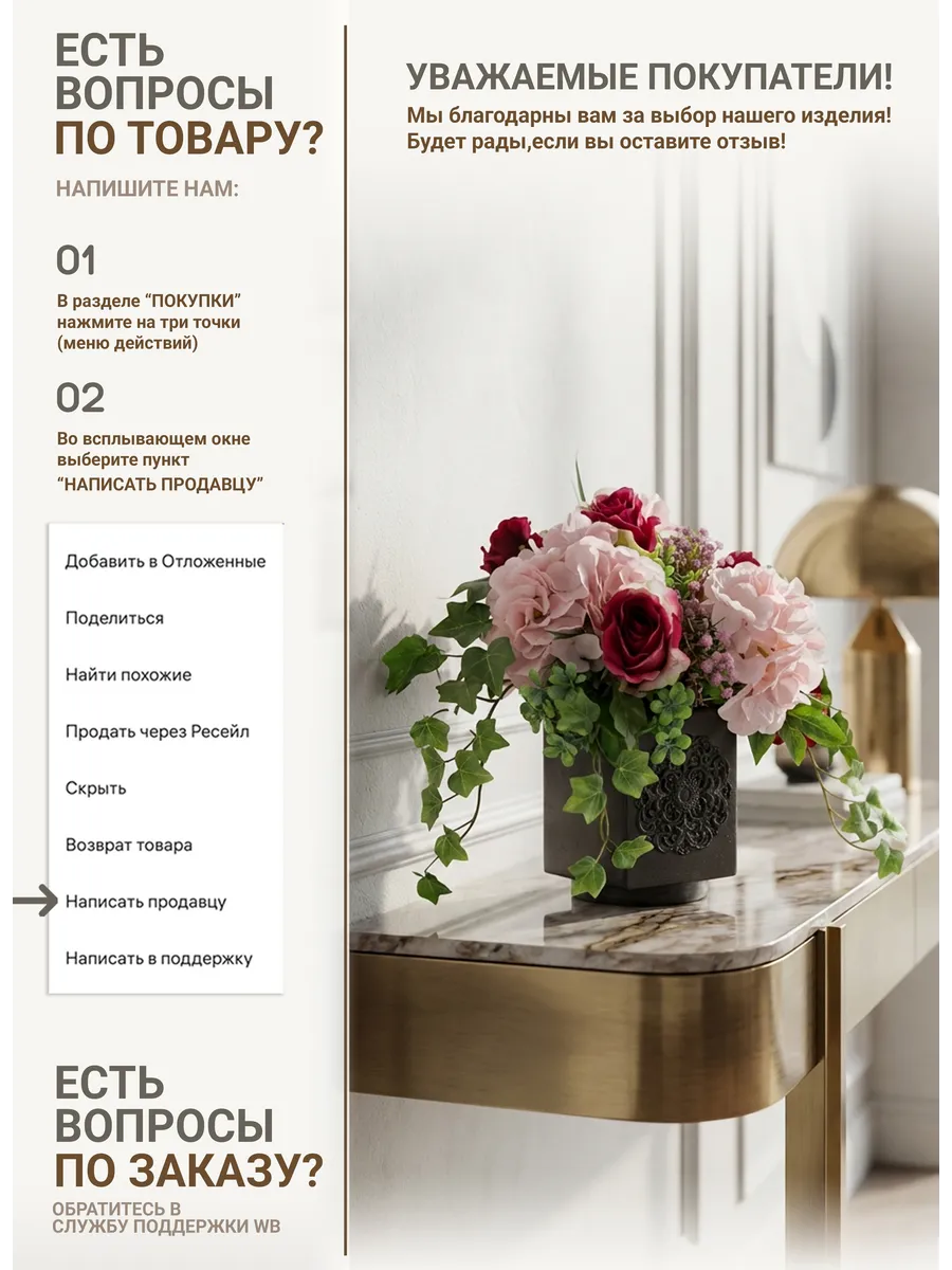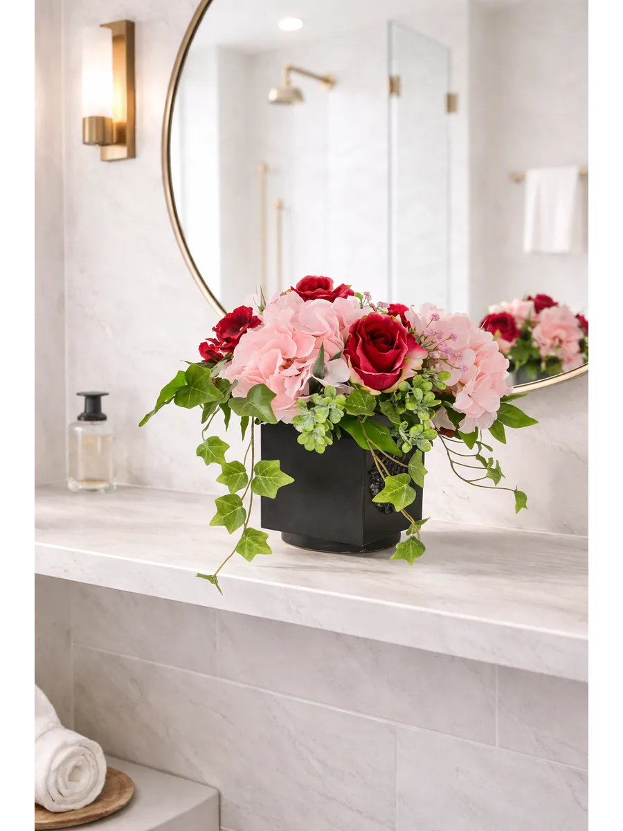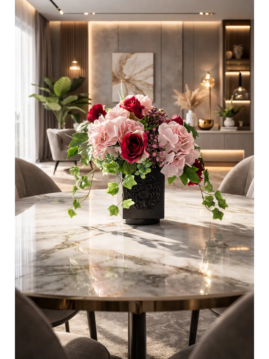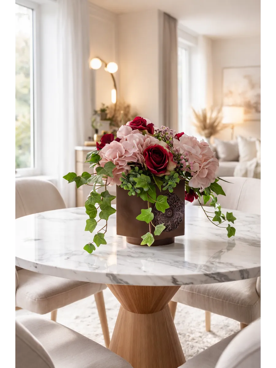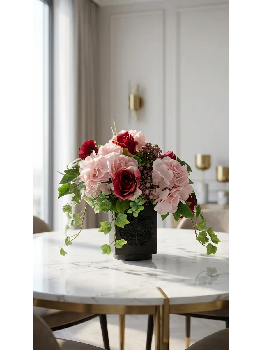 Элегантная цветочная композиция в тёмном кашпо создаёт выразительный акцент в интерьере и добавляет пространству глубину и уют. Благородные розы, пышные гортензии и декоративная зелень выглядят максимально натурально и сохраняют безупречный вид круглый год.