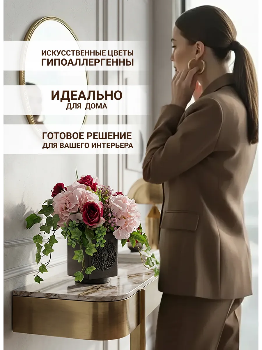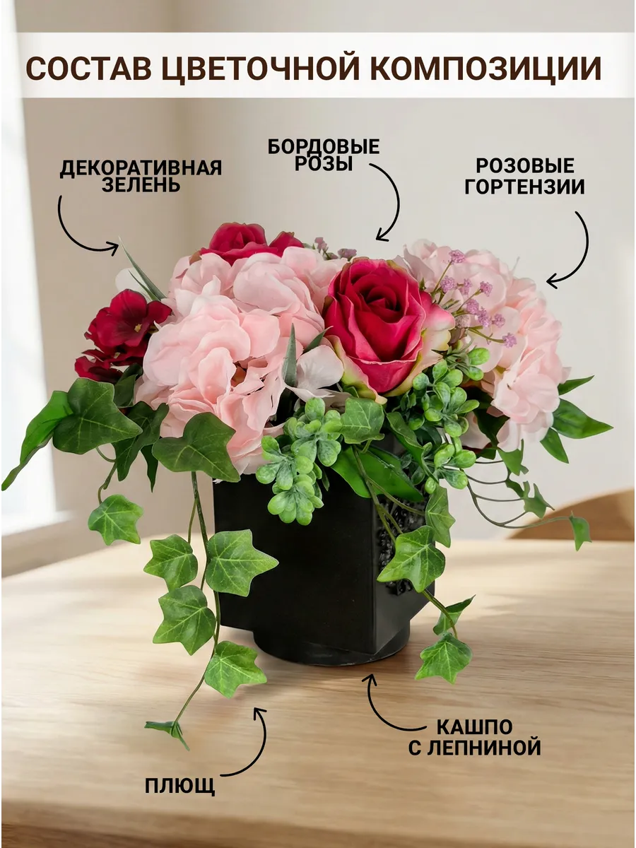 Интерьерная композиция с розами и гортензиями в кашпо — готовый декор без ухода