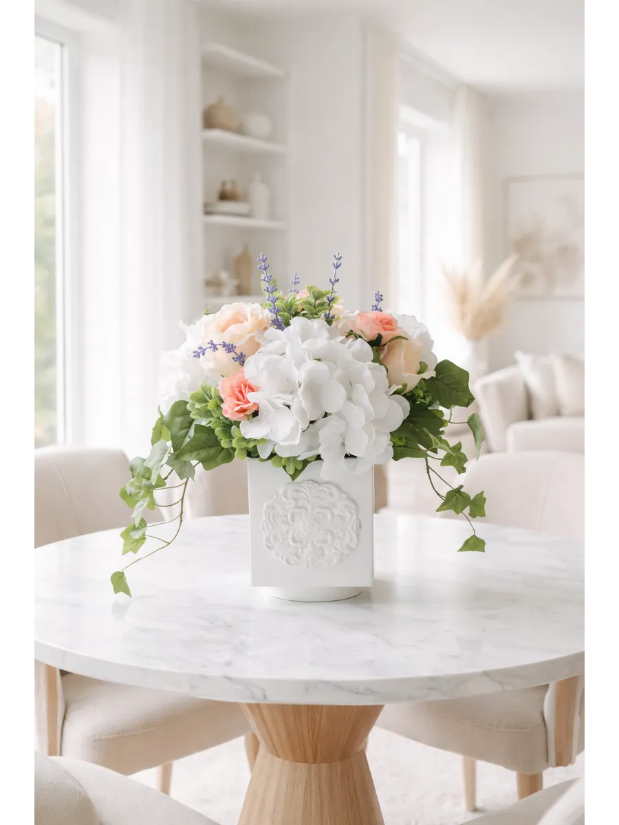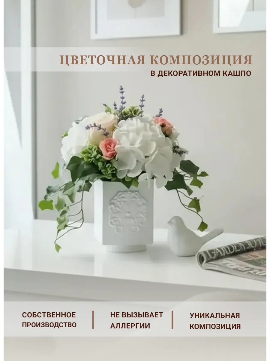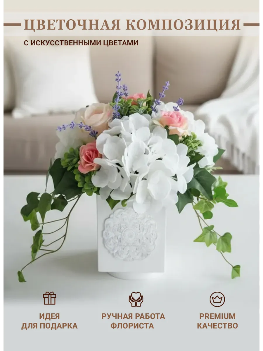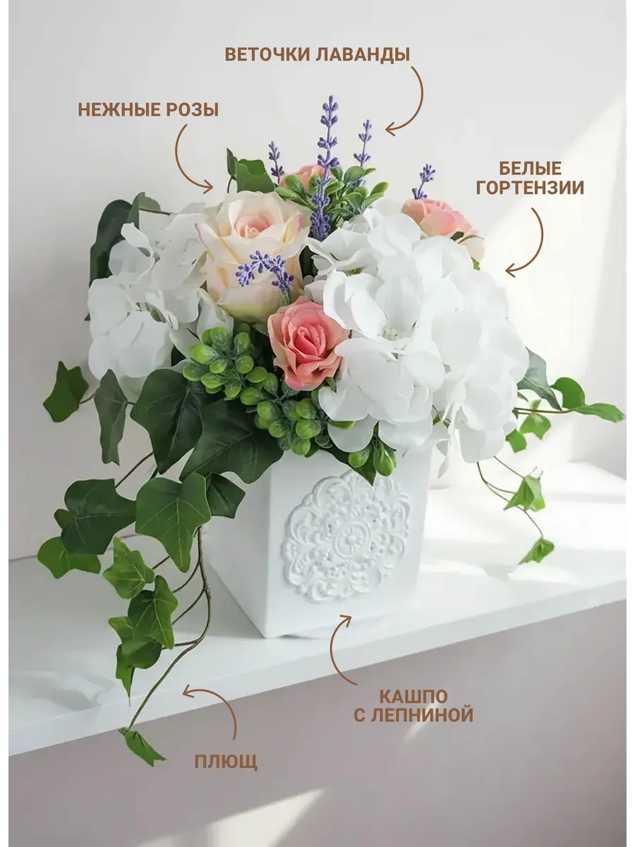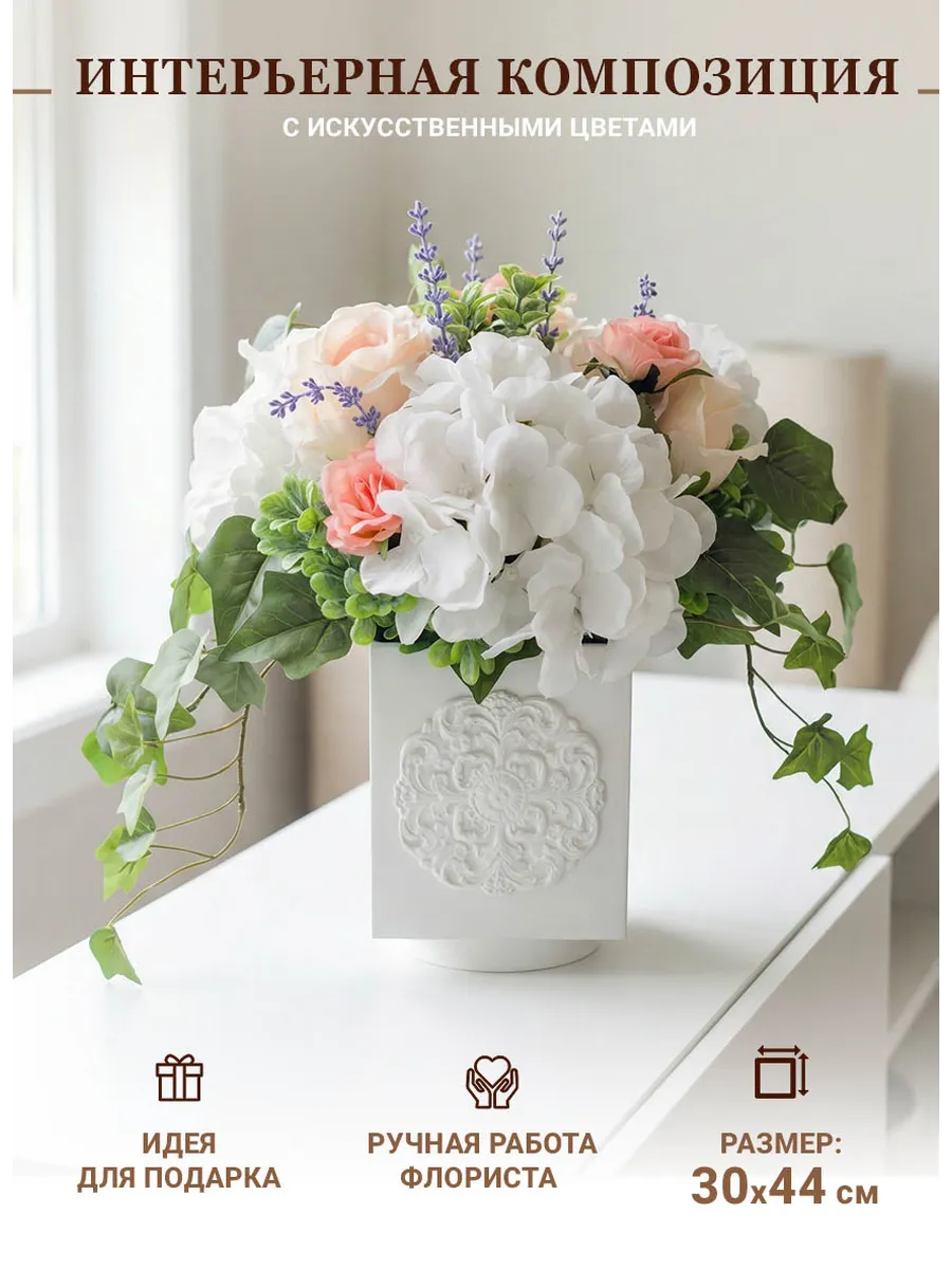 Эта цветочная композиция создаёт ощущение свежести, уюта и «живого» интерьера без ухода за растениями. Воздушные белые гортензии, нежные розово-персиковые бутоны и лёгкие акценты лаванды гармонично сочетаются с зеленью и элегантным кашпо. Идеально вписывается в светлые современные интерьеры: спальню, гостиную, кухню, прихожую или зону ресепшн.