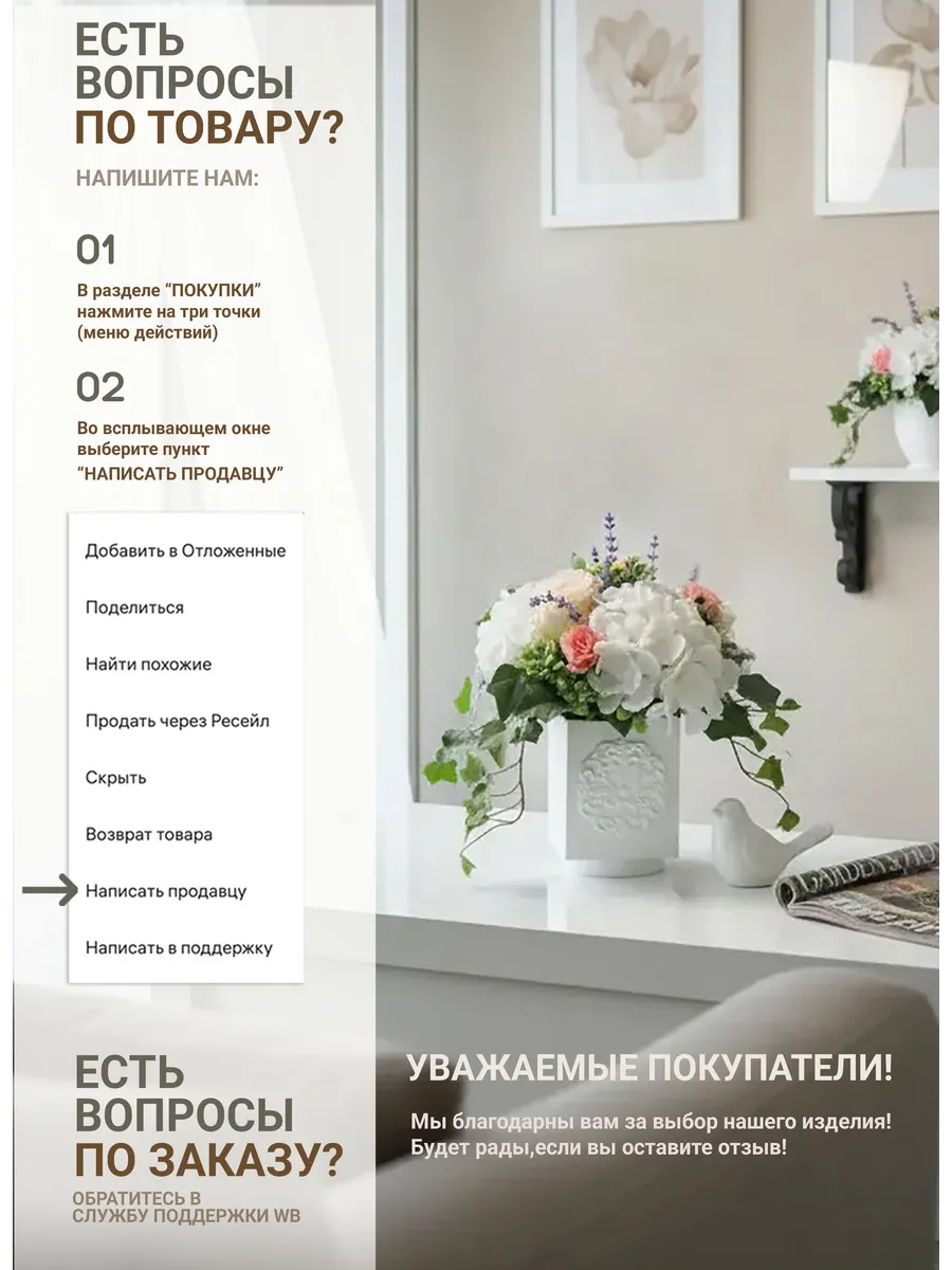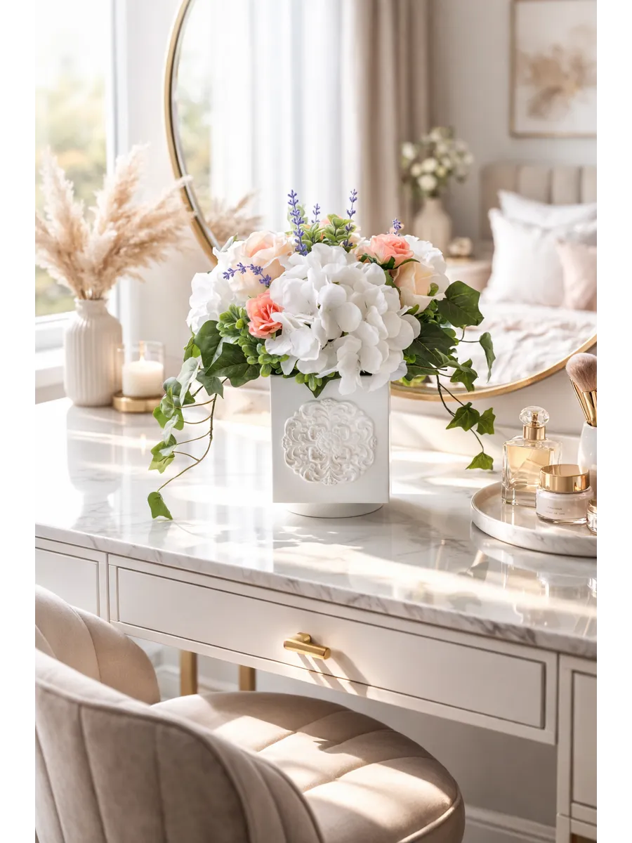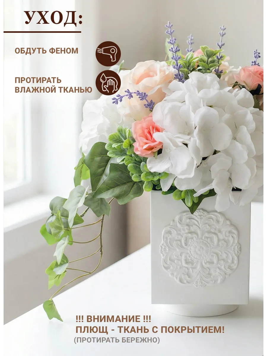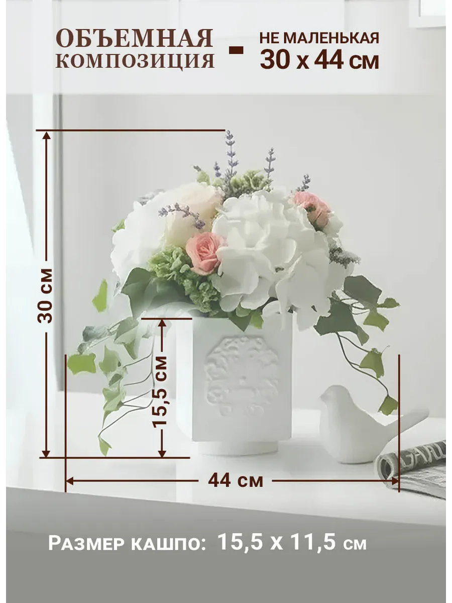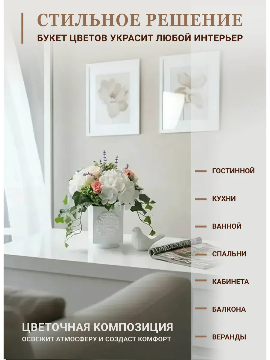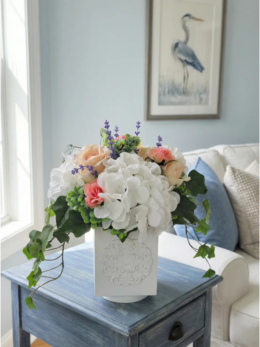 Эта цветочная композиция создаёт ощущение свежести, уюта и «живого» интерьера без ухода за растениями. Воздушные белые гортензии, нежные розово-персиковые бутоны и лёгкие акценты лаванды гармонично сочетаются с зеленью и элегантным кашпо. Идеально вписывается в светлые современные интерьеры: спальню, гостиную, кухню, прихожую или зону ресепшн.