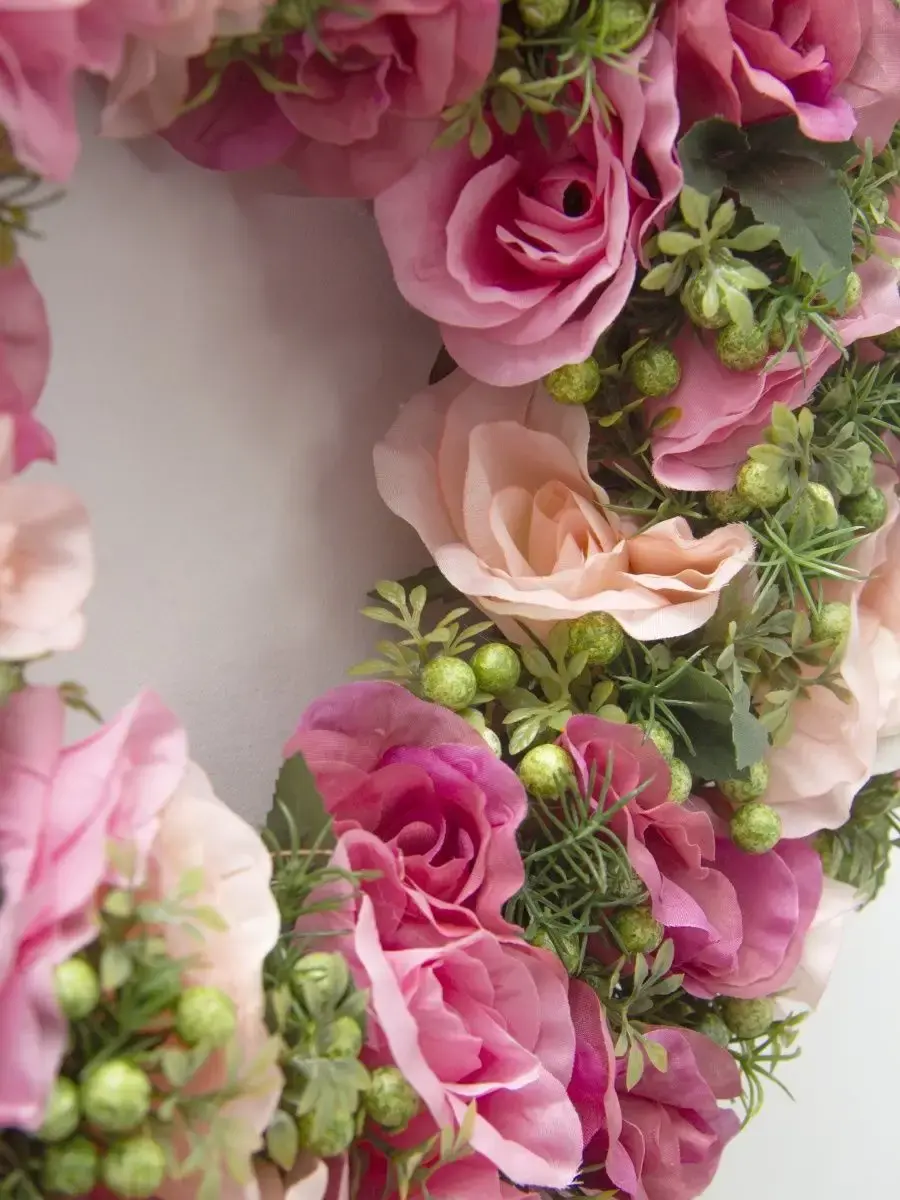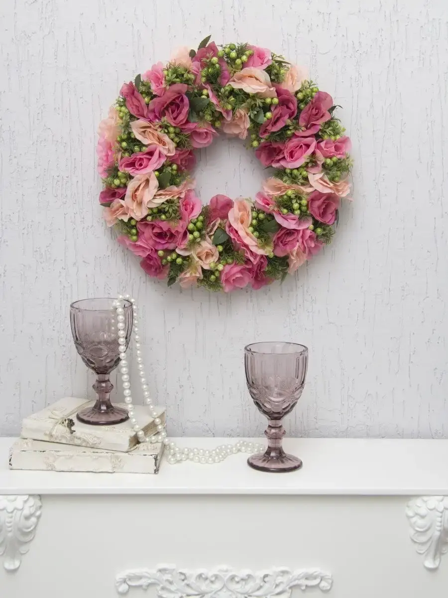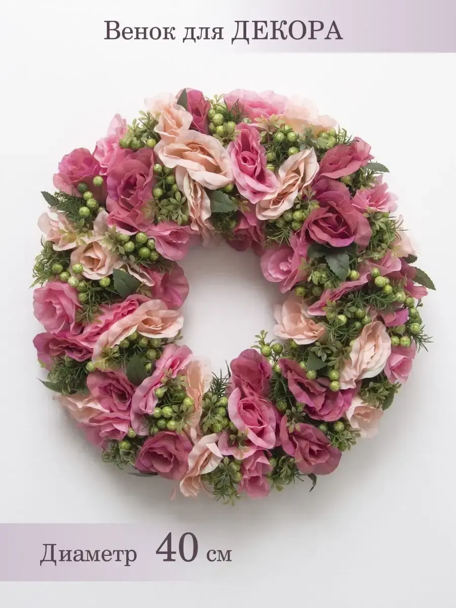 Цветочный венок - это универсальное украшение дома для любого праздника. Он является отличной имитацией настоящих роз. Венки большого размера с диаметром 40 см, чуть меньше- диаметр 32 см. С помощью нарядного венка можно украсить любое помещение в доме или квартире: гостиную, столовую, кабинет, прихожую, детскую комнату и входную зону. Такой декор придаст Вашему интерьеру праздничный вид, наполнит его атмосферой весенней свежести. Венок вешается на дверь или на стену, либо кладется на горизонтальную поверхность и дополняется свечами, фруктами и другими элементами декора. Вы можете разместить венок окне, выходящем на улицу или на входной двери. Венок отлично смотрится над камином или на праздничном столе вместо подсвечника. Он идеален для оформления праздничного декора маленькой квартиры - студии. Красивый венок идеален для декорирования фотостудии - он станет прекрасной декорацией для романтической фотографии. Фотосессия на его фоне получится просто волшебной! Интерьерный венок диаметром 40 см из искусственных цветов и зелени можно повесить на работе, чтобы внести в рабочую атмосферу элементы праздника. Декоративный венок привнесёт в атмосферу Вашего дома ощущение праздника и будет великолепно смотреться, если Вы повесите венок на межкомнатную дверь или на стену. Также Вы можете разместить украшения для дома в центре праздничного стола в качестве центральной композиции торжественной сервировки. Красивым венком можно украсить входную уличную дверь дома, на даче или в офисе или использовать его как настольную подставку для угощений. Венок служит отличным подарком. Красивые подарочные веночки доставляются в картонной коробке. Интерьерные аксессуары и изделия - это предметы творчества, из которых получаются замечательные подарки. Вы можете подарить такой праздничный атрибут маме, жене, любимой девушке, бабушке, дочке или лучшей подруге.
