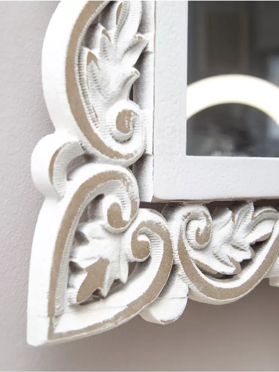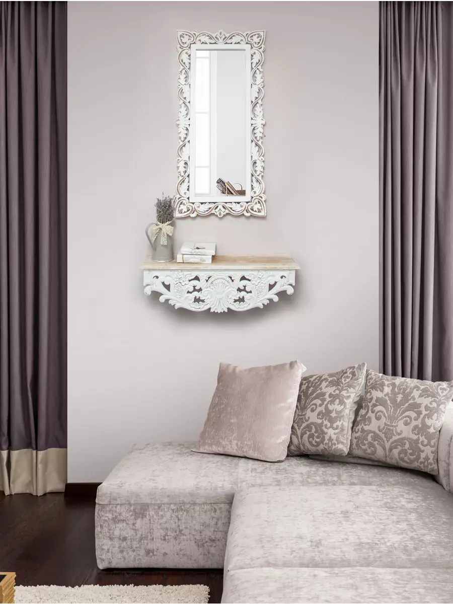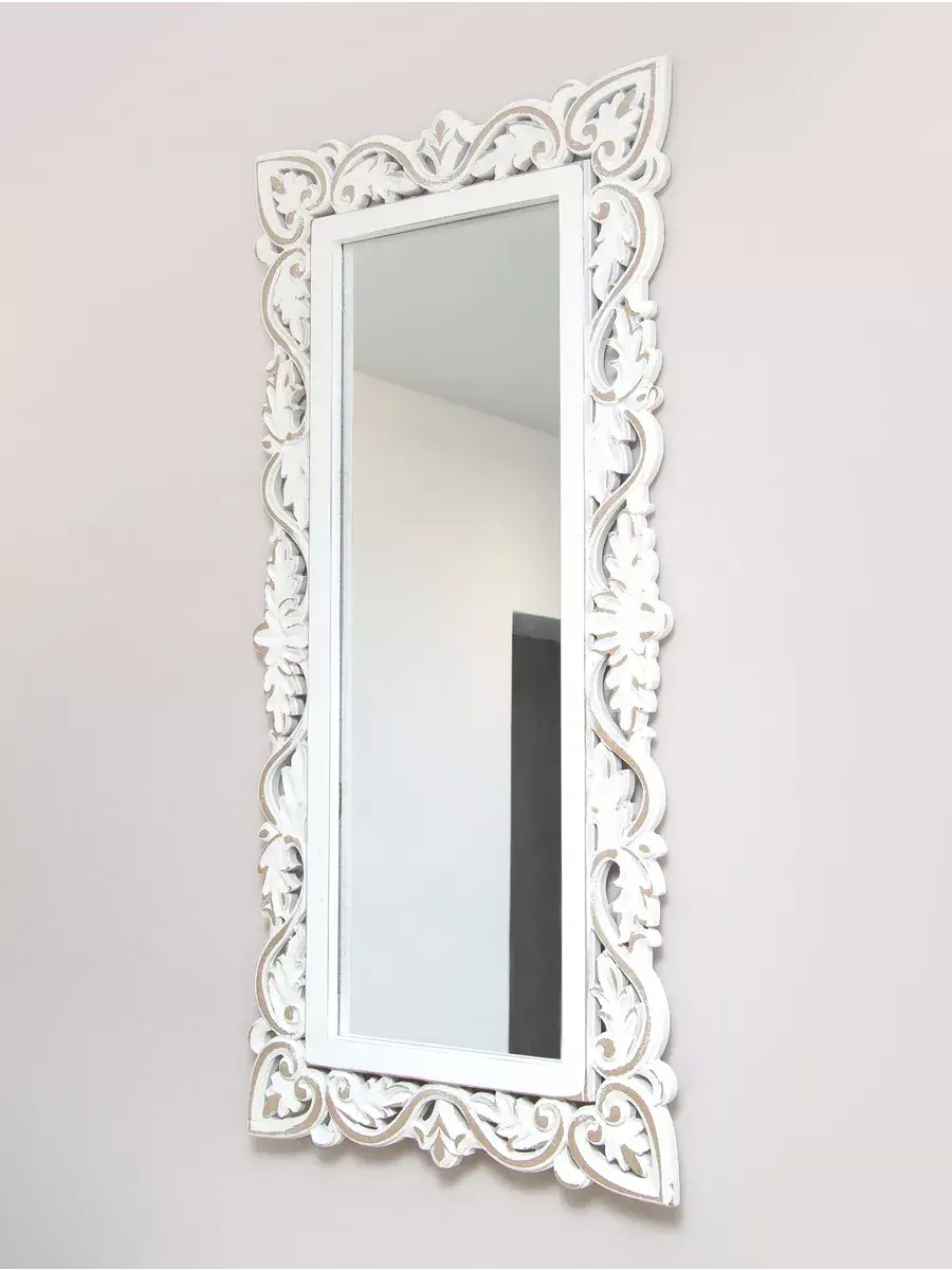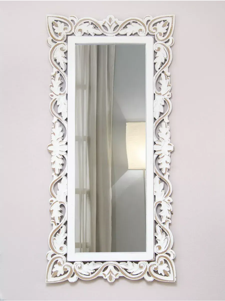 Настенное прямоугольное зеркало в резной деревянной раме. Размер зеркала 48*99 см. Винтажное прямоугольное зеркало в резной раме украшено цветочным узором, создано для изысканных интерьеров. Размер зеркального полотна . Рама окрашена с эффектом старения, подходит для интерьера в стиле Прованс, шеббишик и в этно стиле. Резьба выполнена вручную и отличается высокой детализацией. Зеркало будет прекрасным дополнением к интерьеру квартиры и дома. Зеркало добавит нотки элегантности и изысканности любой комнате. Зеркало будет хорошо смотреться как самостоятельный декор, так и в сочетании с другими элементами декора коллекции "Флоренция"