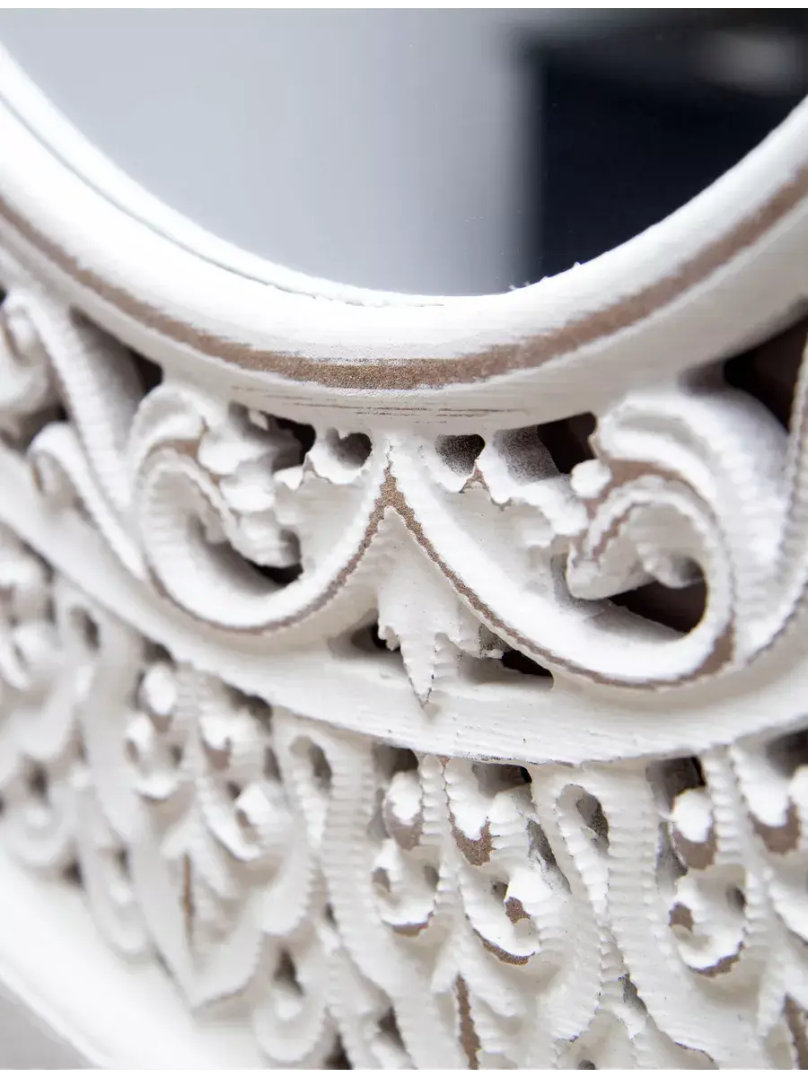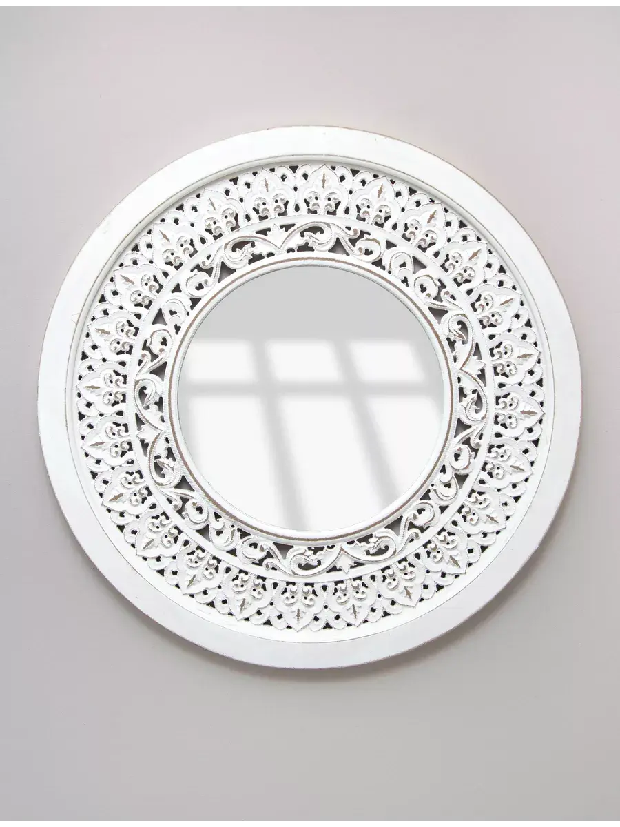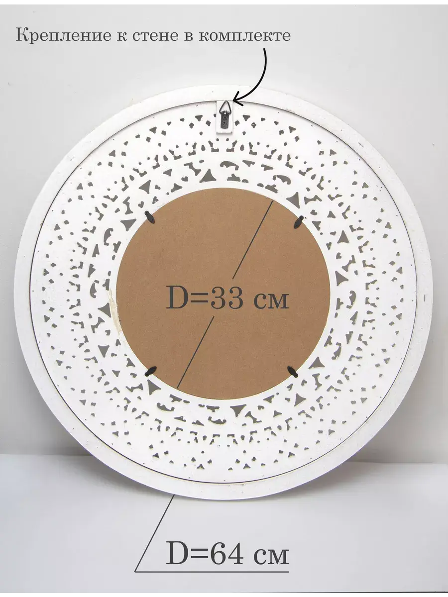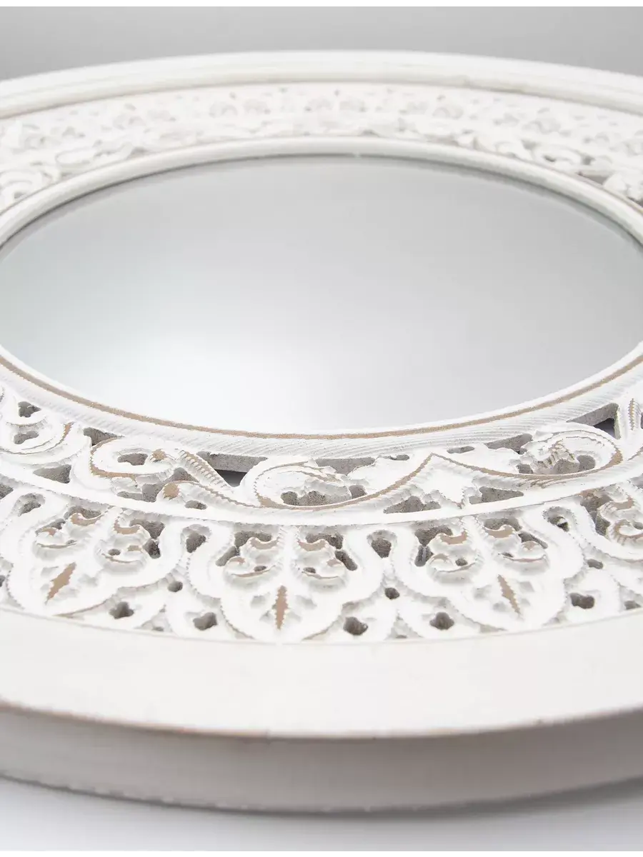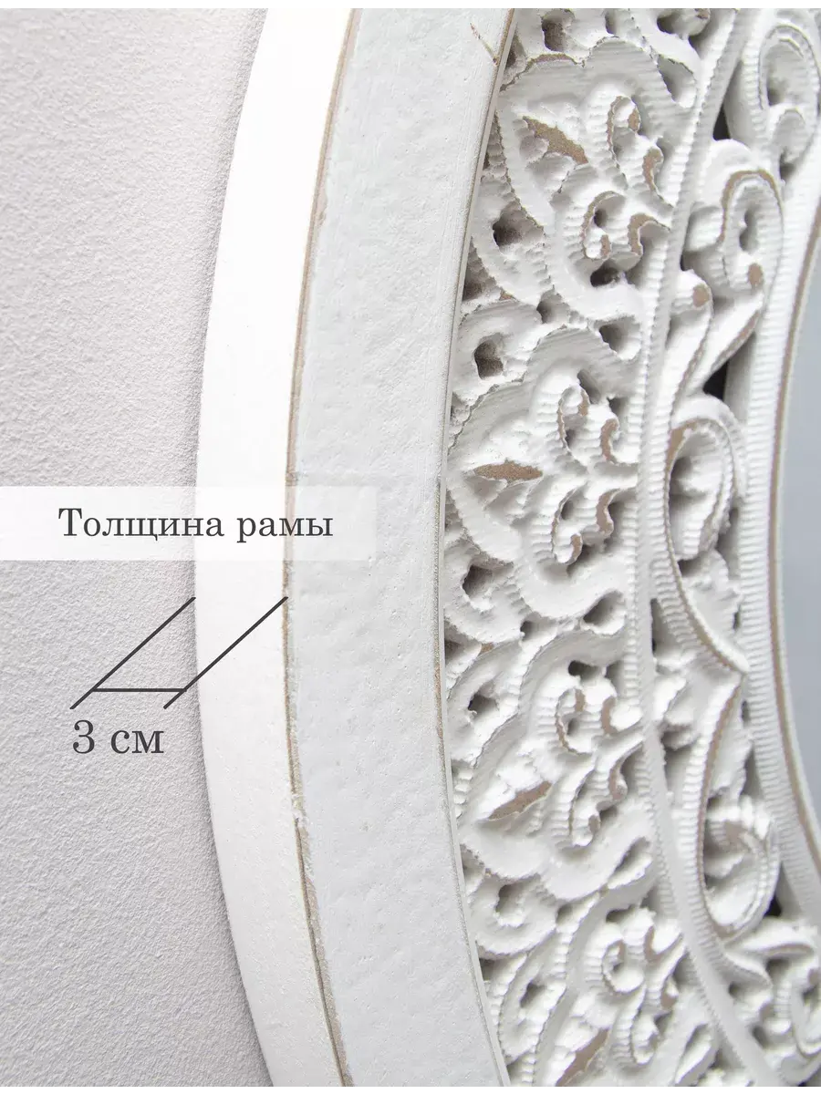 Настенное зеркало в деревянной раме. Диаметр зеркала с рамой 64 см, диаметр зеркального полотна 33 см. Прекрасно подойдет для украшения изголовья кровати. Винтажное круглое зеркало в резной раме украшено цветочным узором, создано для изысканных интерьеров. Рама окрашена с эффектом старения, подходит для интерьера в стиле Прованс, шеббишик и в этно стиле. Резьба выполнена вручную и отличается высокой детализацией. Зеркало будет прекрасным дополнением к интерьеру квартиры и дома. Зеркало добавит нотки элегантности и изысканности любой комнате. Зеркало будет хорошо смотреться как самостоятельный декор, так и в сочетании с другими элементами декора коллекции "Флоренция"