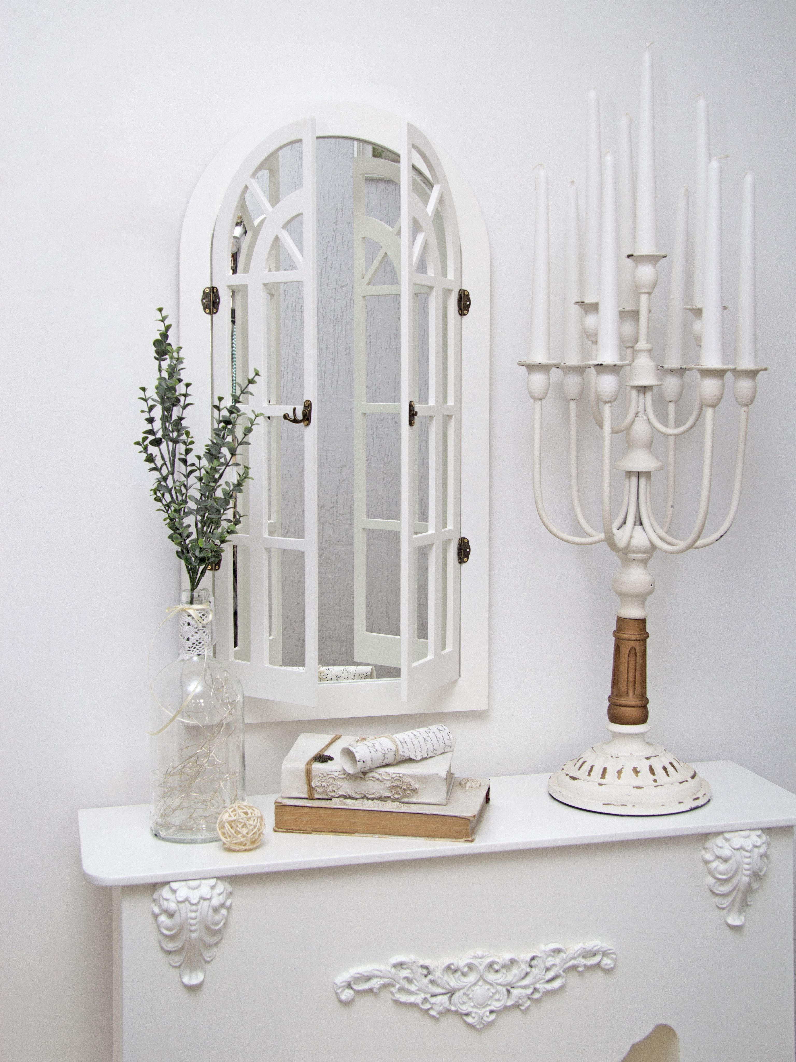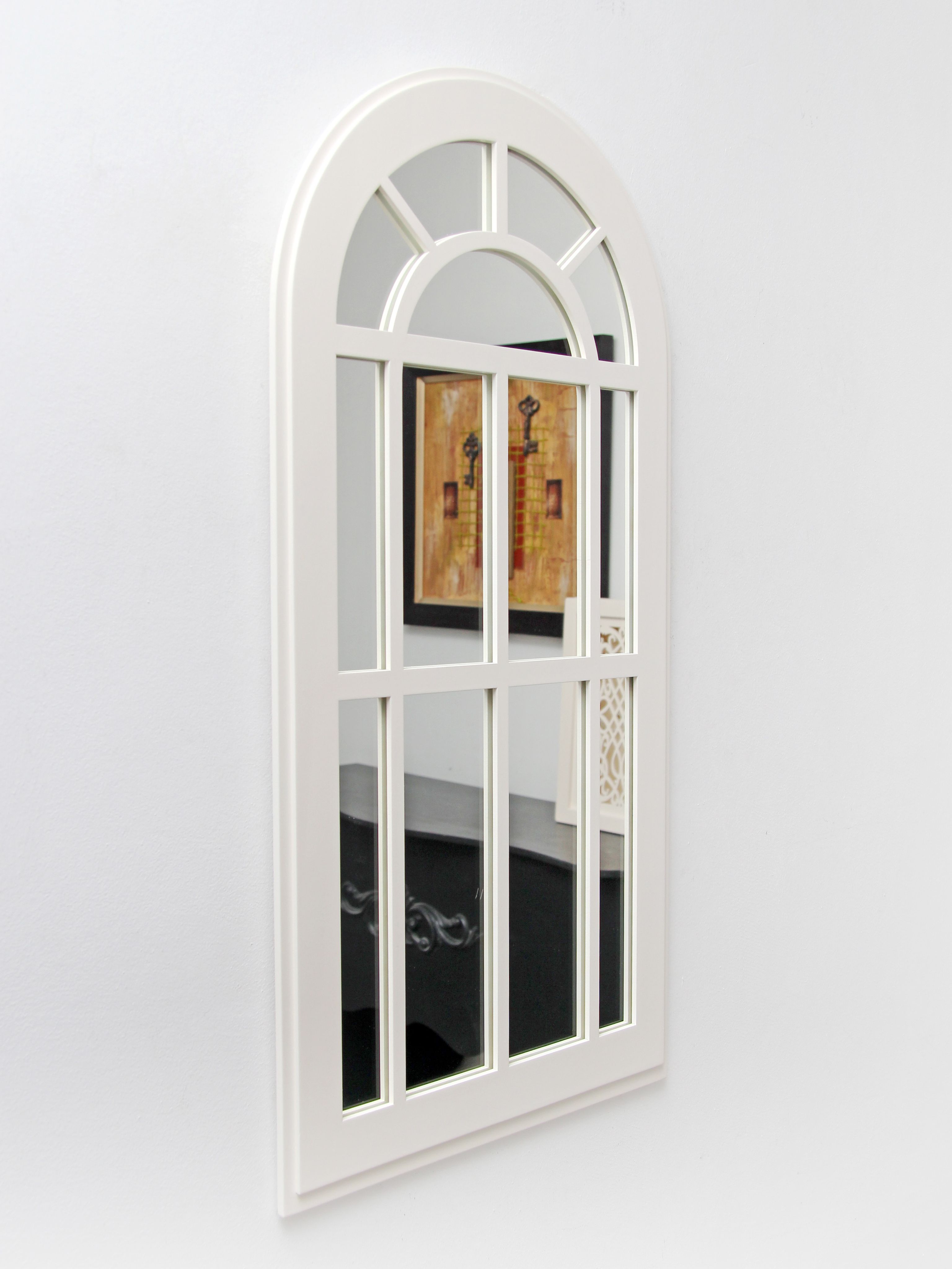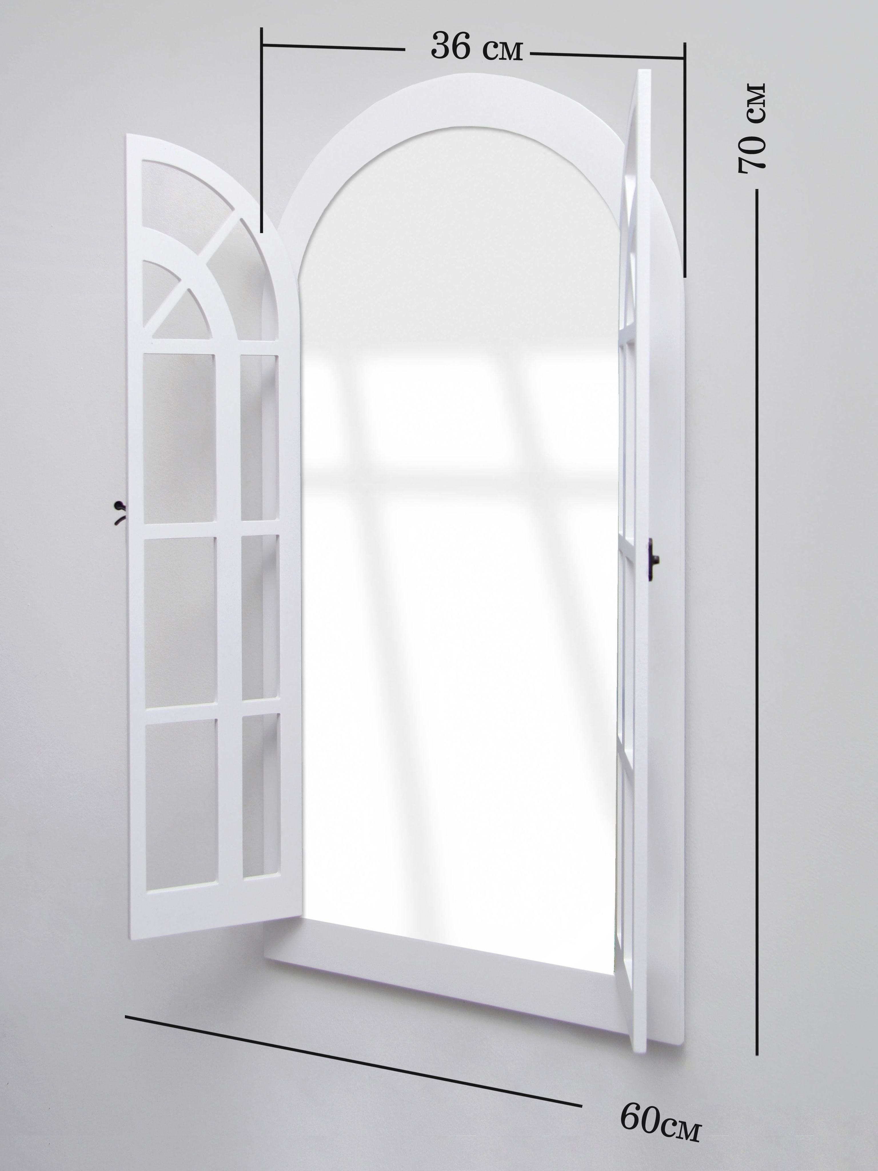 Зеркальный декор на стену в форме окна. Размер зеркального панно 77х43 см. Вставки из натурального зеркала. Интерьерное зеркало будет прекрасным дополнением к настенному декору. Рама зеркала покрашена акриловой эмалью на водной основе. Подойдет для оформления интерьера в стиле прованс, добавит света и пространства в интерьере. На обратной стороне зеркала две петли, шурупы для крепления на стену в комплекте