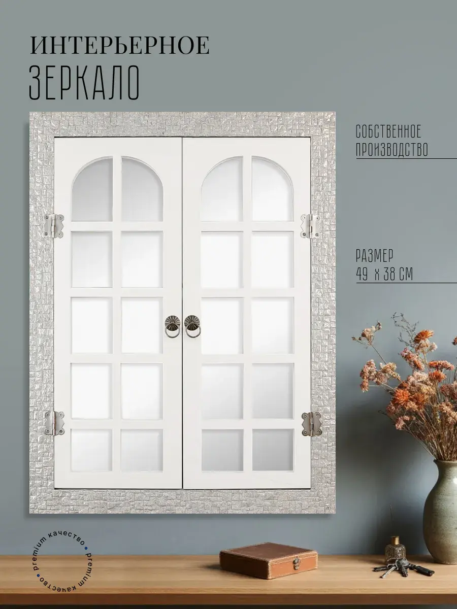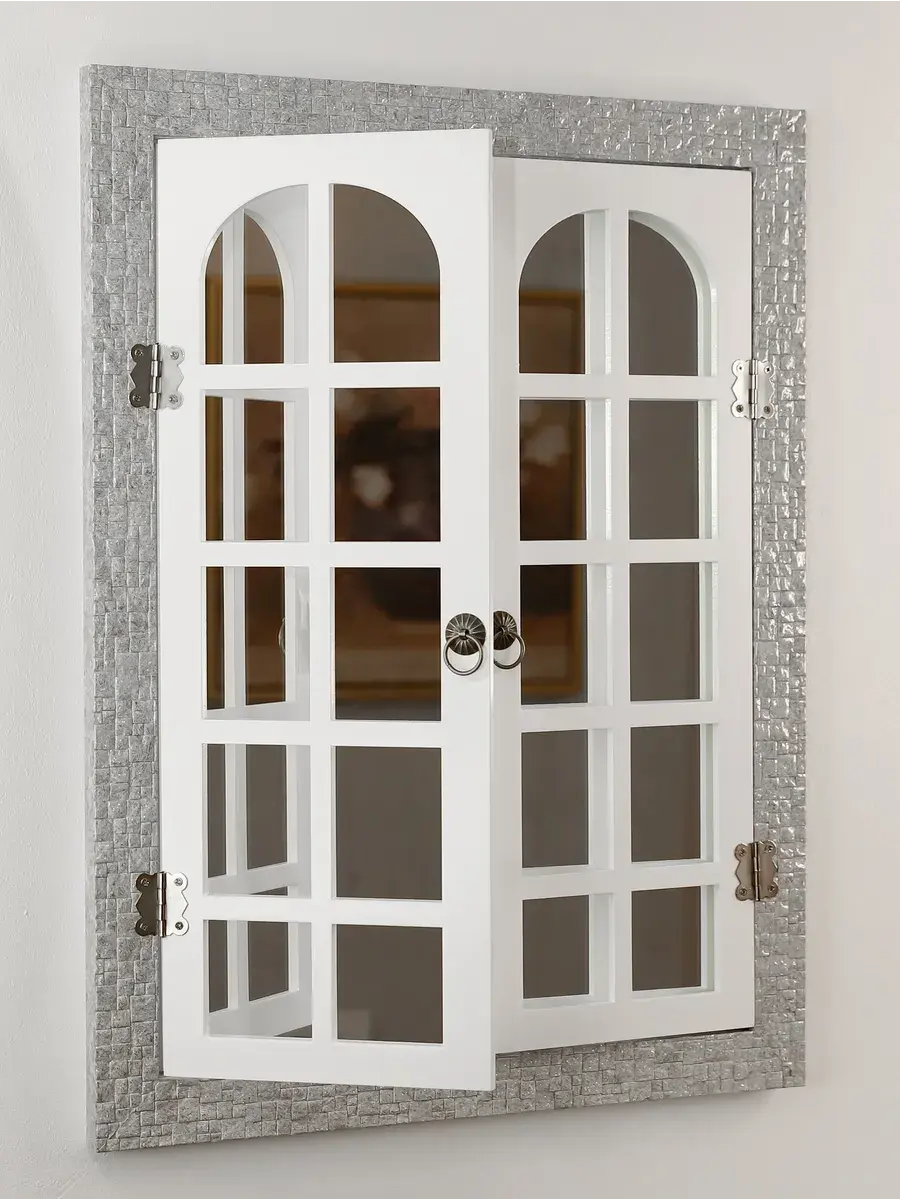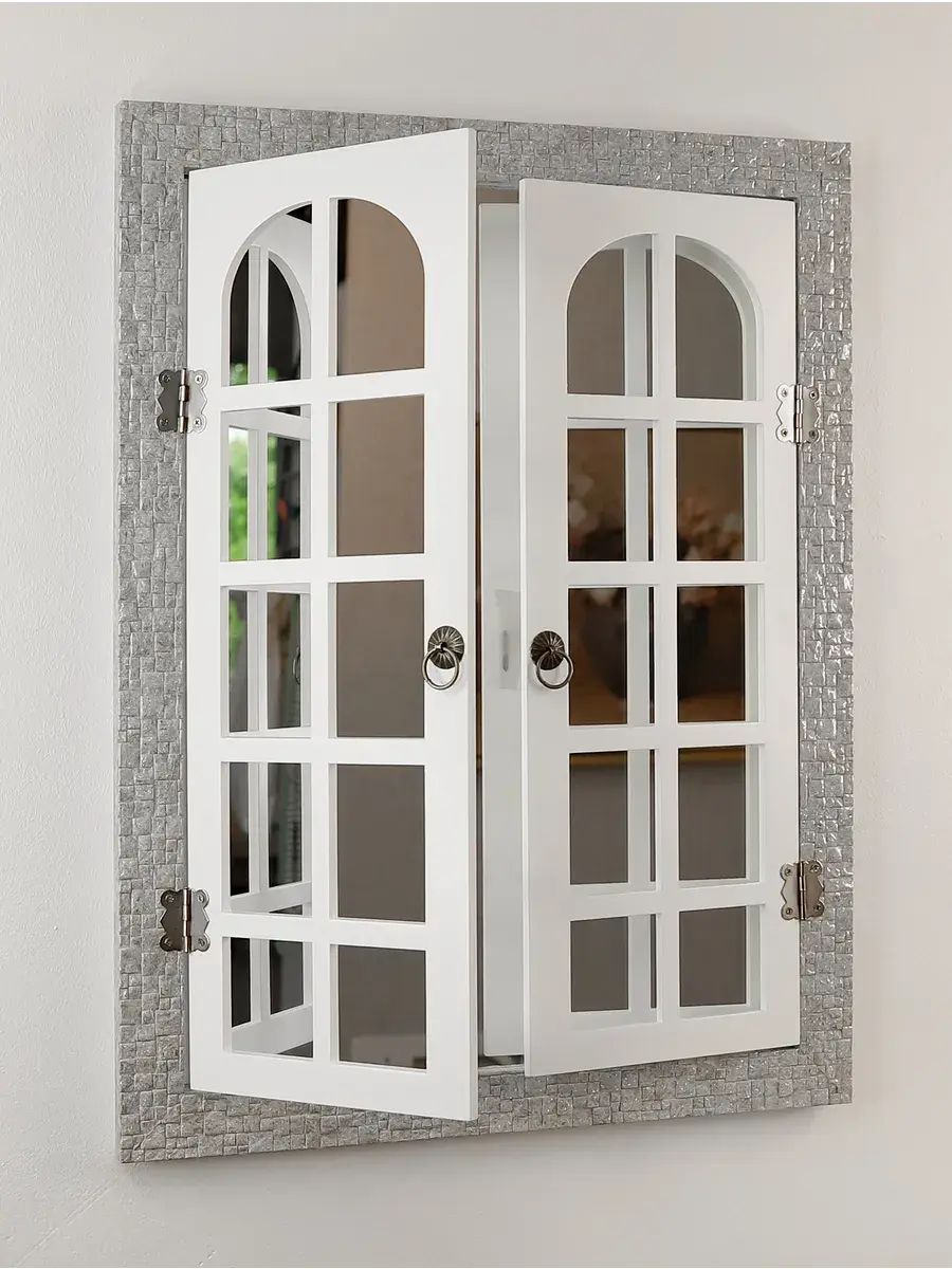 Рама из полиуретана, а ставни изготовлены из мдф 6мм, покрашены акриловой эмалью на водной основе. Зеркало натуральное, без искажения. Размер 38*49 см, в развернутом виде 49х62 см. Крепление для стены в комплекте.