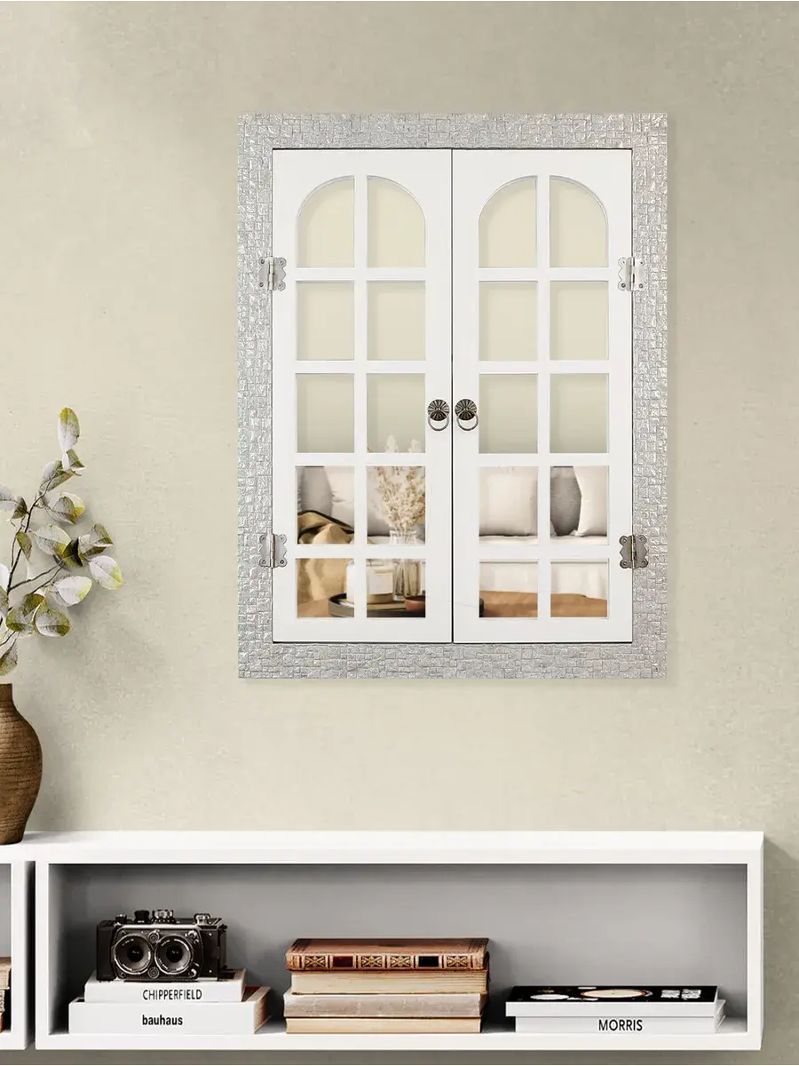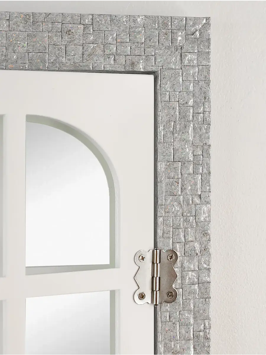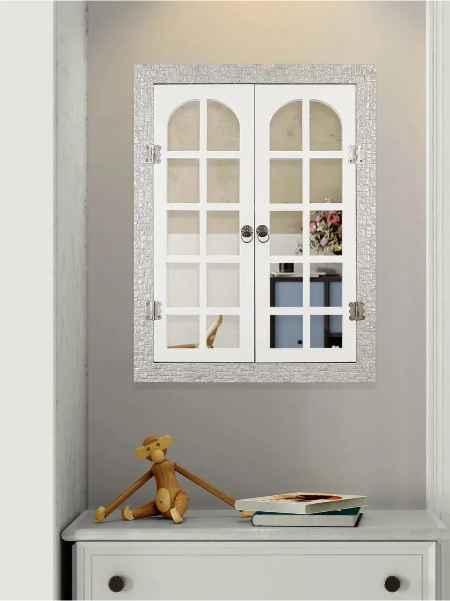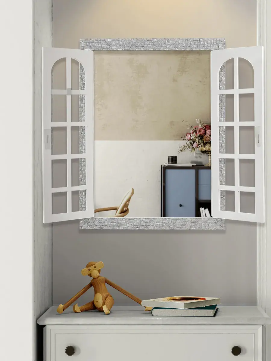 Рама из полиуретана, а ставни изготовлены из мдф 6мм, покрашены акриловой эмалью на водной основе. Зеркало натуральное, без искажения. Размер 38*49 см, в развернутом виде 49х62 см. Крепление для стены в комплекте.