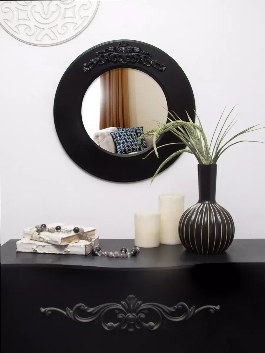 Зеркало интерьерное в широкой деревянной раме с лепниной. Настенное круглое зеркало в рамe станет стильным акцентом в вашем интерьере. Оно идеально подходит для спальни или других помещений, добавляя нотку элегантности и света. Декоративное зеркало можно разместить на стене над туалетным столиком. Это практичное решение для любителей красивого оформления пространства, вдохновленного идеями из Pinterest. Оснащено надежным креплением, что обеспечивает легкость установки и надежность в эксплуатации.