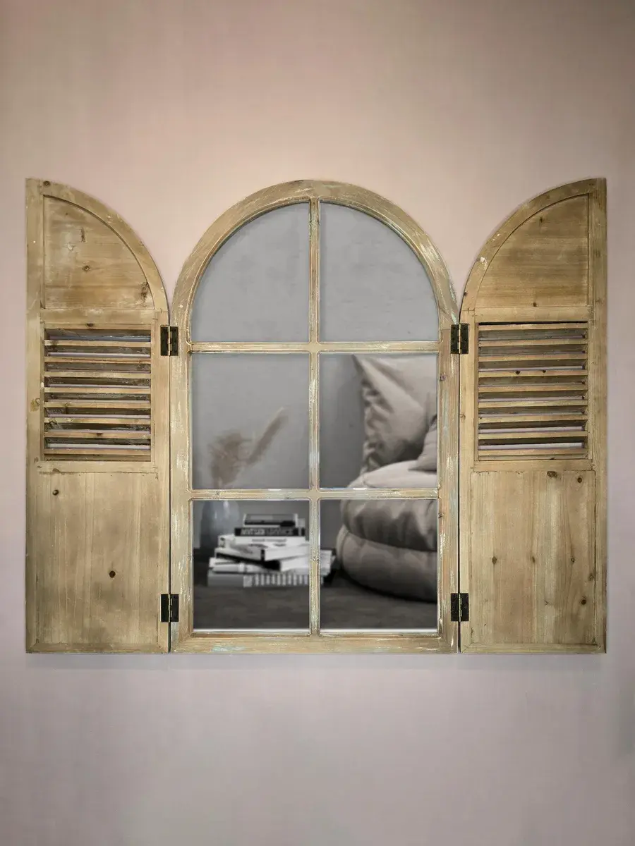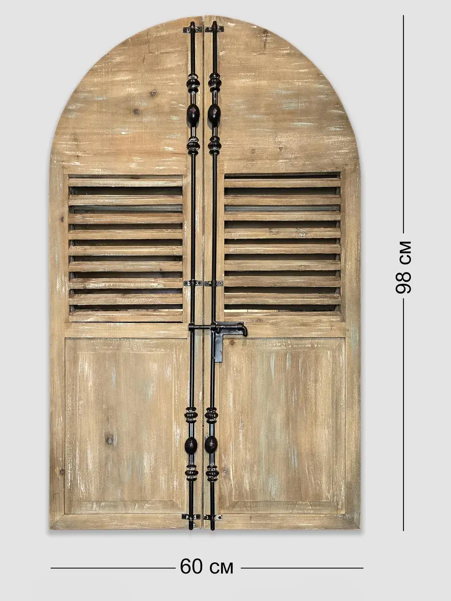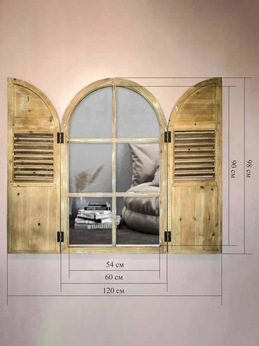 Настенный декор изготовлен из МДФ 12 мм., вставки из зеркала 4мм не искажает изображение, размер зеркала в раме 98х60 см, с открытыми ставнями. Рама зеркала широкая, не покрашена. На обратной стороне зеркала две петли, шурупы для крепления на стену в комплекте.