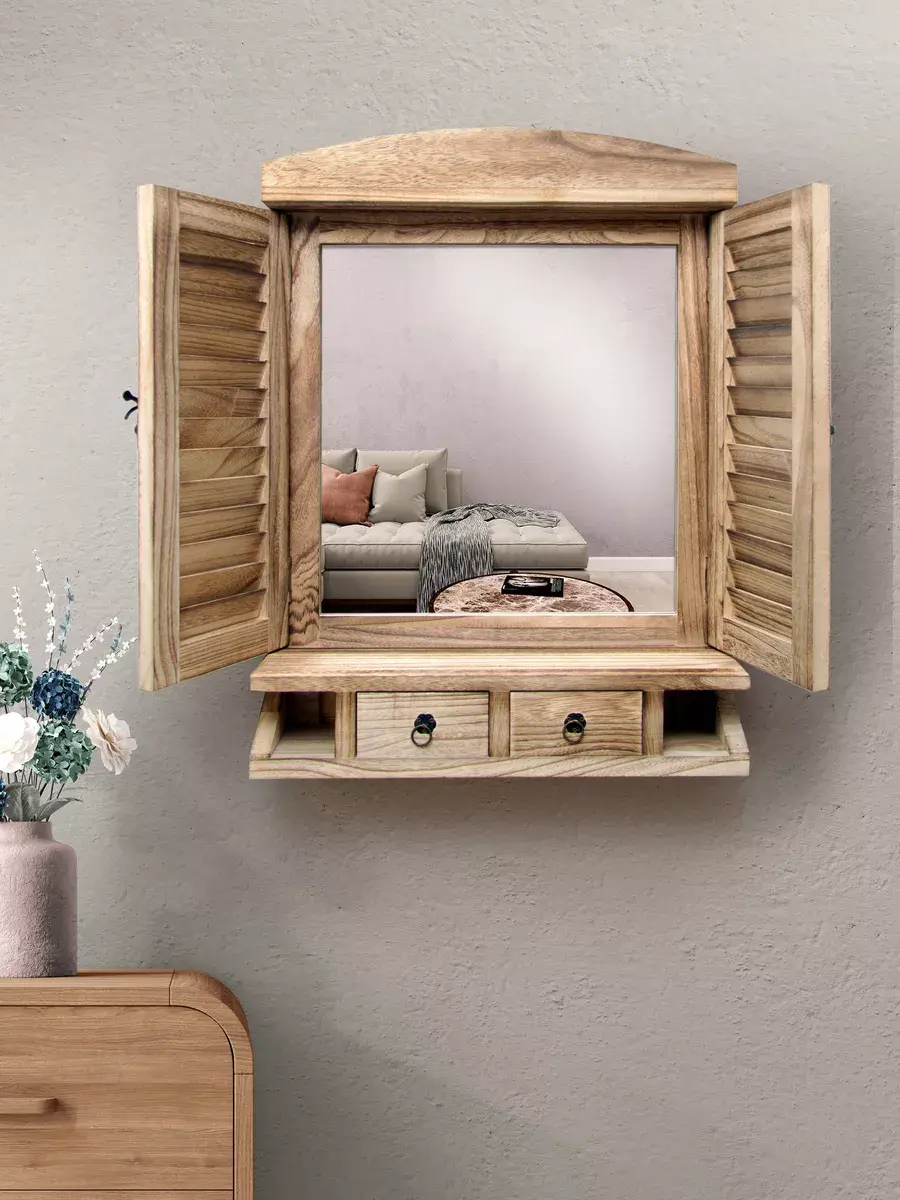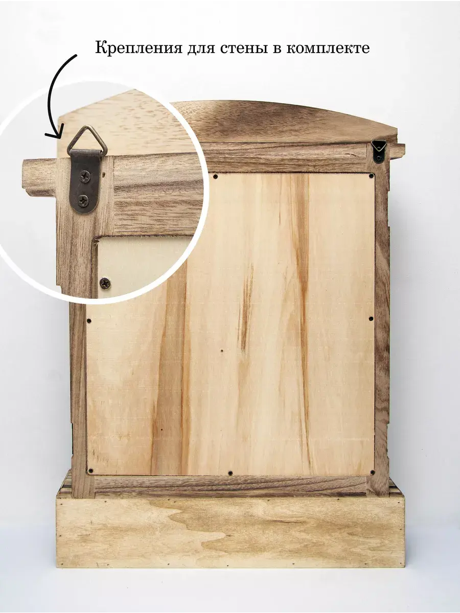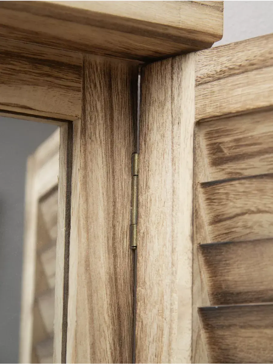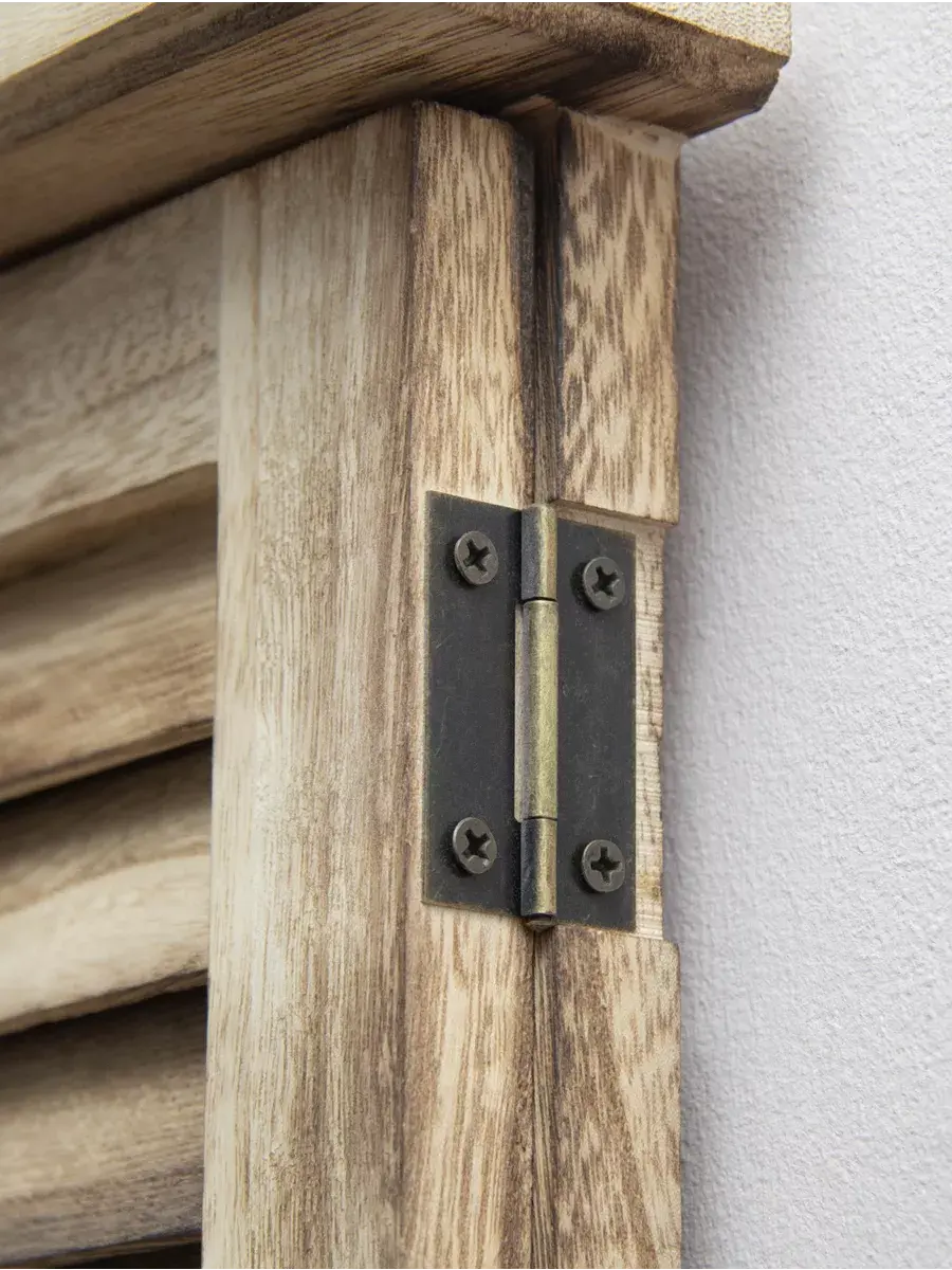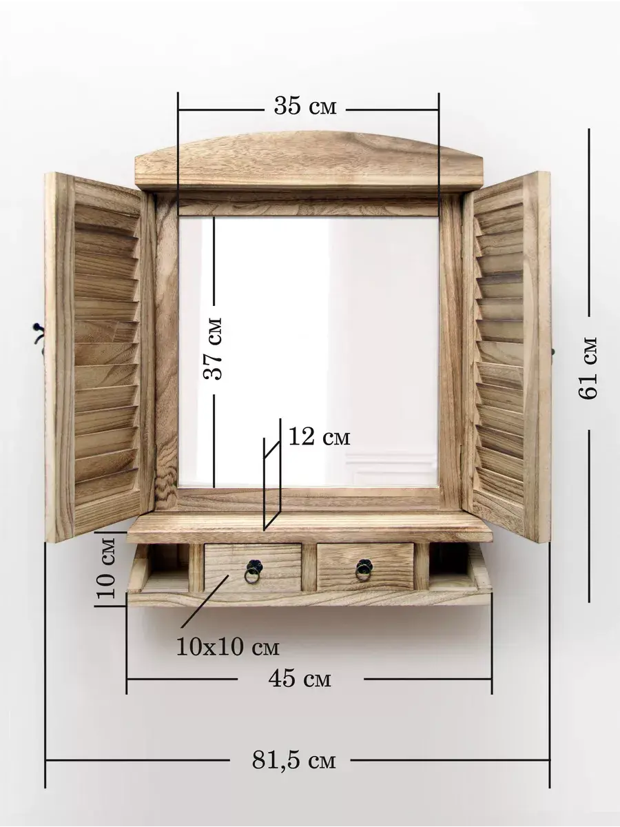 Настенный декор изготовлен из МДФ 12 мм., вставки из зеркала 4мм не искажает изображение, размер зеркала в раме 61х35 см, с открытыми ставнями. Рама зеркала широкая, не покрашена. На обратной стороне зеркала две петли, шурупы для крепления на стену в комплекте.