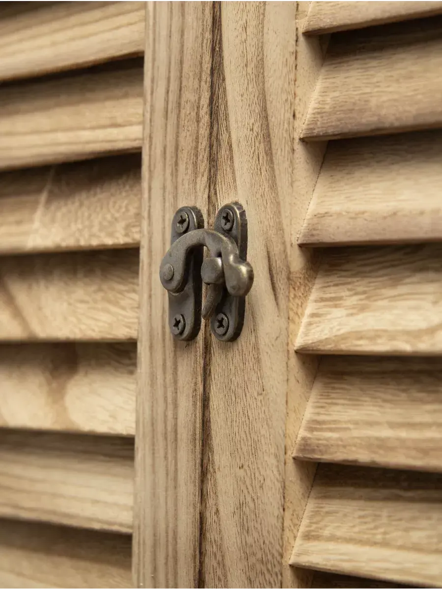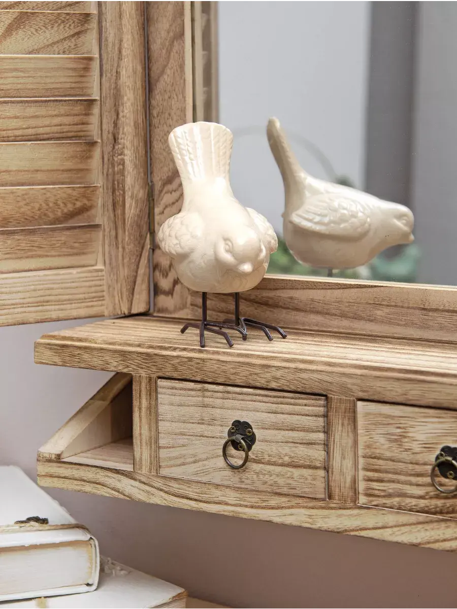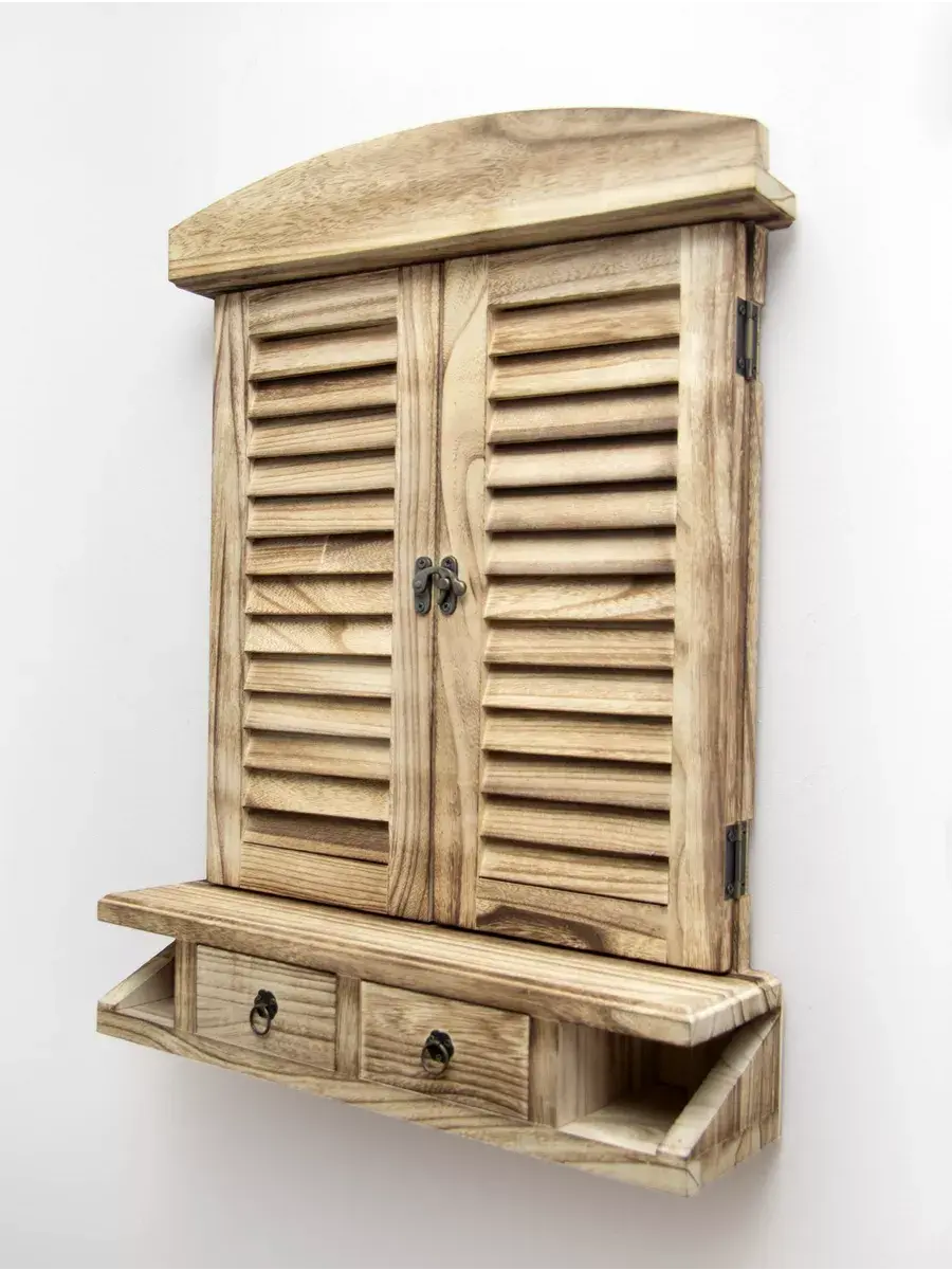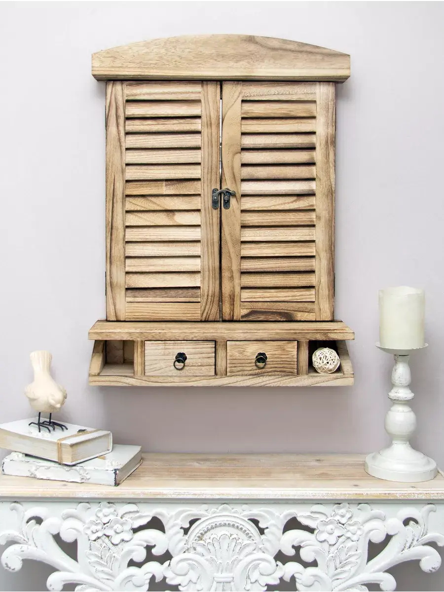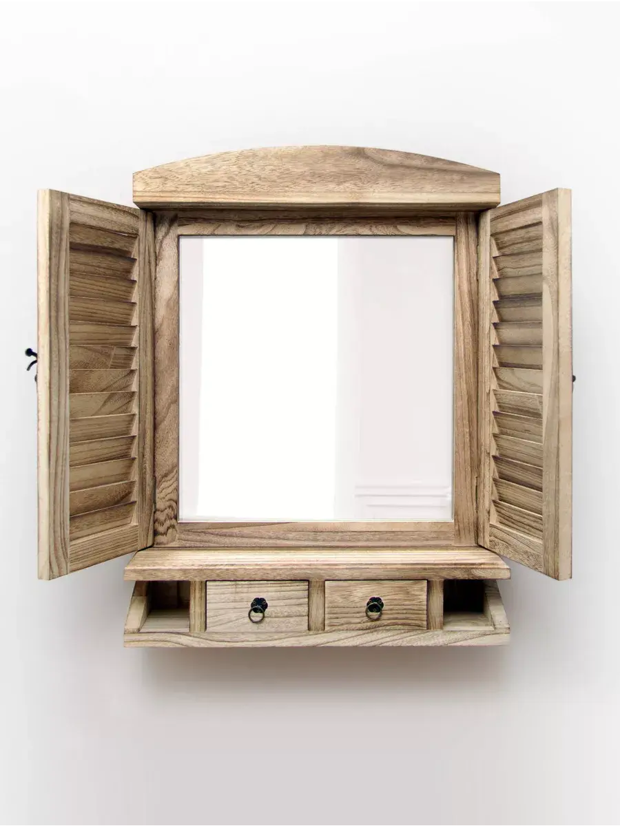 Настенный декор изготовлен из МДФ 12 мм., вставки из зеркала 4мм не искажает изображение, размер зеркала в раме 61х35 см, с открытыми ставнями. Рама зеркала широкая, не покрашена. На обратной стороне зеркала две петли, шурупы для крепления на стену в комплекте.