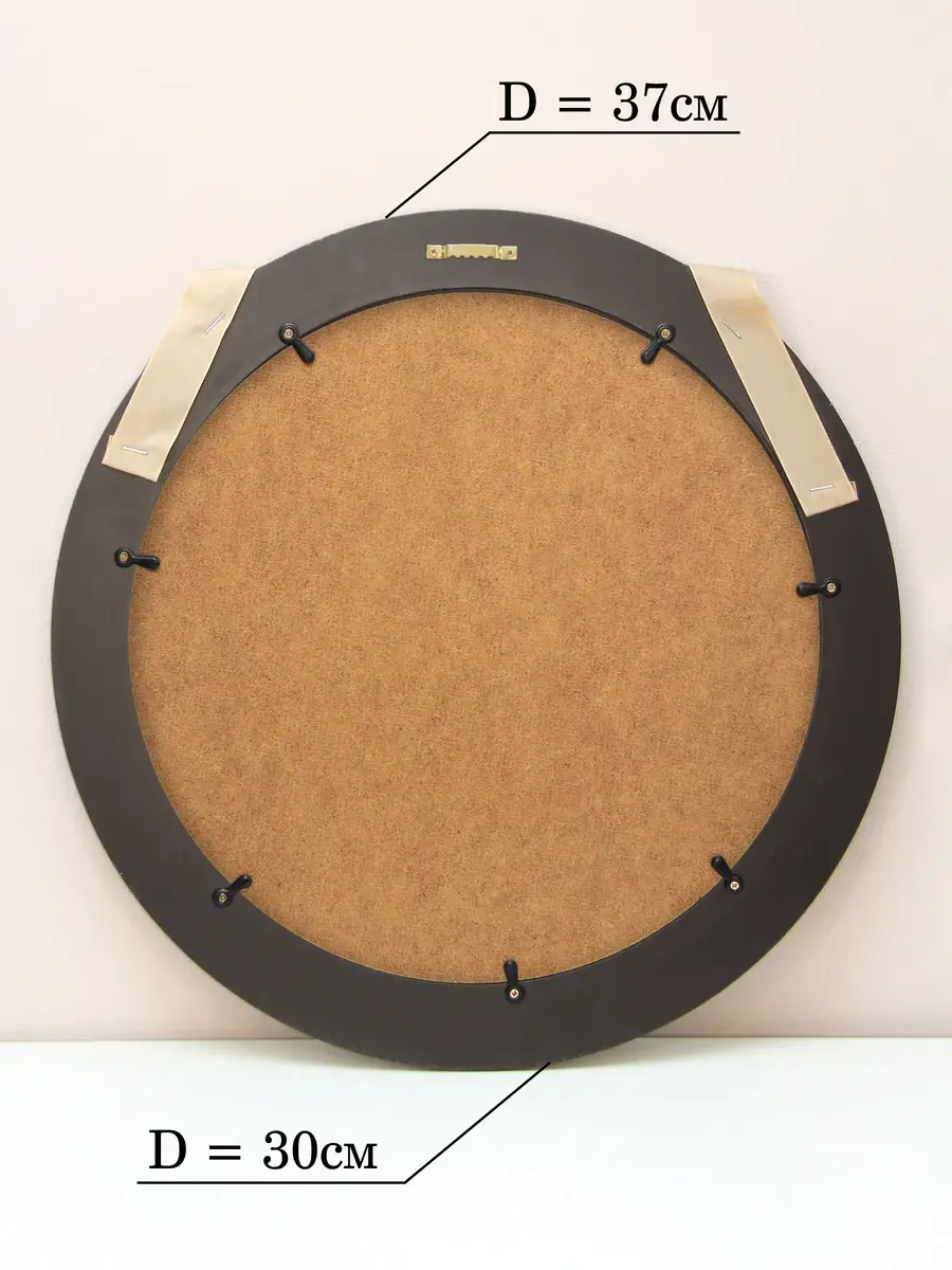 Диаметр зеркального полотна 30 см, диаметр зеркала в раме 37 см. Рама изготовлена из МДФ 16 мм, окрашена акриловой эмалью на водной основе (легко перекрашивается в любой цвет). Рама цельная, не имеет стыков и зазоров, что исключает повреждения при транспортировке. Крепление для стены в комплекте.