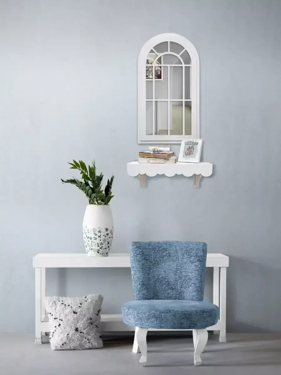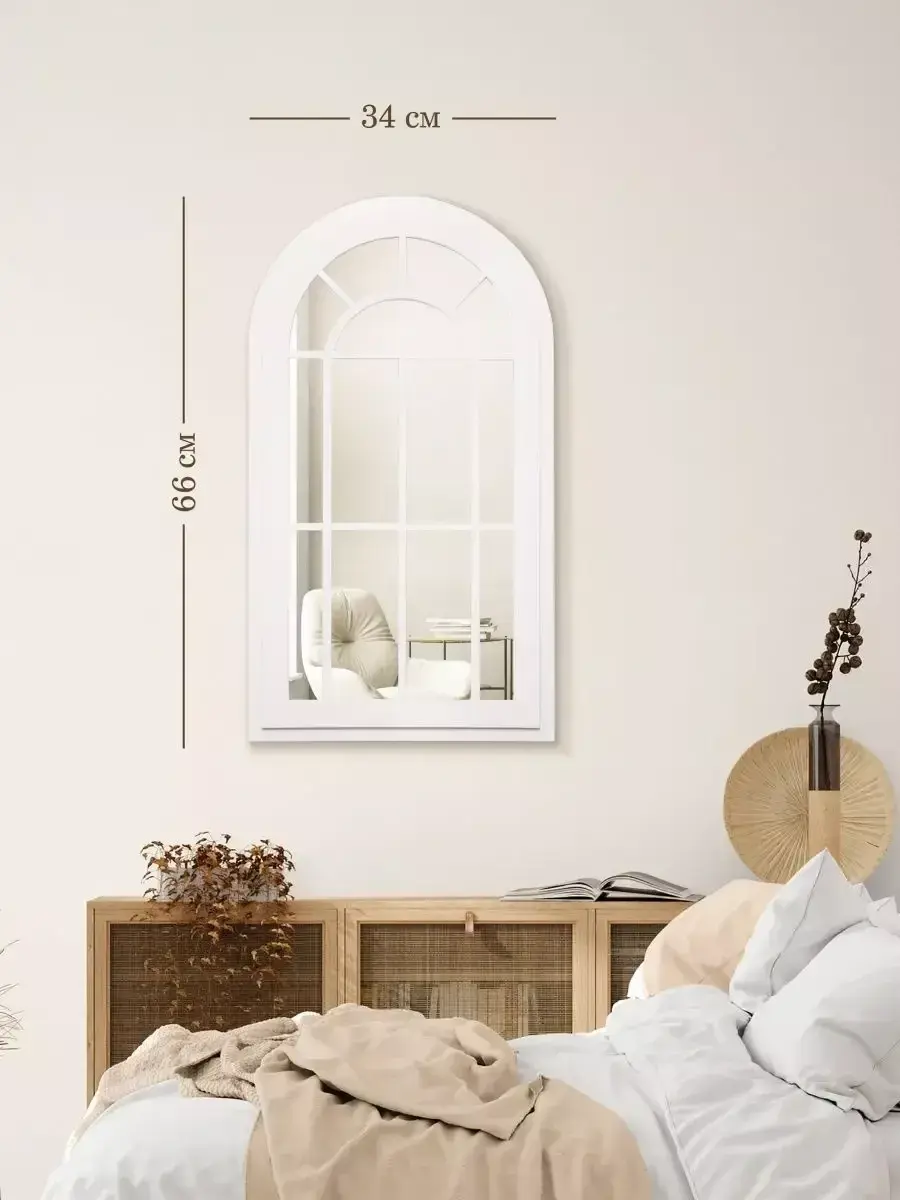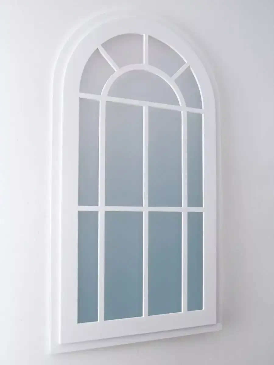 Зеркало-арка "Прованс". Современный зеркальный декор можно повесить стену в спальной или гостиной комнатах, так-же фальш-окно в форме арки прекрасно будет смотреться на комоде или над диваном. Настенный декор изготовлен из МДФ 12 мм.,вставки из зеркала 4мм не искажает изображение, размер зеркала в раме 66х34 см. Рама зеркала широкая, покрашена акриловой эмалью на водной основе. Подойдет для оформления интерьера в стиле прованс, кантри, шеббишик, добавит света и пространства в интерьере. На обратной стороне зеркала две петли, шурупы для крепления на стену в комплекте.