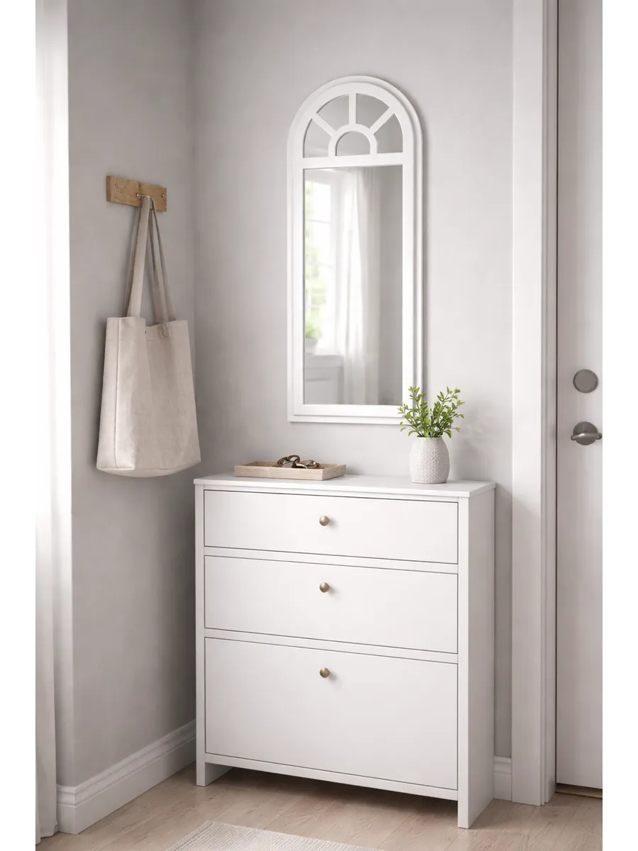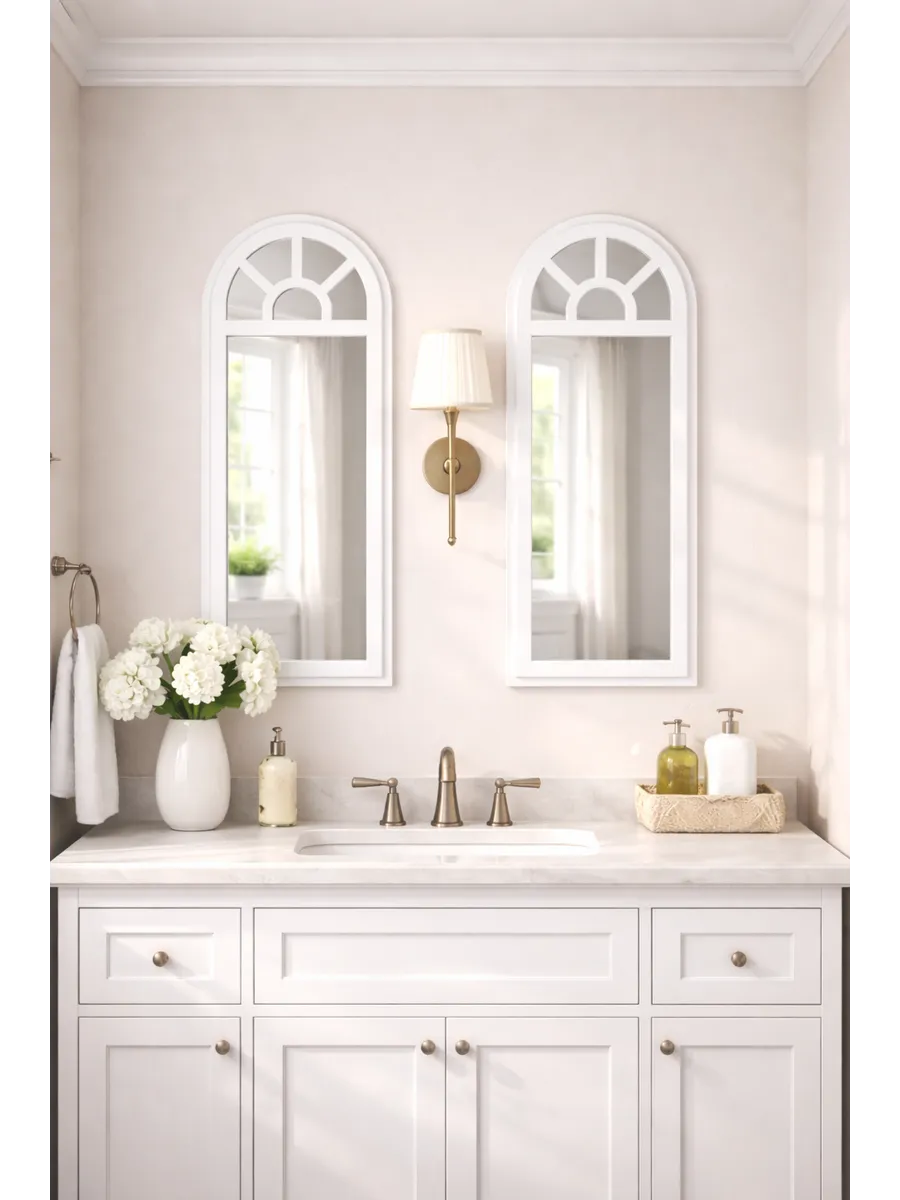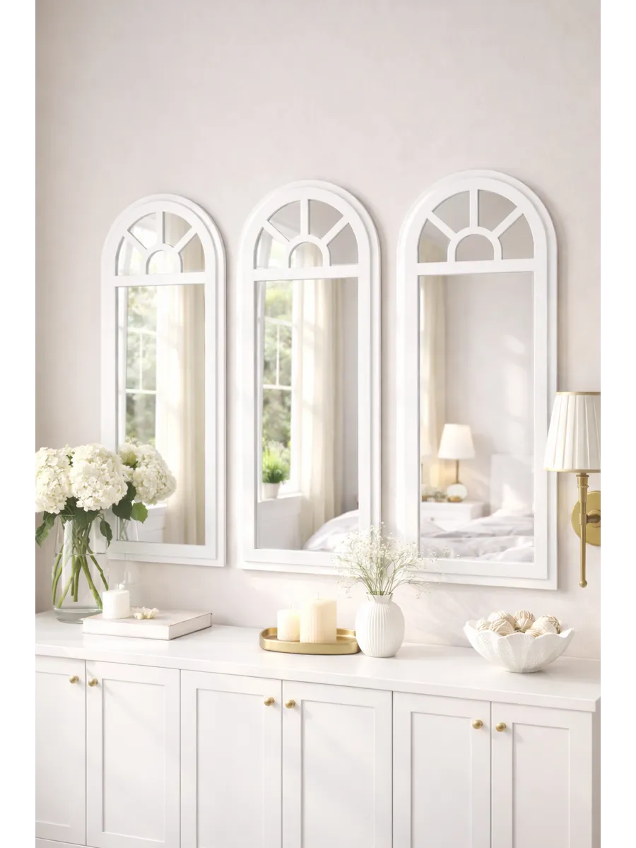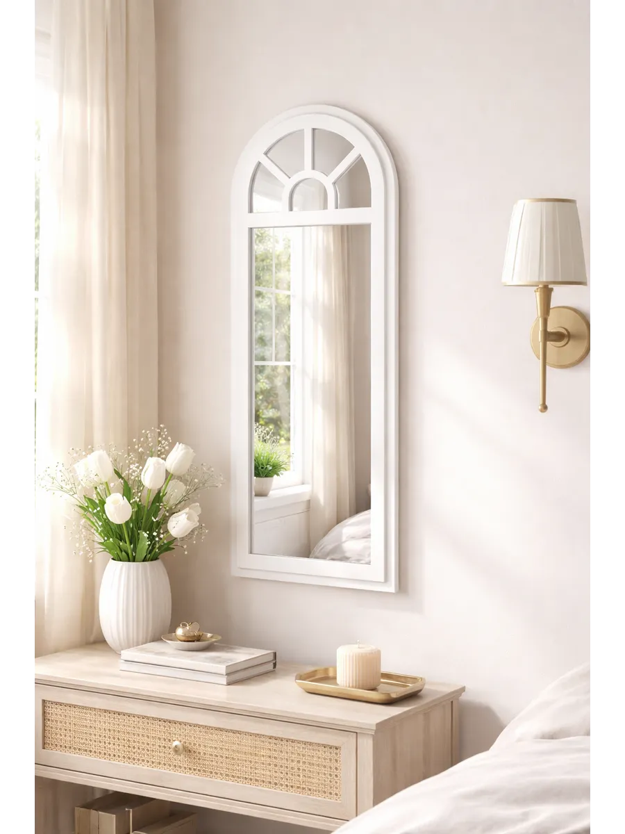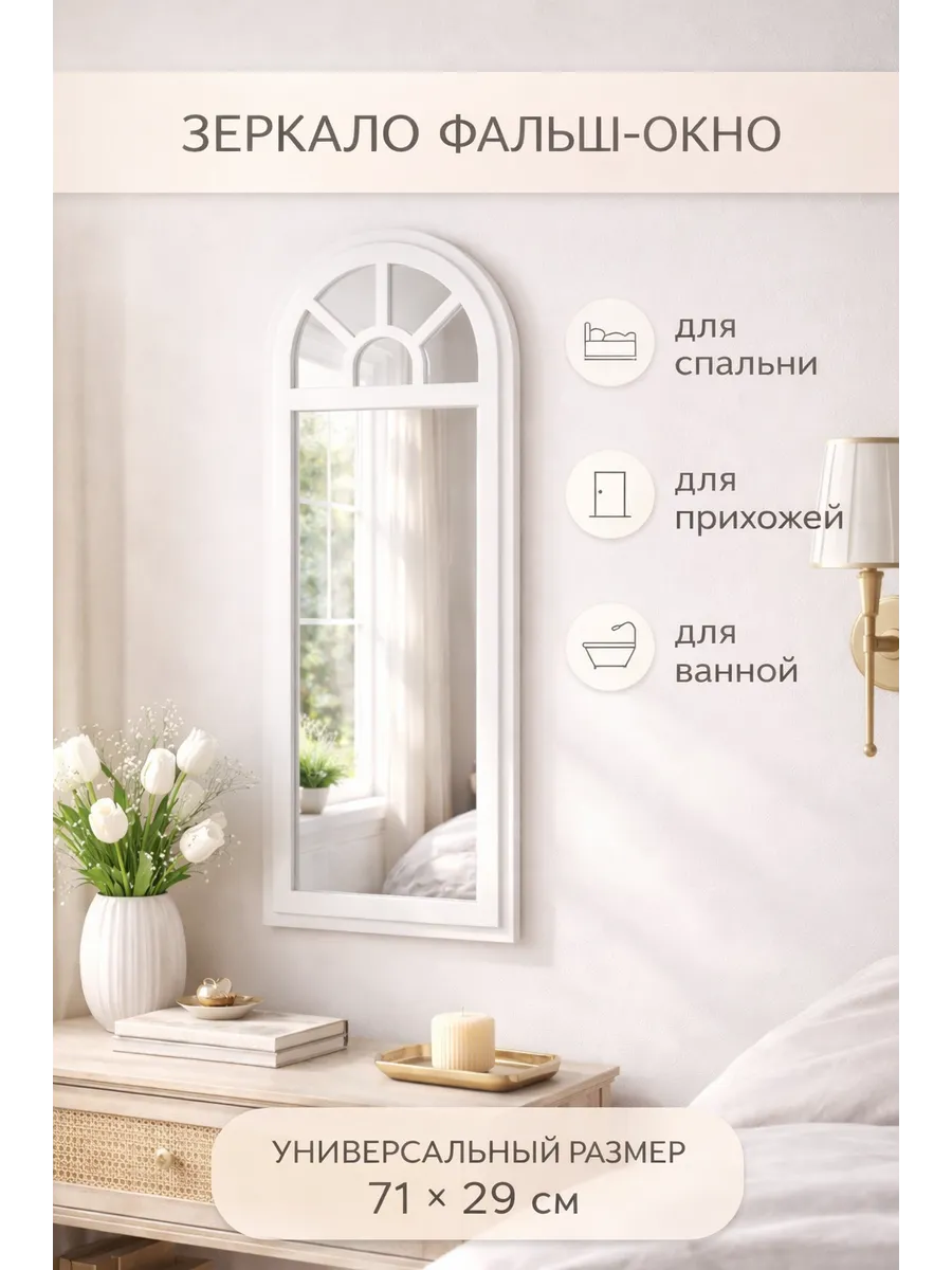 Декоративное зеркало фальш-окно — это стильный элемент интерьера, который делает пространство светлее, визуально расширяет комнату и добавляет ощущение уюта. Благодаря изящной арочной форме и оконной раскладке зеркало выглядит как настоящее окно и становится эффектным акцентом на стене.