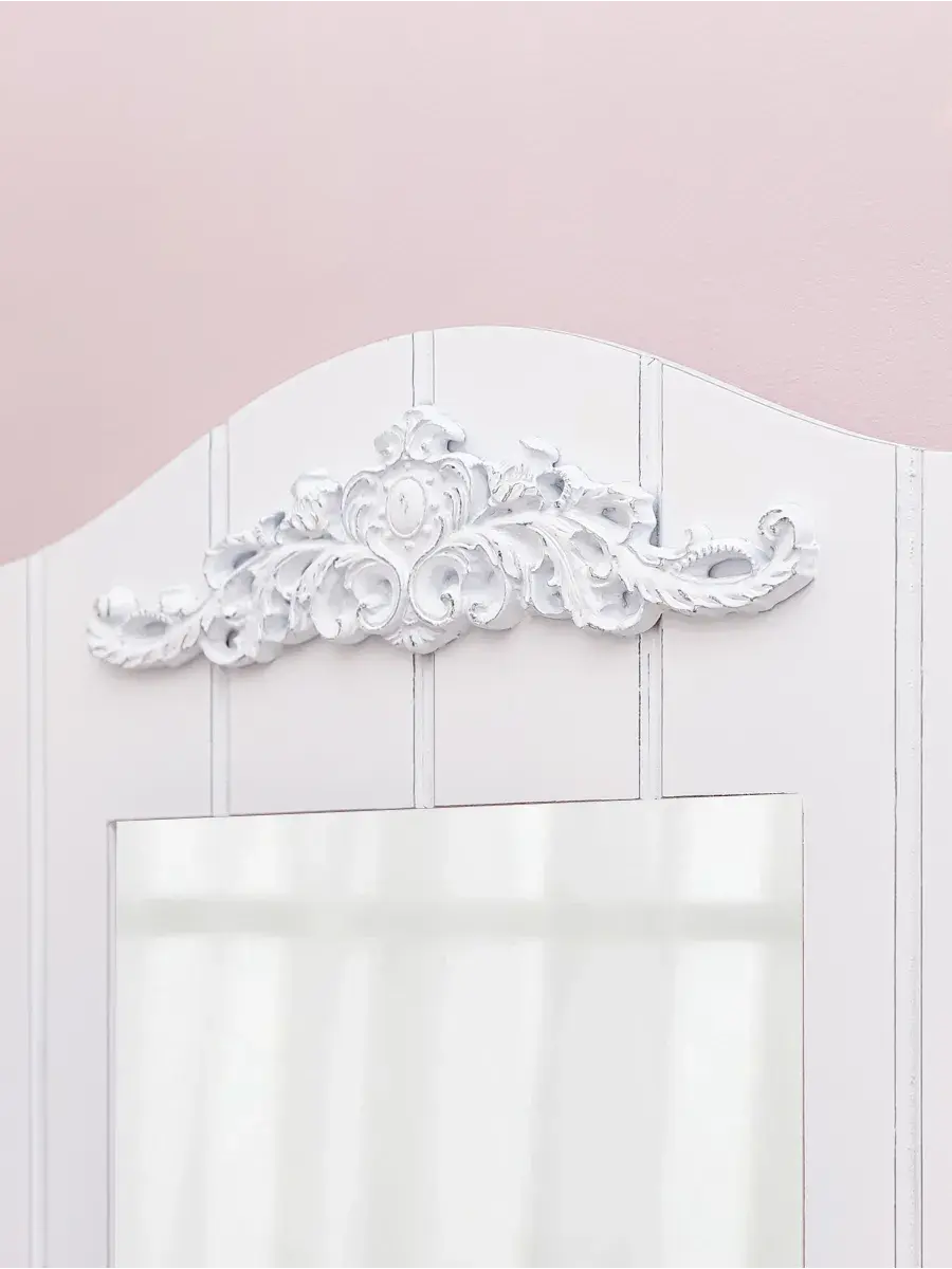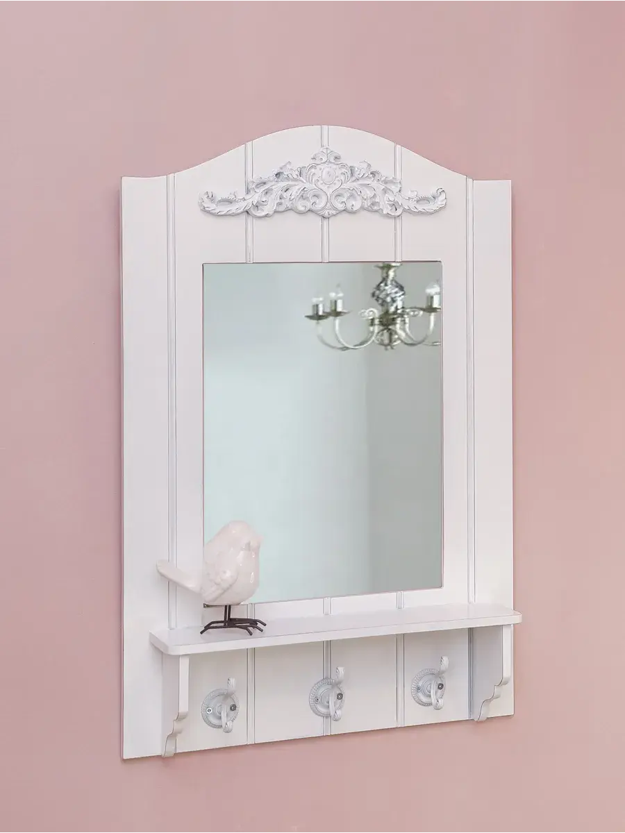 Зеркало настенное с полкой в стиле Прованс. Зеркало в широкой раме дополнено полкой глубиной 10см и тремя крючками. Лепнина с серебром. Рама из МДФ 10 мм окрашена акриловой эмалью без запаха. Настенное зеркало подойдет для ванной комнаты или спальни. Размер зеркала 68х45,5 см, зеркальное полотно 36х28 см. Крепление для стены в комплекте.